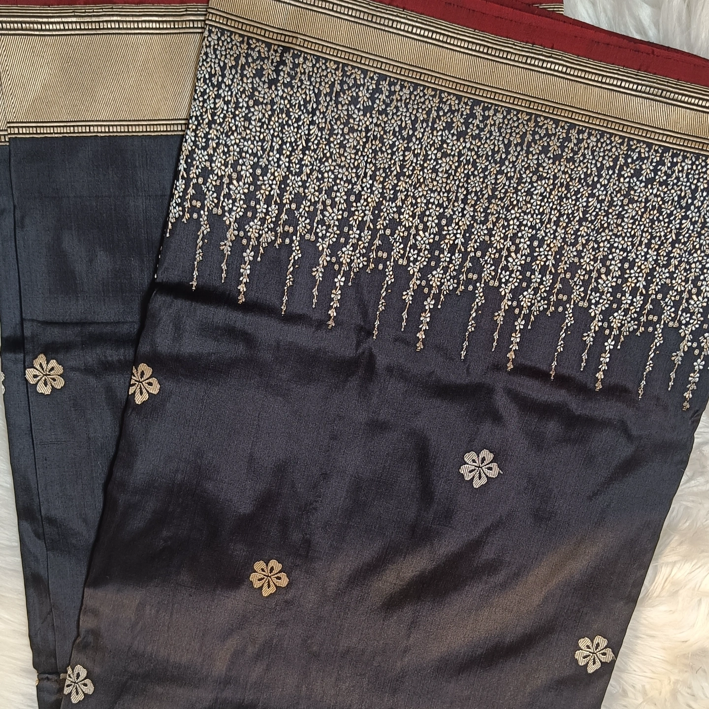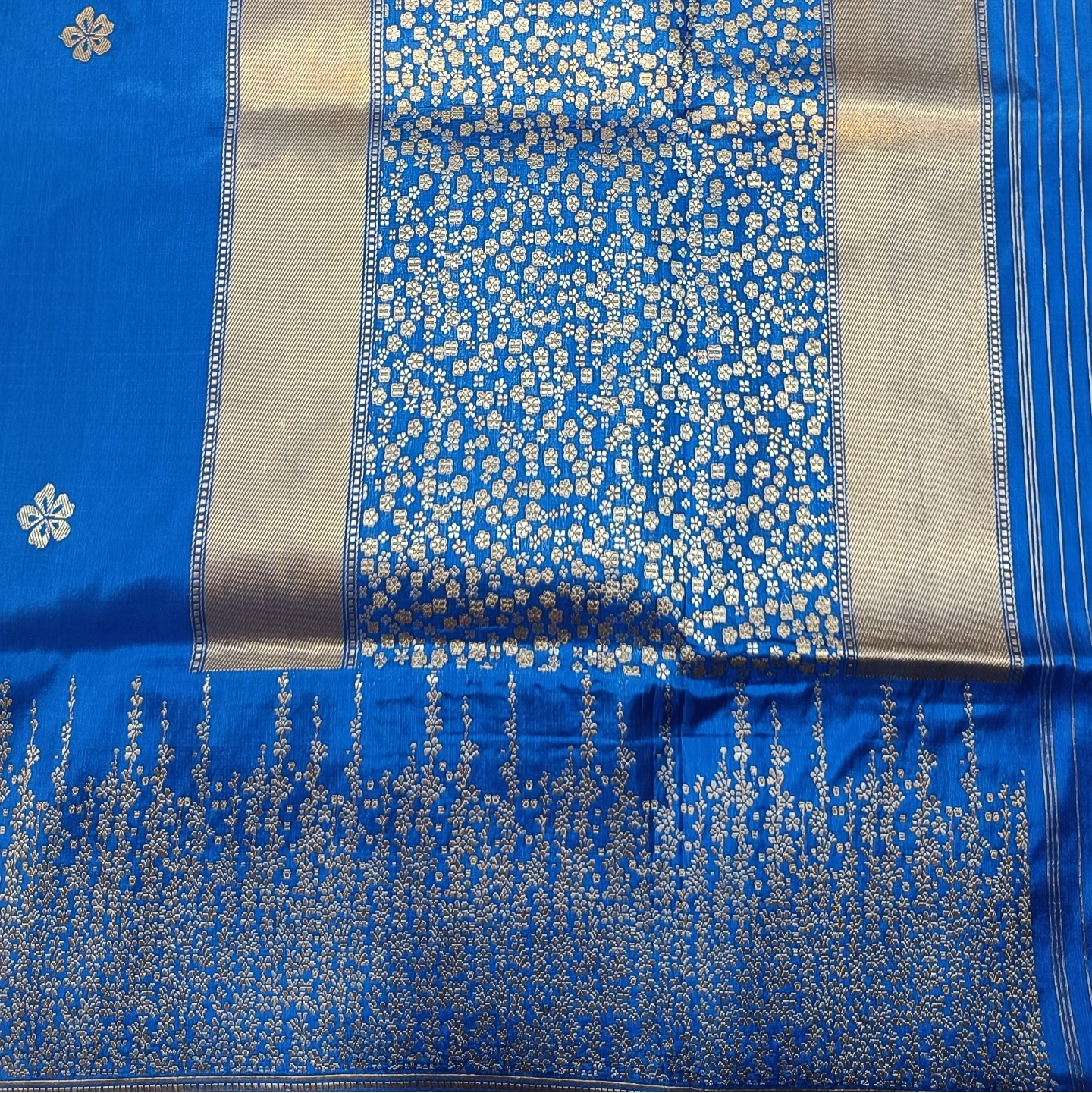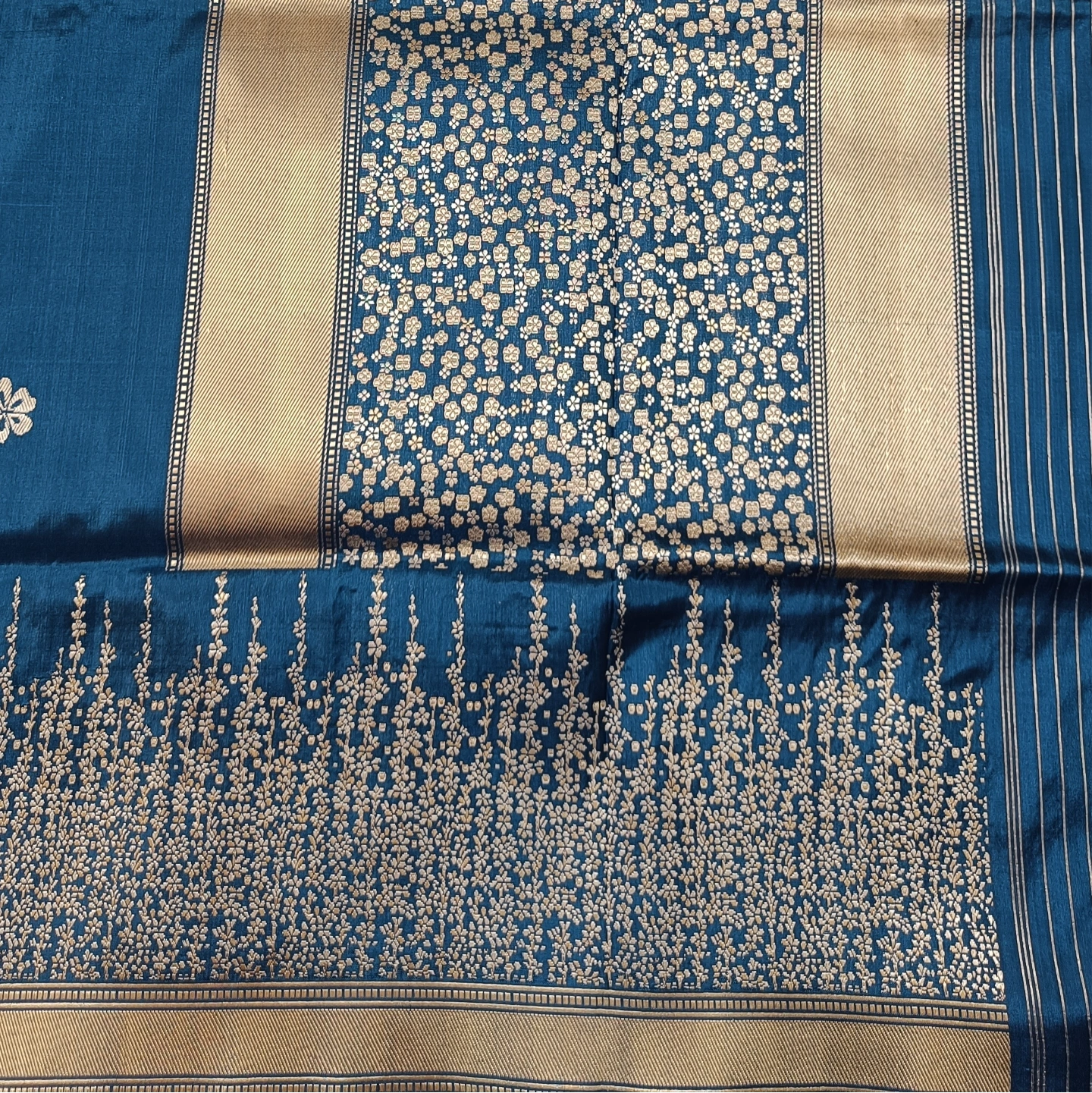 The 4-Ply Alfi Katan Kadwa Saree is a testament to extraordinary textile engineering and traditional weaving precision. Utilizing a heavy 4-ply silk yarn, the fabric offers a rich, substantial texture and a graceful fall that is both durable and luxurious. The body is embellished with delicate floral buttis using the Kadwa technique, where each motif is individually hand-woven into the fabric rather than being printed or embroidered, ensuring a clean finish on both sides. This masterpiece is further elevated by an Alfi border and a stunning Jhaal (dense floral creeper) pattern on the pallu, featuring intricate metallic threadwork. Combining the strength of multi-ply silk with the painstaking artistry of Benarasi weaving, this saree is a premier choice for heirloom collections and grand bridal celebrations.