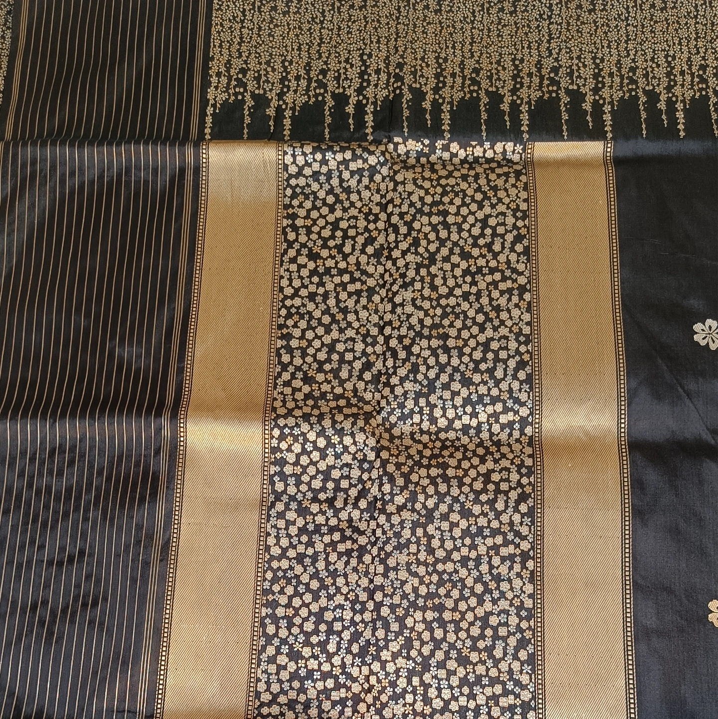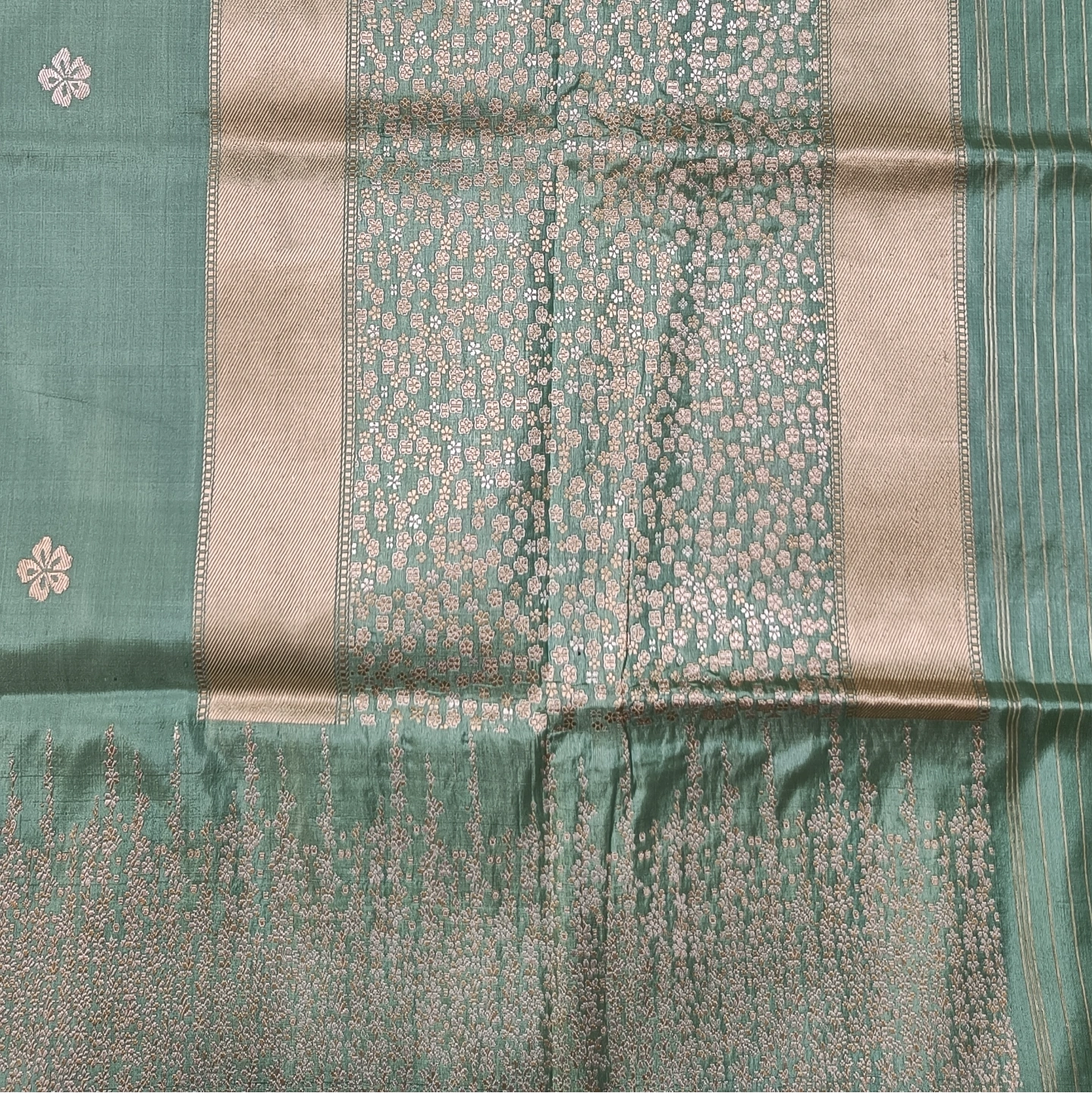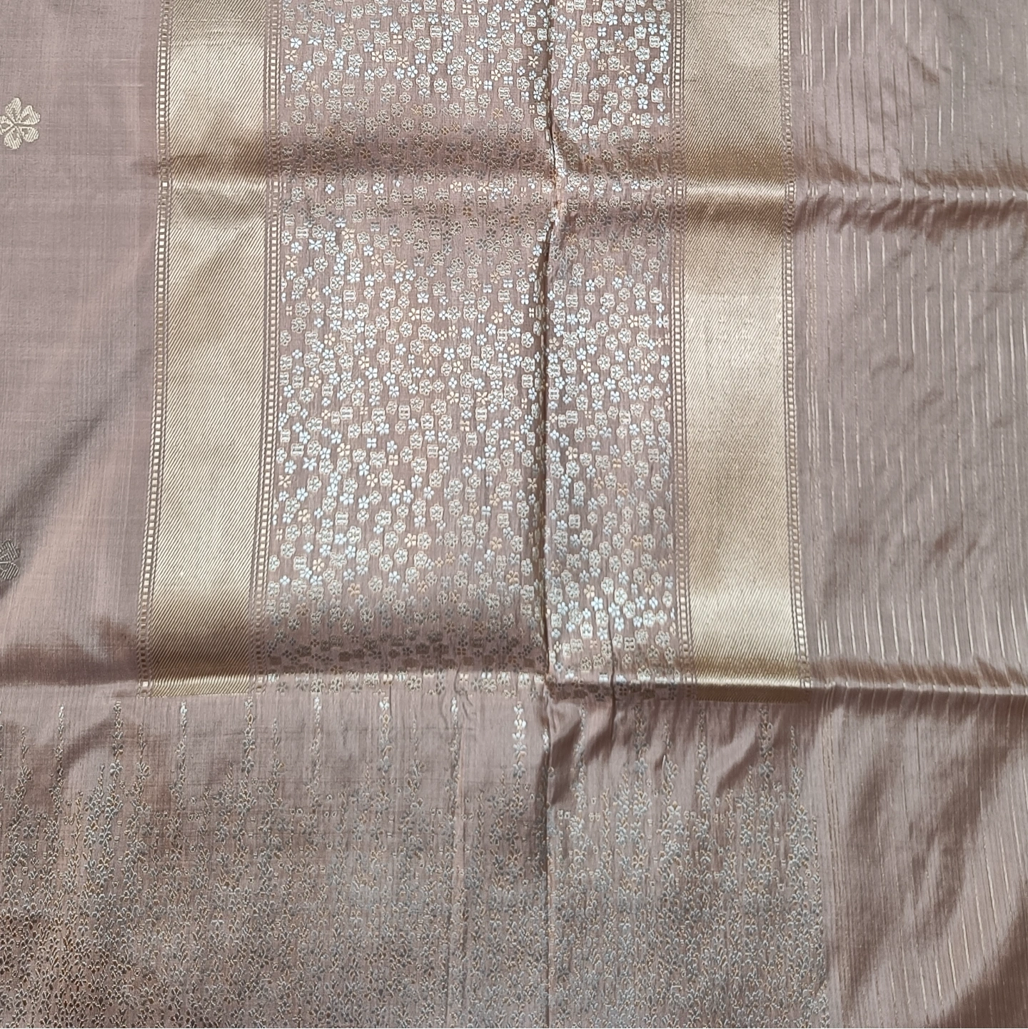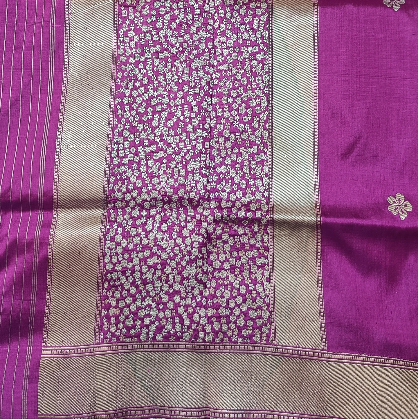 The 4-Ply Alfi Katan Kadwa Saree is a testament to extraordinary textile engineering and traditional weaving precision. Utilizing a heavy 4-ply silk yarn, the fabric offers a rich, substantial texture and a graceful fall that is both durable and luxurious. The body is embellished with delicate floral buttis using the Kadwa technique, where each motif is individually hand-woven into the fabric rather than being printed or embroidered, ensuring a clean finish on both sides. This masterpiece is further elevated by an Alfi border and a stunning Jhaal (dense floral creeper) pattern on the pallu, featuring intricate metallic threadwork. Combining the strength of multi-ply silk with the painstaking artistry of Benarasi weaving, this saree is a premier choice for heirloom collections and grand bridal celebrations.