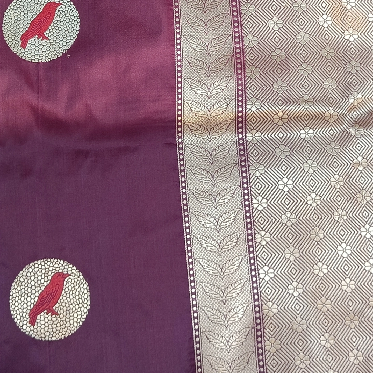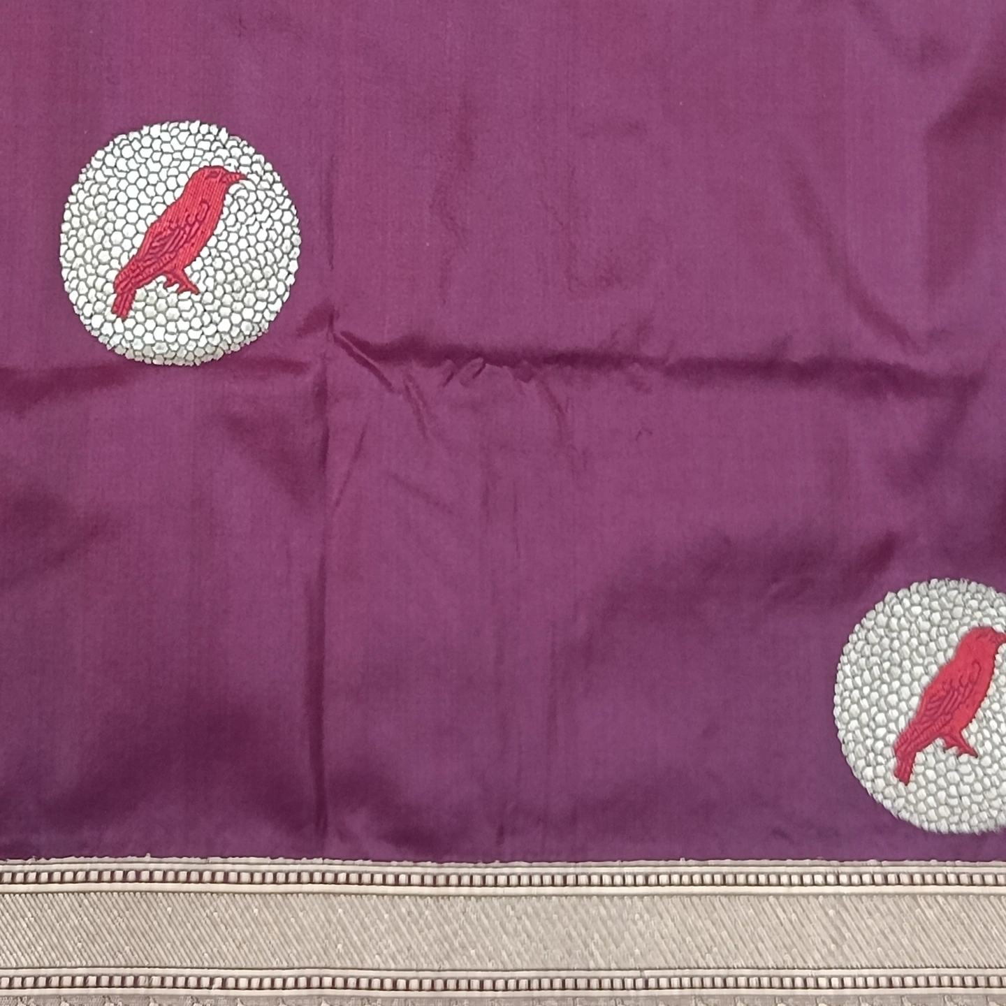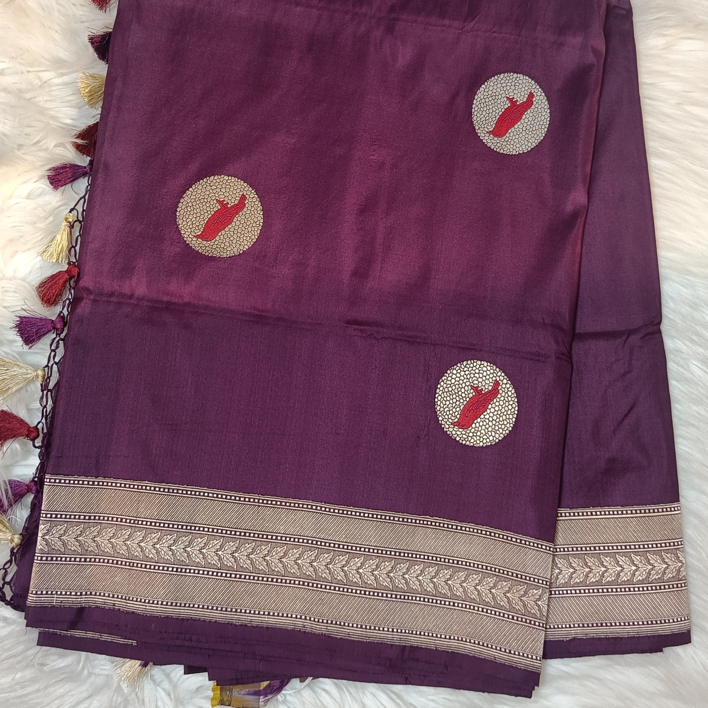 This saree is masterfully woven from premium 4-ply Katan silk in a rich, regal deep plum hue, offering a substantial architectural weight and a soft, natural luster. The body is adorned with circular medallions featuring bird motifs detailed with vibrant red Meenakari threadwork, providing a striking textured contrast against the dark silk base. A structural, fine-patterned zari border featuring a delicate leaf vine runs along the edges, lending a refined, heritage-inspired finish to the garment. Completed with multi-colored hand-tied tassels, this heirloom-quality piece combines the durability of high-density silk with classical Banarasi artistry for a sophisticated and grand drape.