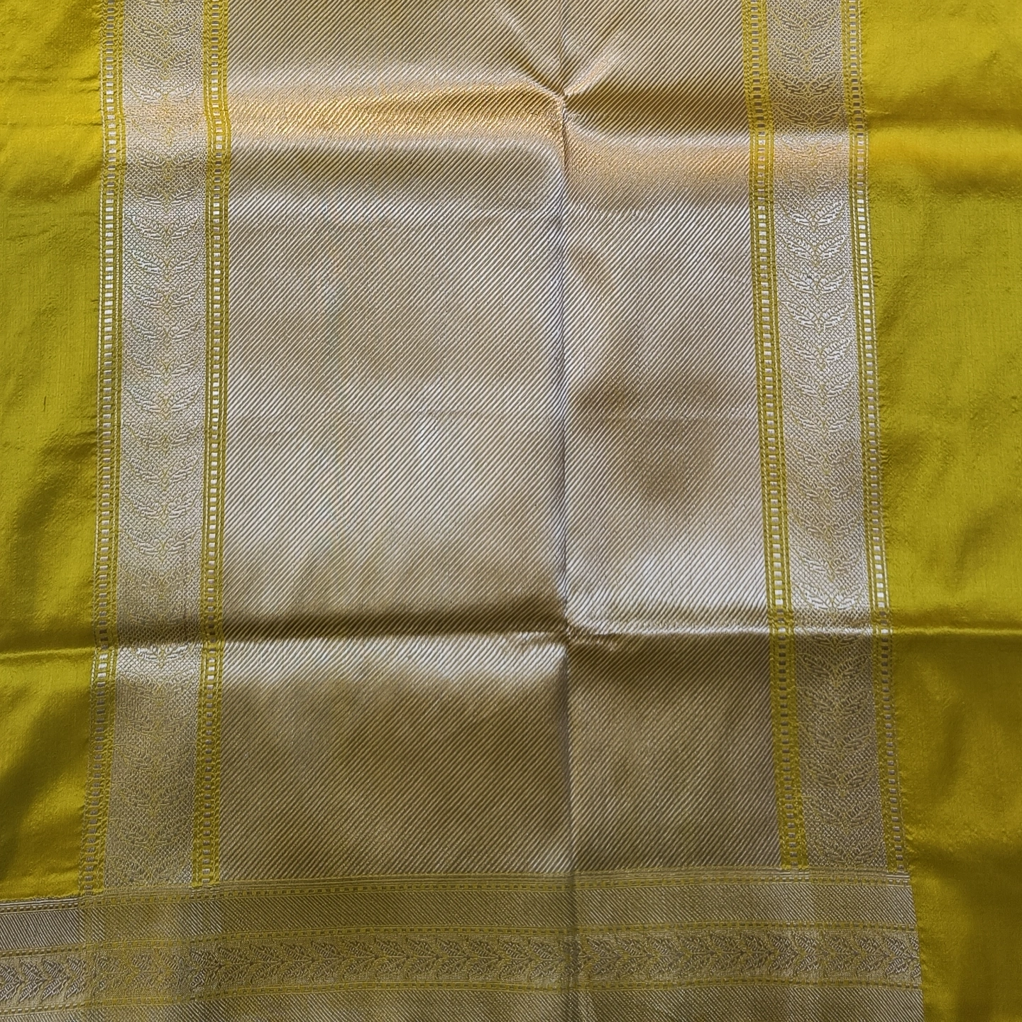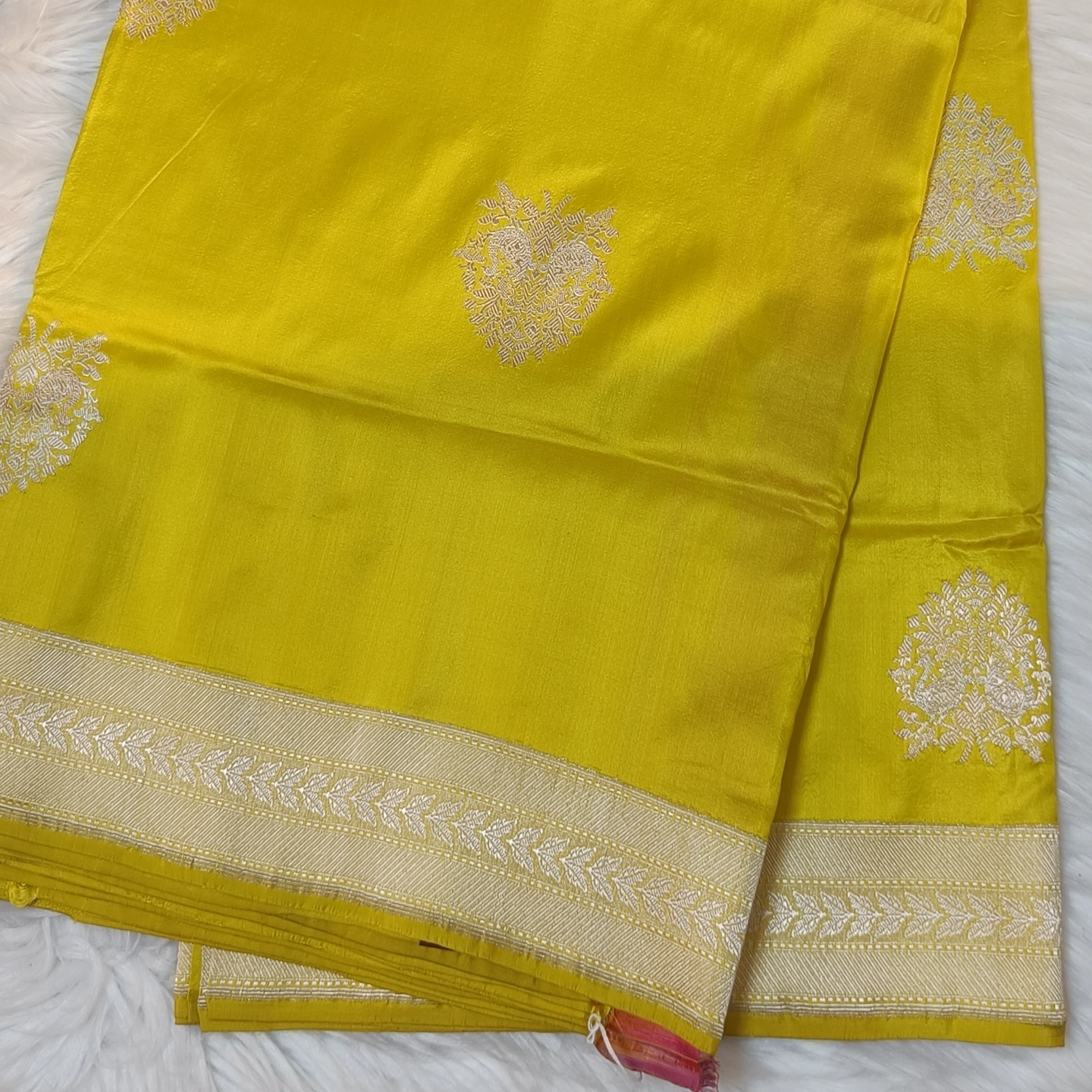 This saree is meticulously crafted from premium 4-ply Katan silk, a high-density weave that offers a substantial, architectural weight and a soft, natural luster. The body is adorned with intricate peacock-within-foliage medallions, featuring subtle Meenakari threadwork that adds a textured, jewel-like dimension to the shimmering zari. A structural border complements the central design, showcasing a delicate leaf-and-vine pattern framed by fine geometric bands. By combining the exceptional durability of multi-ply silk with classical avian iconography and traditional Banarasi artistry, this piece provides a regal and sophisticated drape perfectly suited for grand festive celebrations and heritage occasions.