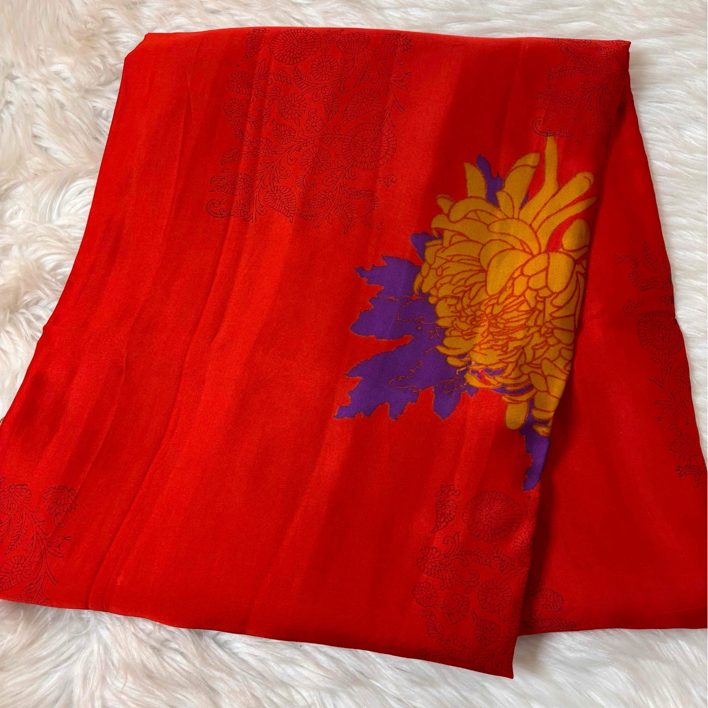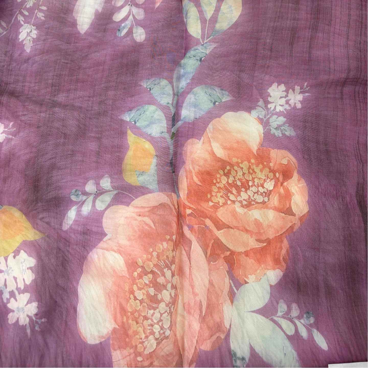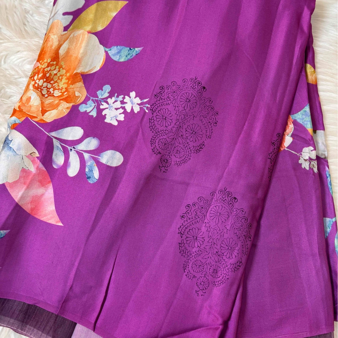 A contemporary fusion of satin and organza, this saree showcases oversized floral artistry that flows effortlessly across the fabric. The smooth satin base lends a soft sheen, while the organza layer adds a delicate, airy elegance. Light yet striking, this piece is perfect for modern occasions where subtle drama meets refined sophistication.