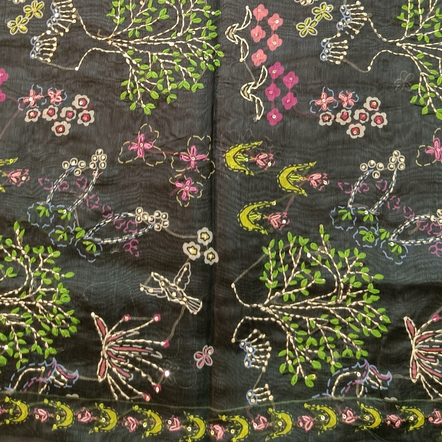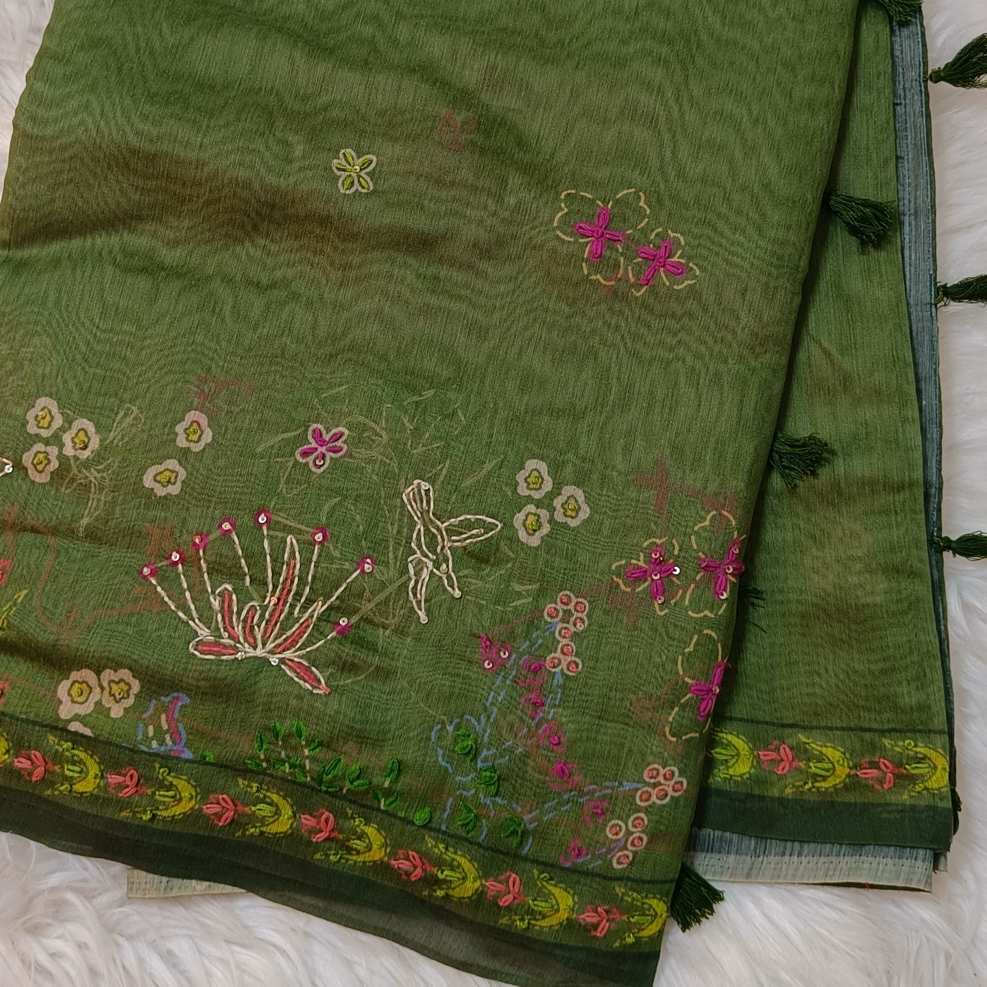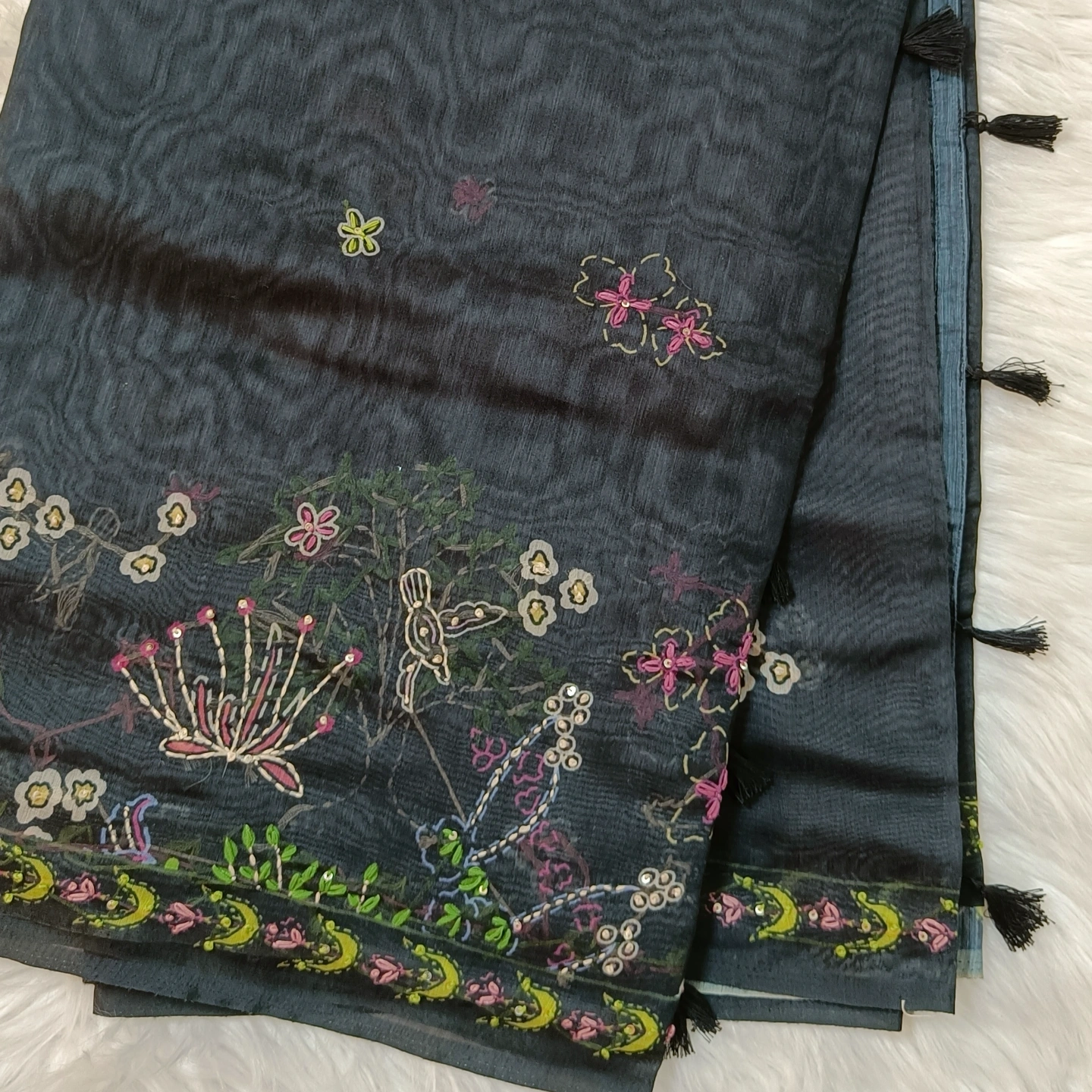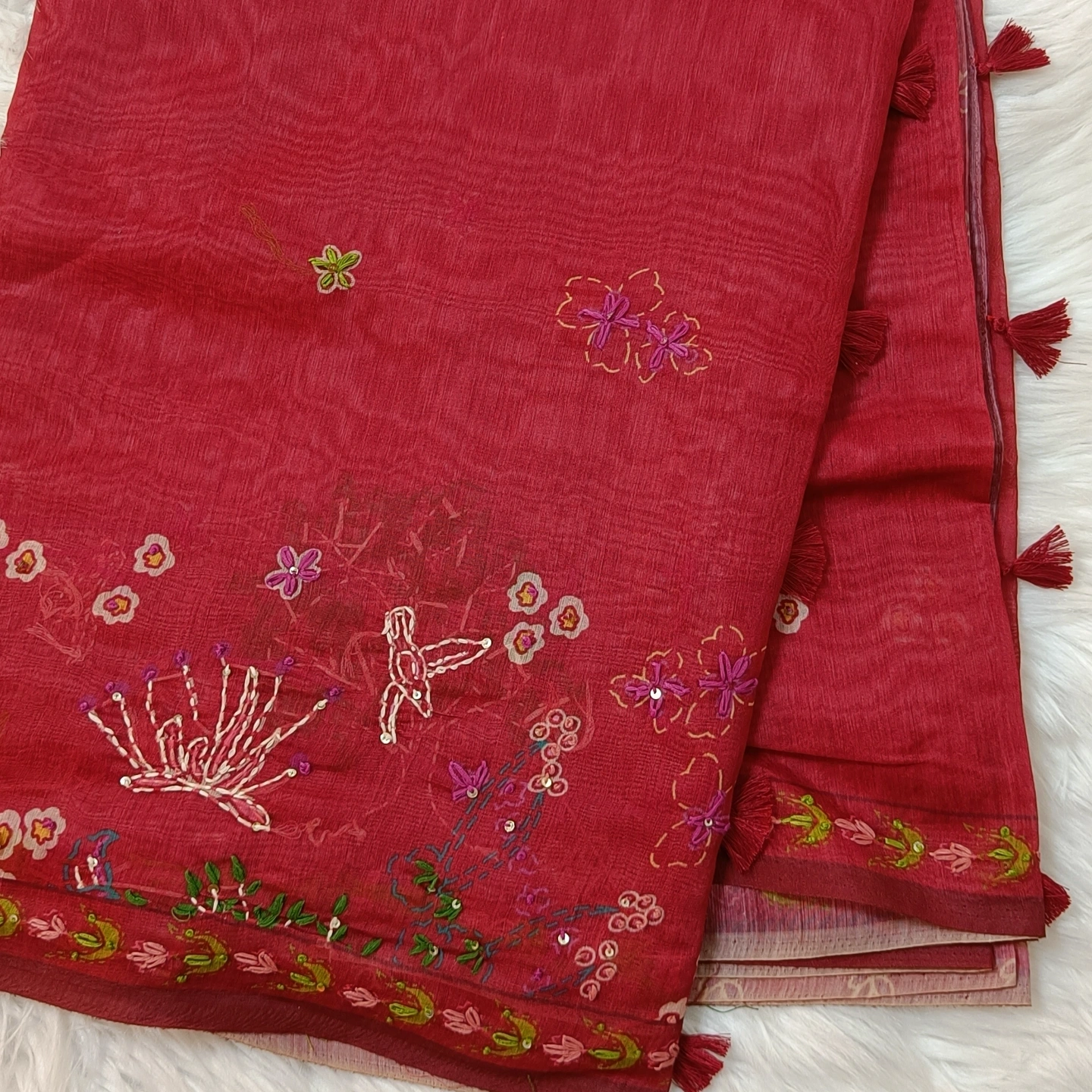 A soft cotton dupatta adorned with delicate katha handwork, featuring scattered floral motifs and an intricately detailed border. The design blends traditional craftsmanship with a light, breathable fabric, making it comfortable for everyday wear as well as subtle festive styling. Finished with small tassel accents along the edges, it adds a graceful, artisanal touch to any outfit.