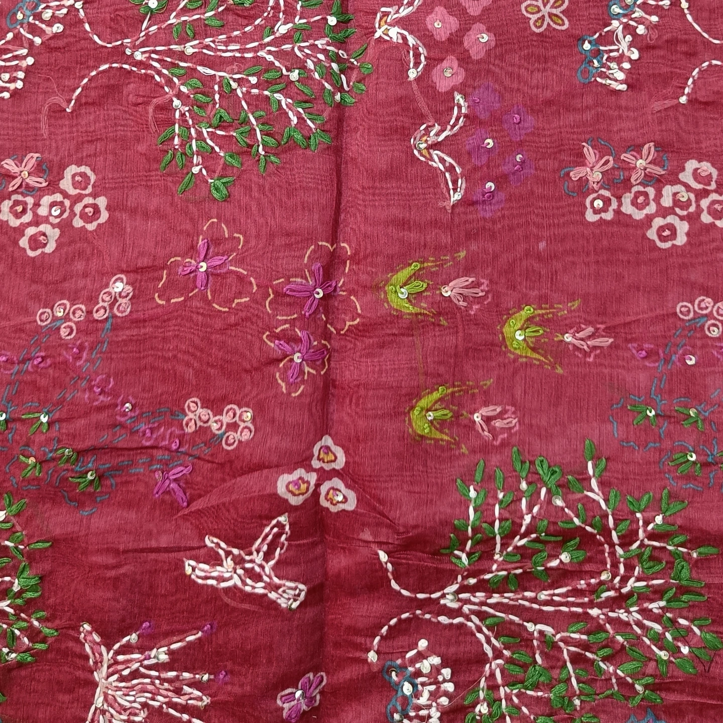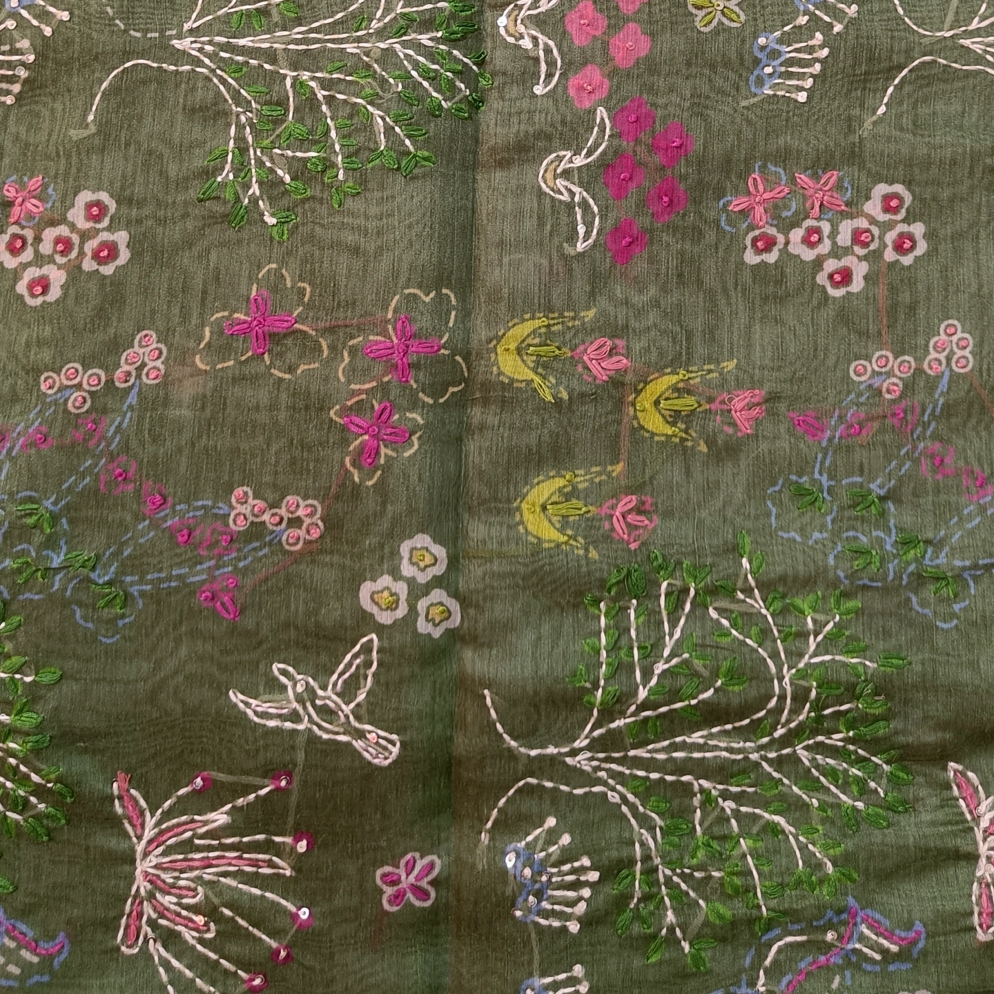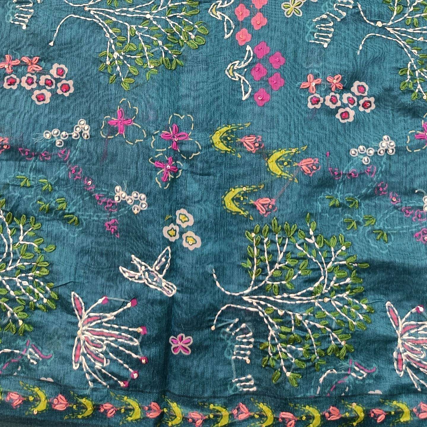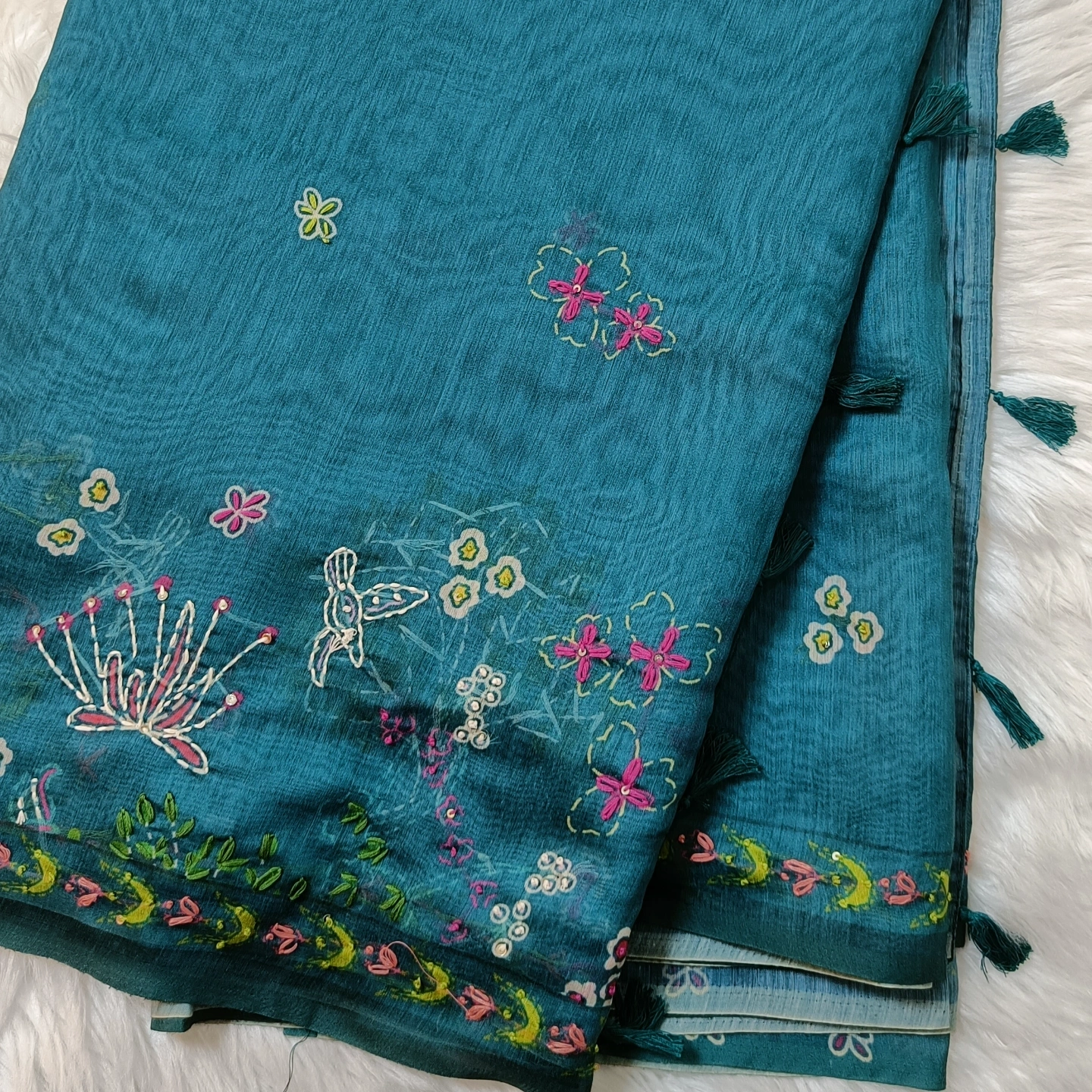 A soft cotton dupatta adorned with delicate katha handwork, featuring scattered floral motifs and an intricately detailed border. The design blends traditional craftsmanship with a light, breathable fabric, making it comfortable for everyday wear as well as subtle festive styling. Finished with small tassel accents along the edges, it adds a graceful, artisanal touch to any outfit.