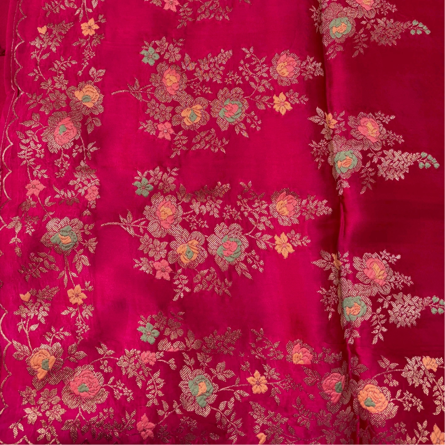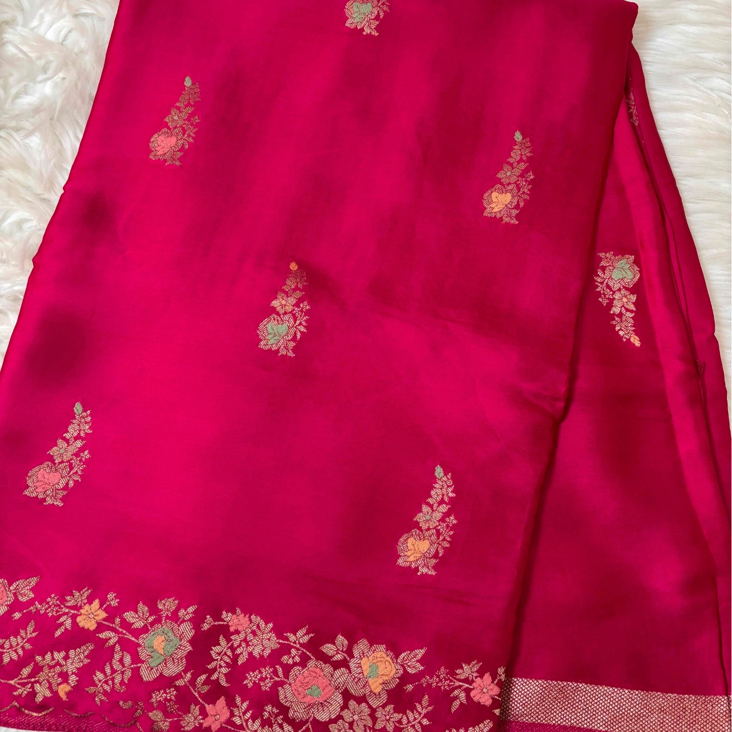 A refined crepe saree featuring delicately placed floral butta motifs that add a soft, graceful rhythm to the drape. The smooth, fluid texture of the fabric enhances its elegant fall, while the subtle sheen highlights the intricate detailing of each motif. Effortlessly blending simplicity with sophistication, this saree is perfect for both daytime elegance and evening gatherings.