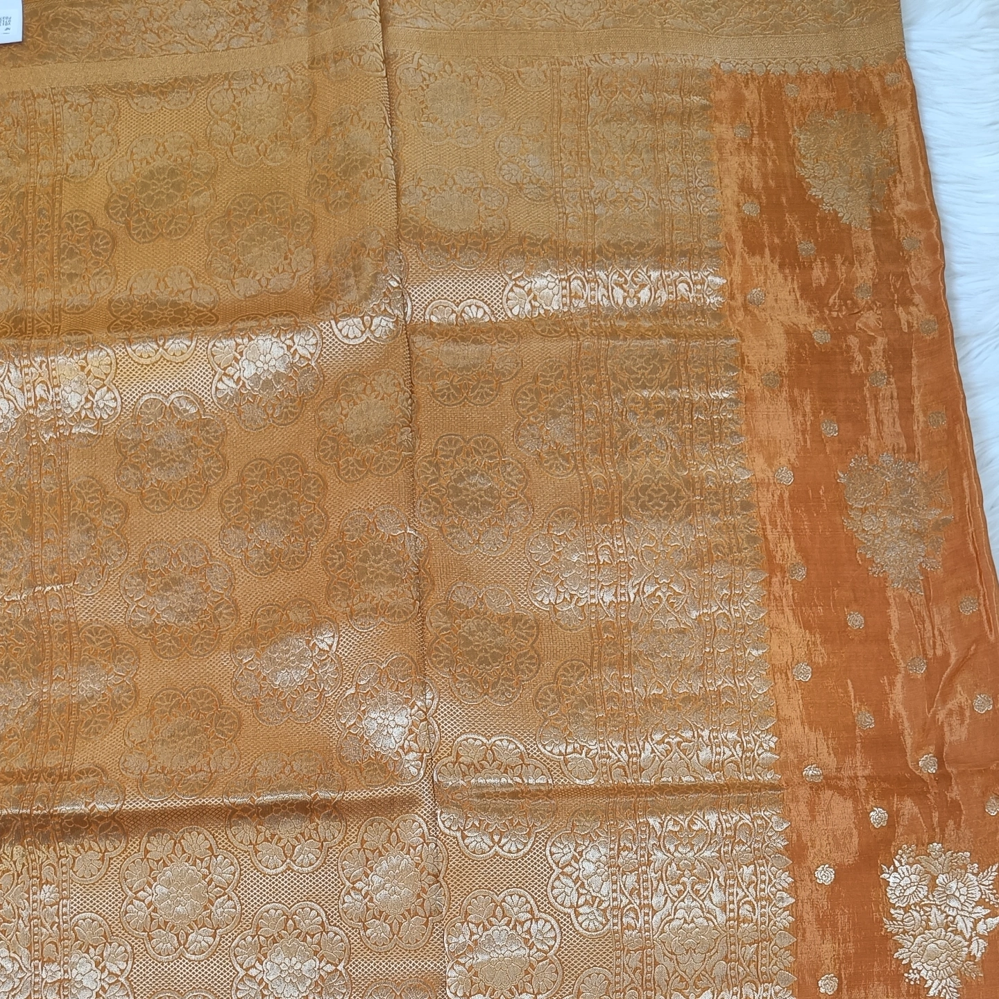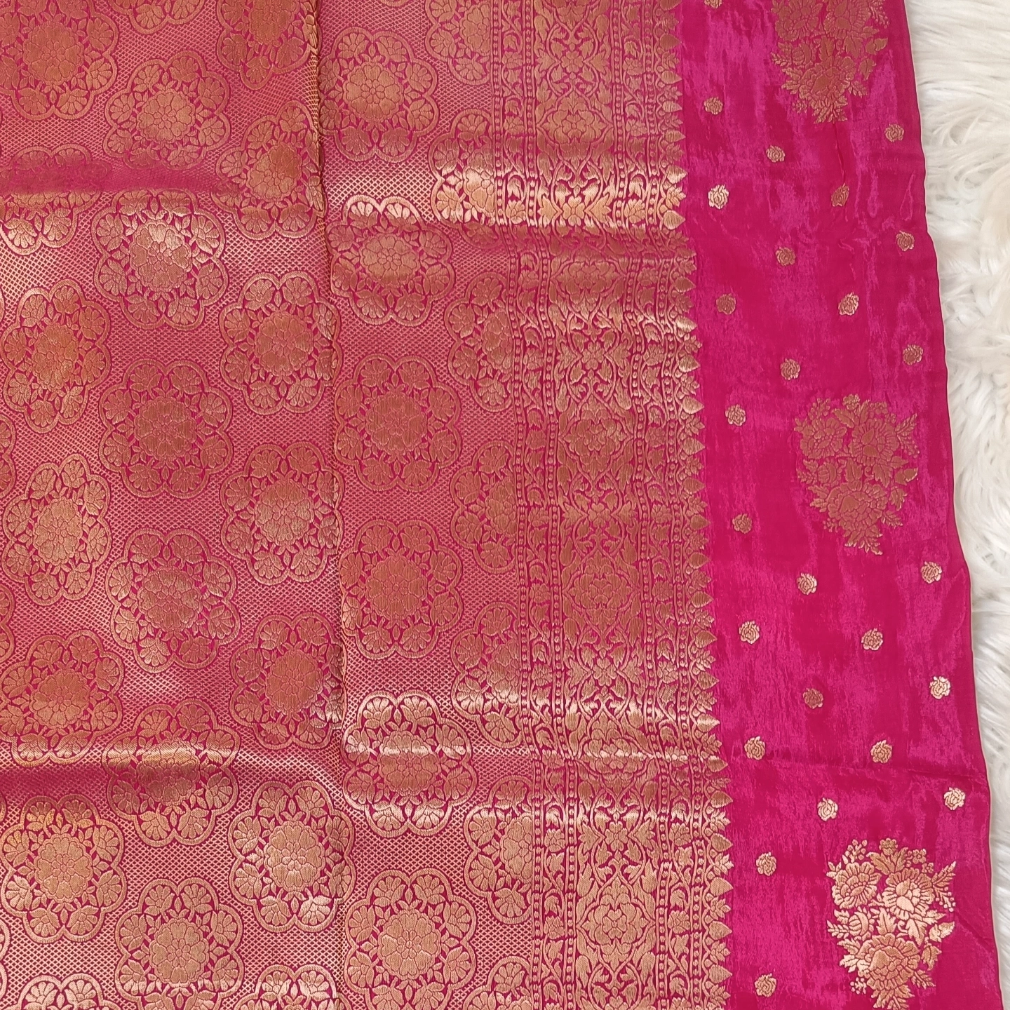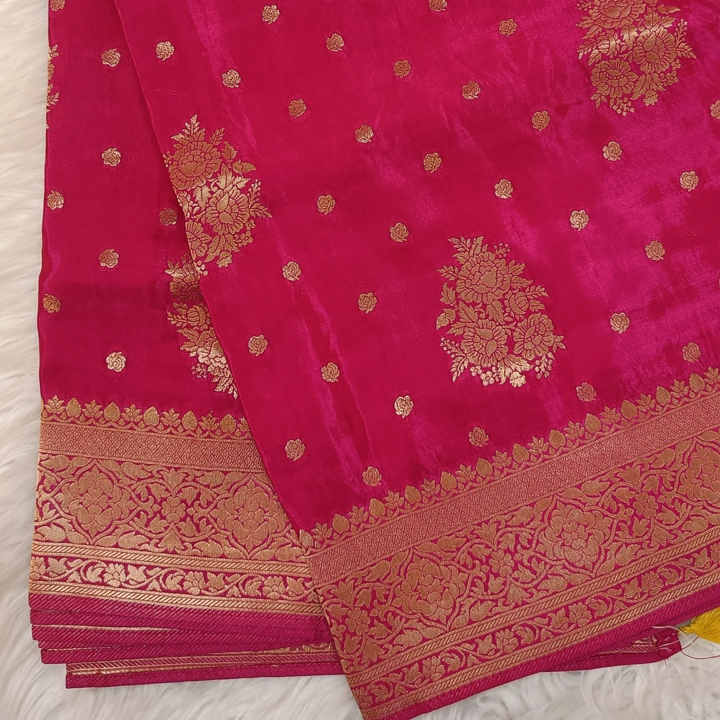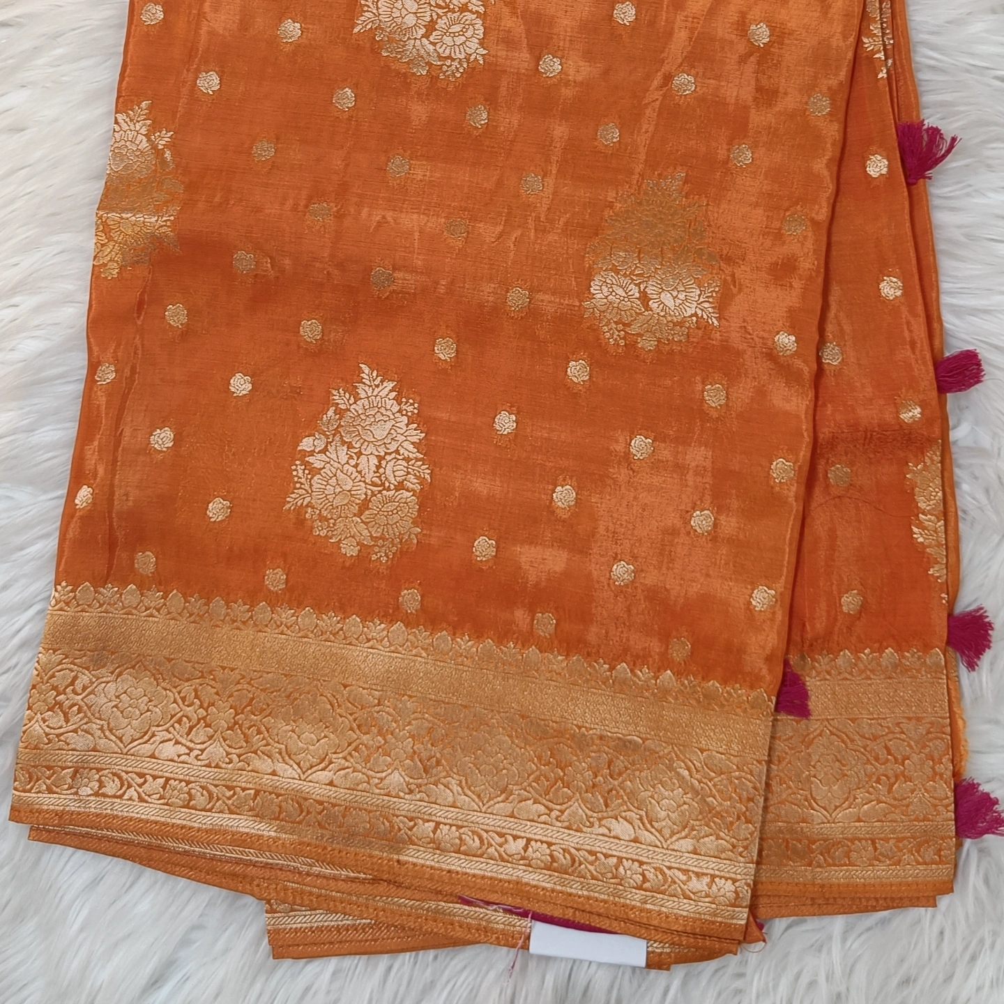 This is a Fancy Crepe Flower Butta Saree, a sophisticated garment that blends traditional artistry with a modern silhouette. The saree is crafted from high-quality crepe fabric, known for its soft, fluid drape and subtle sheen that allows the material to fall elegantly against the body. Its primary characteristic is the intricate Zari Butta work, featuring detailed floral motifs scattered across the length of the fabric. These gold-toned embellishments add a layer of texture and shimmer, creating a rhythmic pattern that elevates the overall aesthetic.