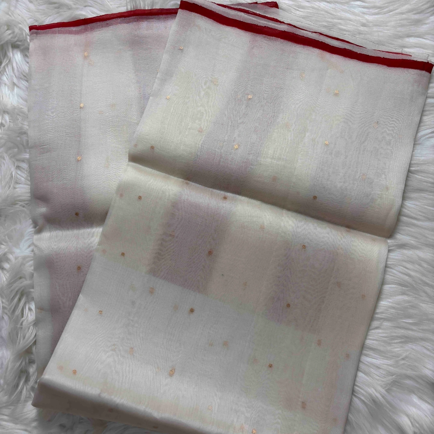 Crafted in sheer and lightweight Kora Organza, this saree reflects quiet elegance through its soft, airy texture and graceful translucence. The body is adorned with finely spaced zari buta motifs that lend a subtle shimmer without overwhelming the design. Its minimal aesthetic is elevated by a clean, refined border, allowing the fabric’s natural sheen and fluid drape to stand out. Understated yet sophisticated, this piece is perfect for effortless elegance across both festive and intimate occasions.