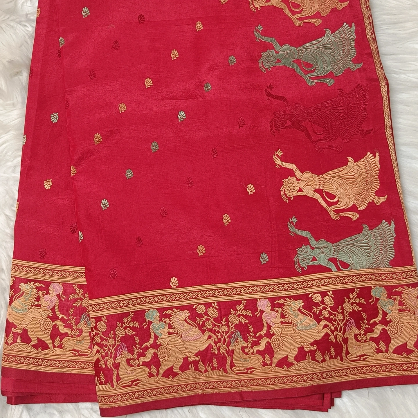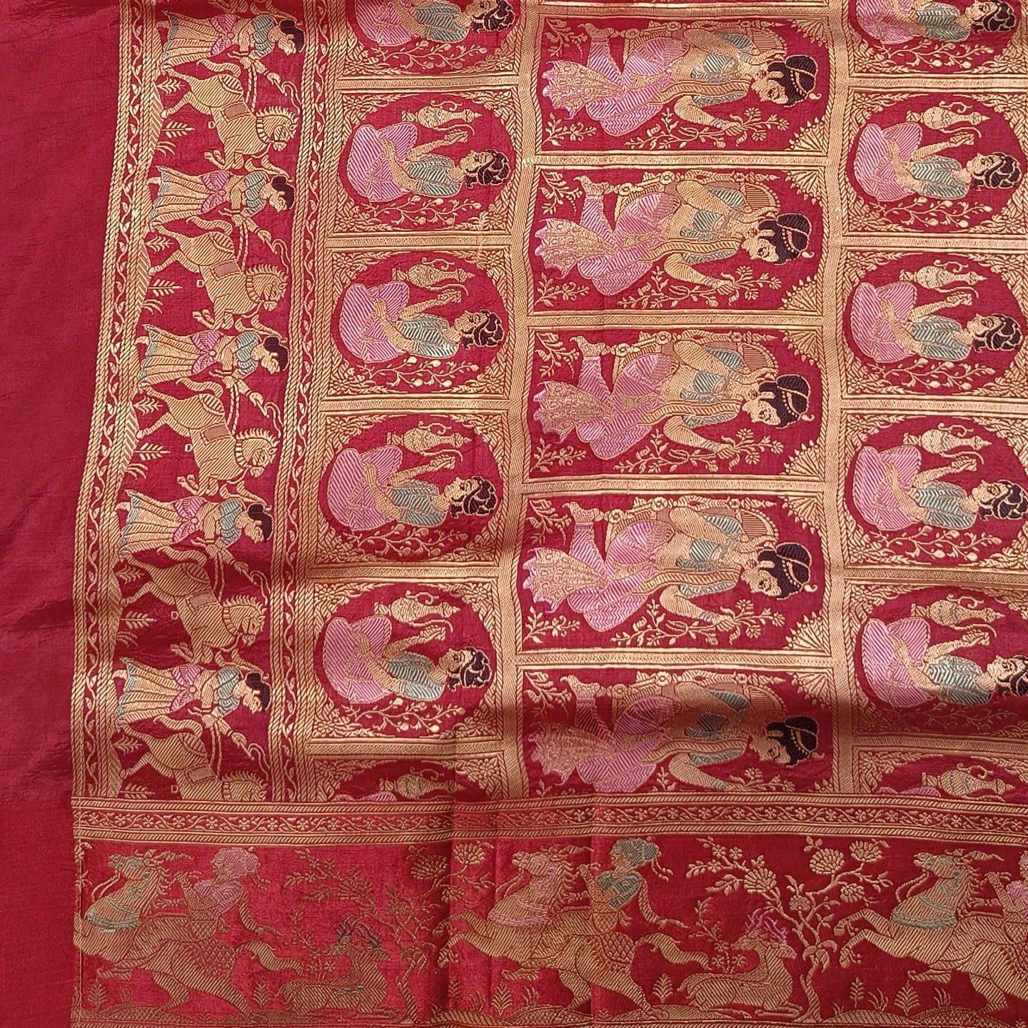 This stunning saree is a vibrant tribute to the heritage of Baluchari weaving, crafted on a base of luxurious, high-sheen Katan Silk. Set against a deep crimson background, the textile features a fascinating narrative design typical of this historical craft. The body is delicately sprinkled with multi-colored floral buttis, while the focus shifts to the extraordinary figurative motifs woven along the borders and pallu. These intricate depictions showcase elegant dancing figures and traditional scenes from Indian mythology and royal life, rendered in a palette of antique gold and sage green zari. The meticulous weaving technique brings each scene to life with remarkable detail, making this saree not just a garment, but a wearable piece of art. It is a quintessential choice for weddings and grand cultural events, offering a perfect blend of regal color and classical storytelling.