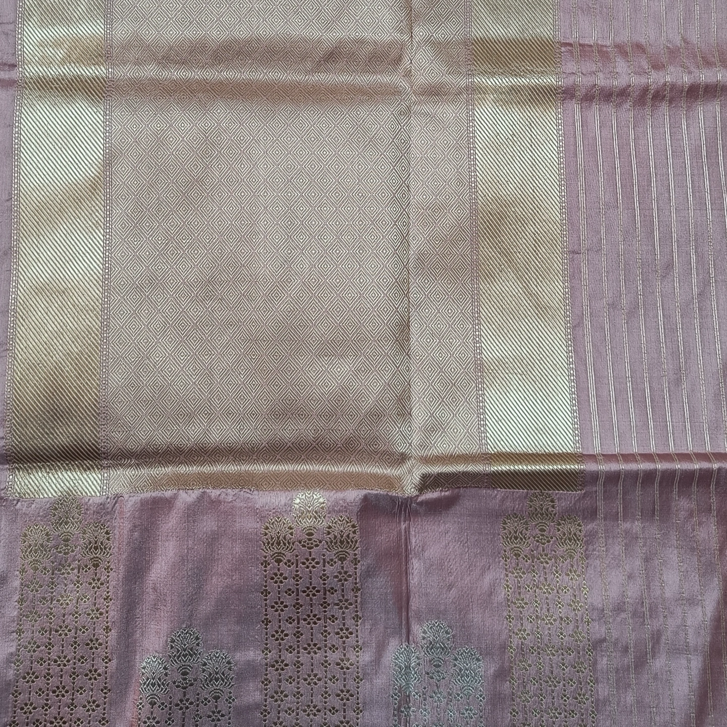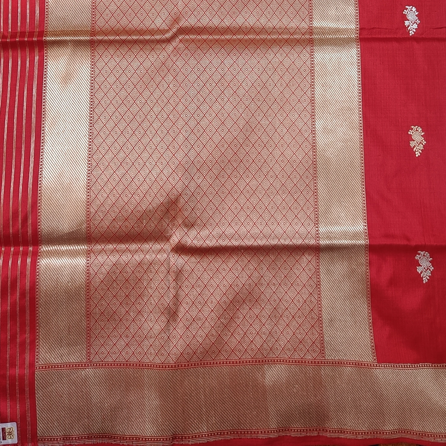 This Katan Silk Saree is a brilliant showcase of high-end Benarasi weaving, featuring the prestigious Sona Rupa technique. The design utilizes both gold and silver metallic threads to create a stunning two-toned shimmer across the fabric. The body is adorned with delicate, individually hand-woven floral buttis using the Kadwa method, ensuring a clean, raised finish. A defining feature of this piece is the elegant Alfi border, which is complemented by a series of striking, elongated Jhumka-style floral hangings that drape gracefully from the top edge. Combining the luxurious luster of pure Katan silk with intricate, dual-toned ornamentation, this saree is a sophisticated choice for weddings, grand receptions, and festive celebrations that demand a touch of royal elegance.
