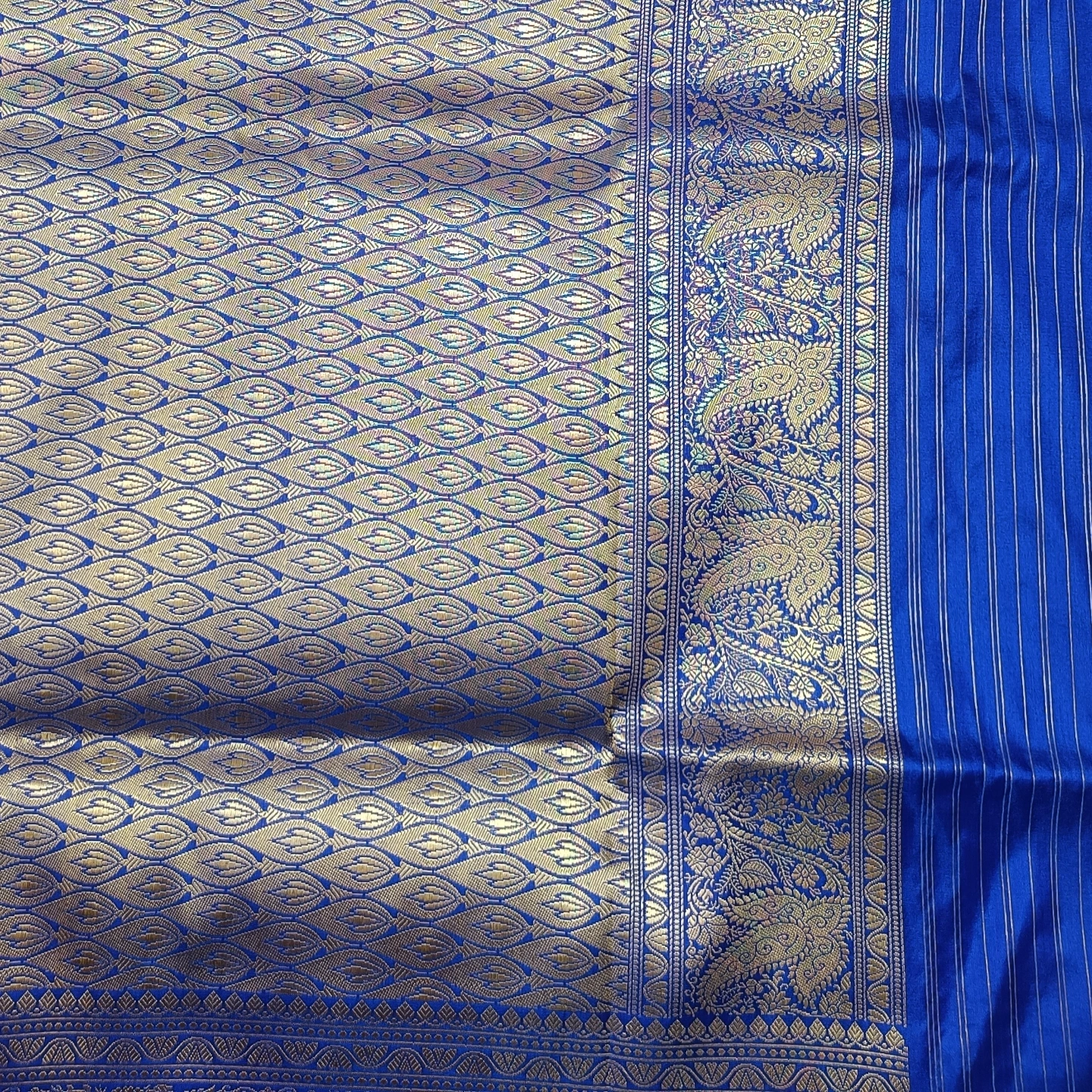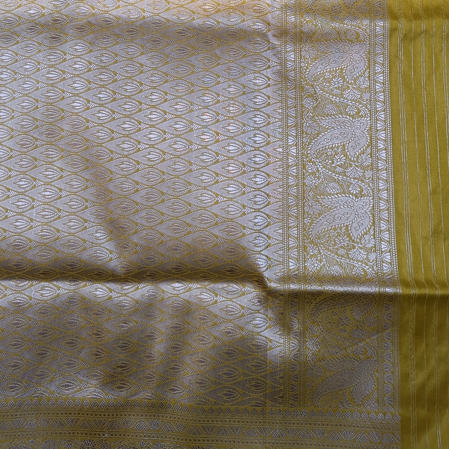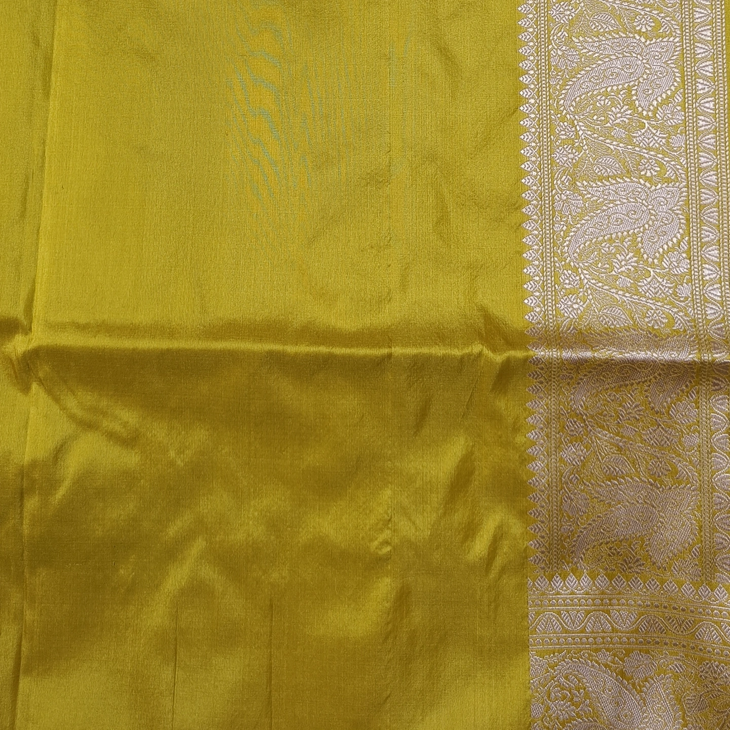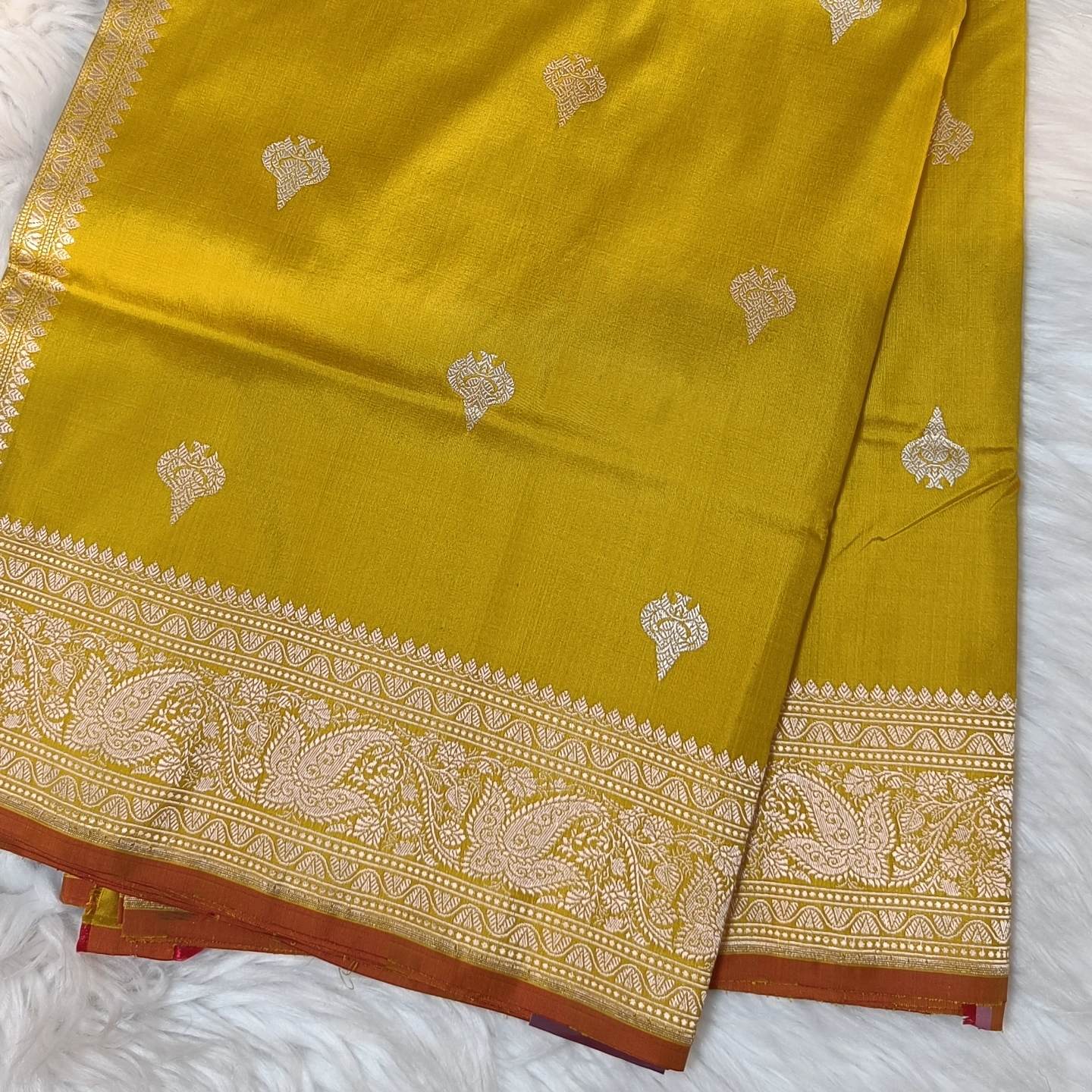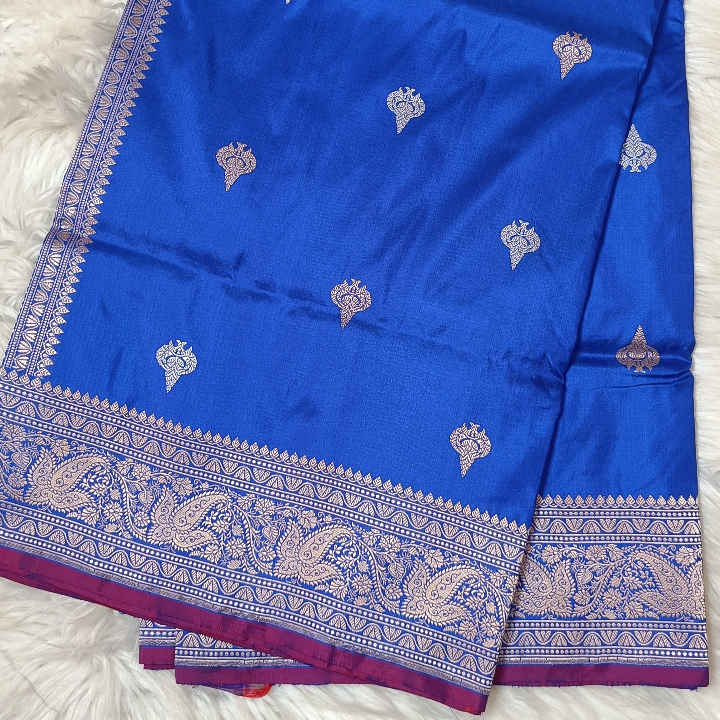 This Katan Silk Saree is a classic expression of artisanal precision, featuring a smooth, lustrous base that highlights the richness of the weave. The body is adorned with intricately woven floral buttis using the meticulous Kadwa technique, where each motif is individually hand-woven into the fabric for a distinct, raised appearance. This labor-intensive method ensures a clean finish and a premium texture that is characteristic of high-end Benarasi craftsmanship. The saree is framed by a traditional Paisley Zari border, showcasing a dense and flowing arrangement of floral motifs and classic scrolls. With its blend of timeless motifs and the structural elegance of pure Katan silk, this piece is an ideal choice for weddings and celebratory events that call for a regal, heritage look.