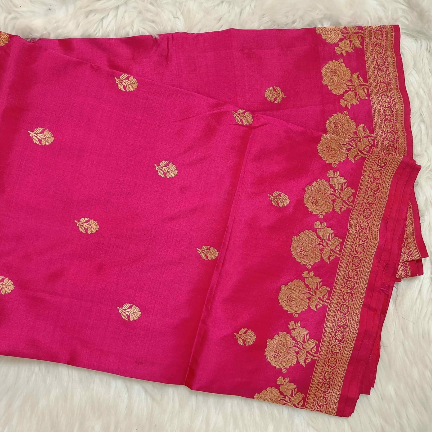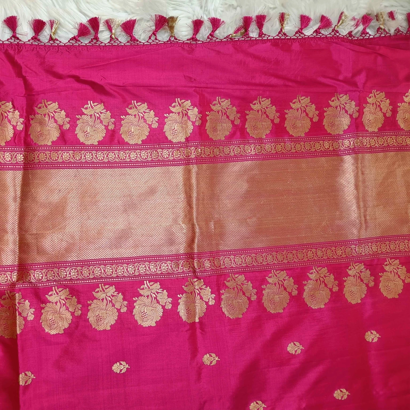 A refined expression of traditional craftsmanship, this katan saree features intricately woven kadwa butis scattered gracefully across the body. The richly detailed border showcases classic floral motifs, adding depth and grandeur to the drape. Woven with precision and timeless artistry, it offers a luxurious texture and an elegant fall, making it a perfect choice for festive and heirloom wear.