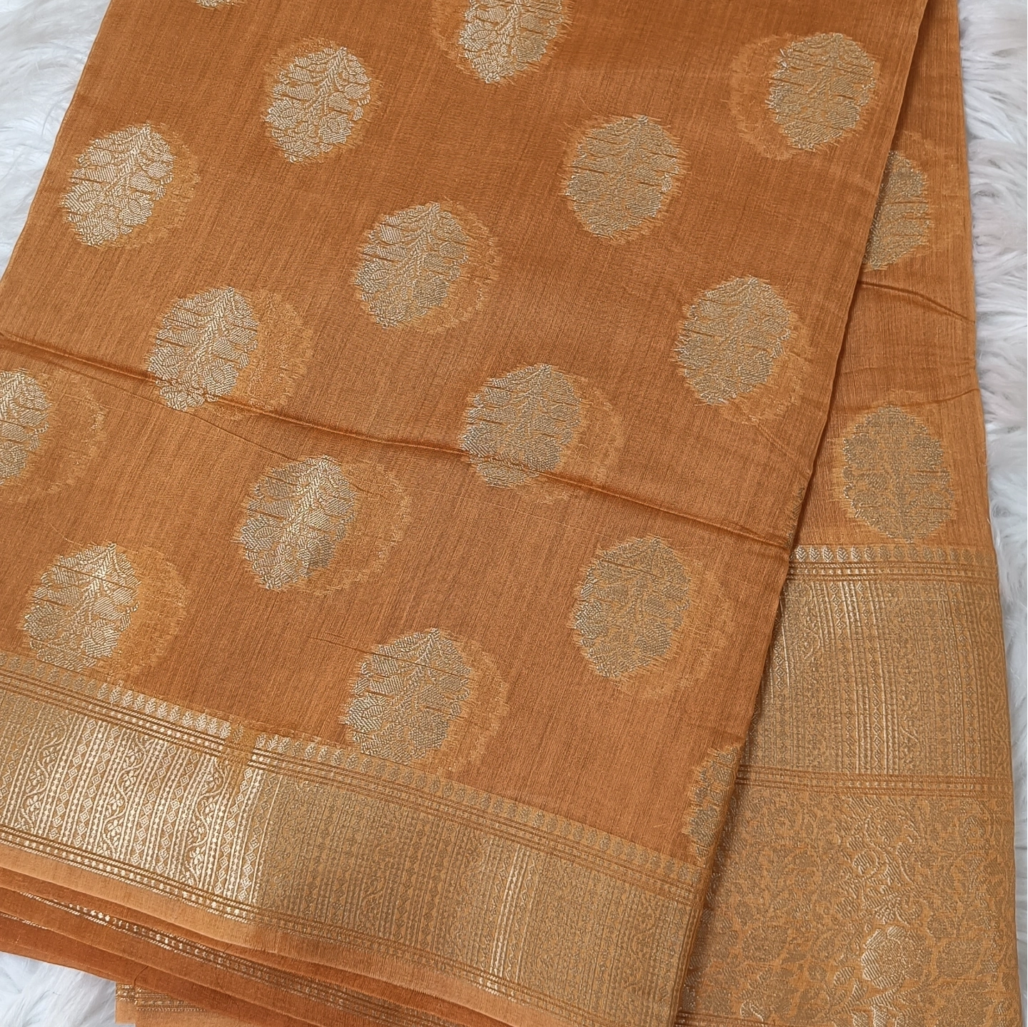 An elegant Katan silk saree inspired by Chanderi aesthetics, featuring finely woven butti motifs that lend a delicate and graceful appeal. The fabric carries a subtle sheen with a lightweight, airy feel, enhancing its refined character. Accentuated by a neatly crafted border that adds structure and charm, this saree beautifully blends traditional weaving with a touch of contemporary finesse—perfect for both festive and sophisticated occasions.