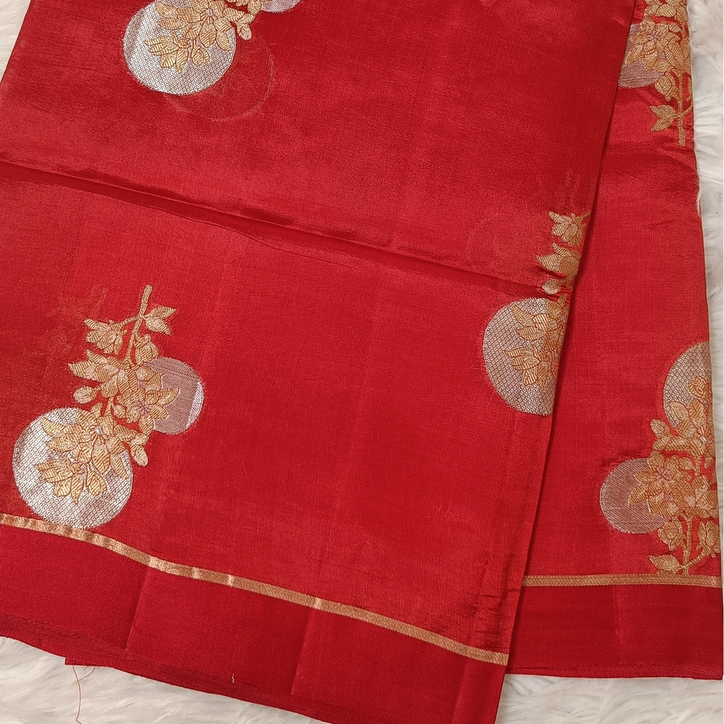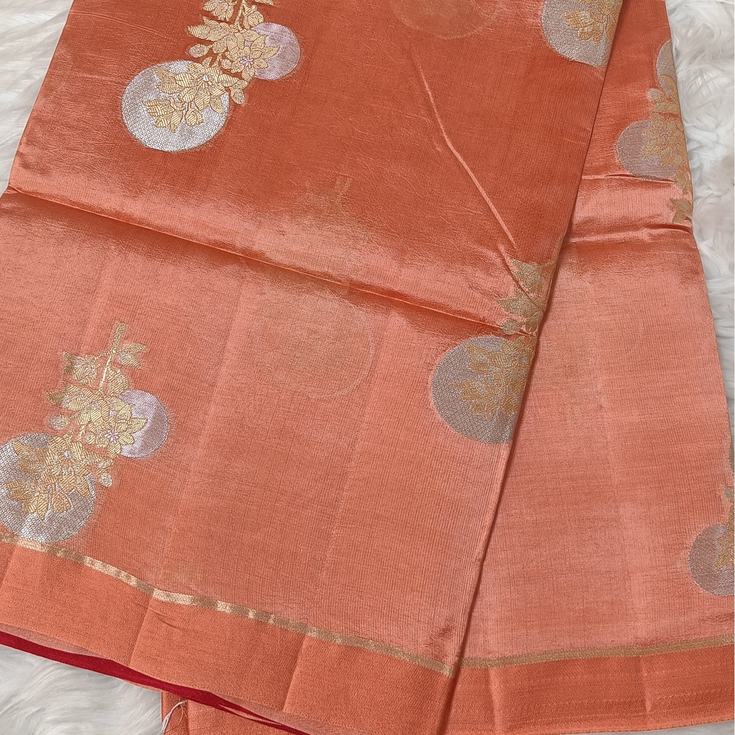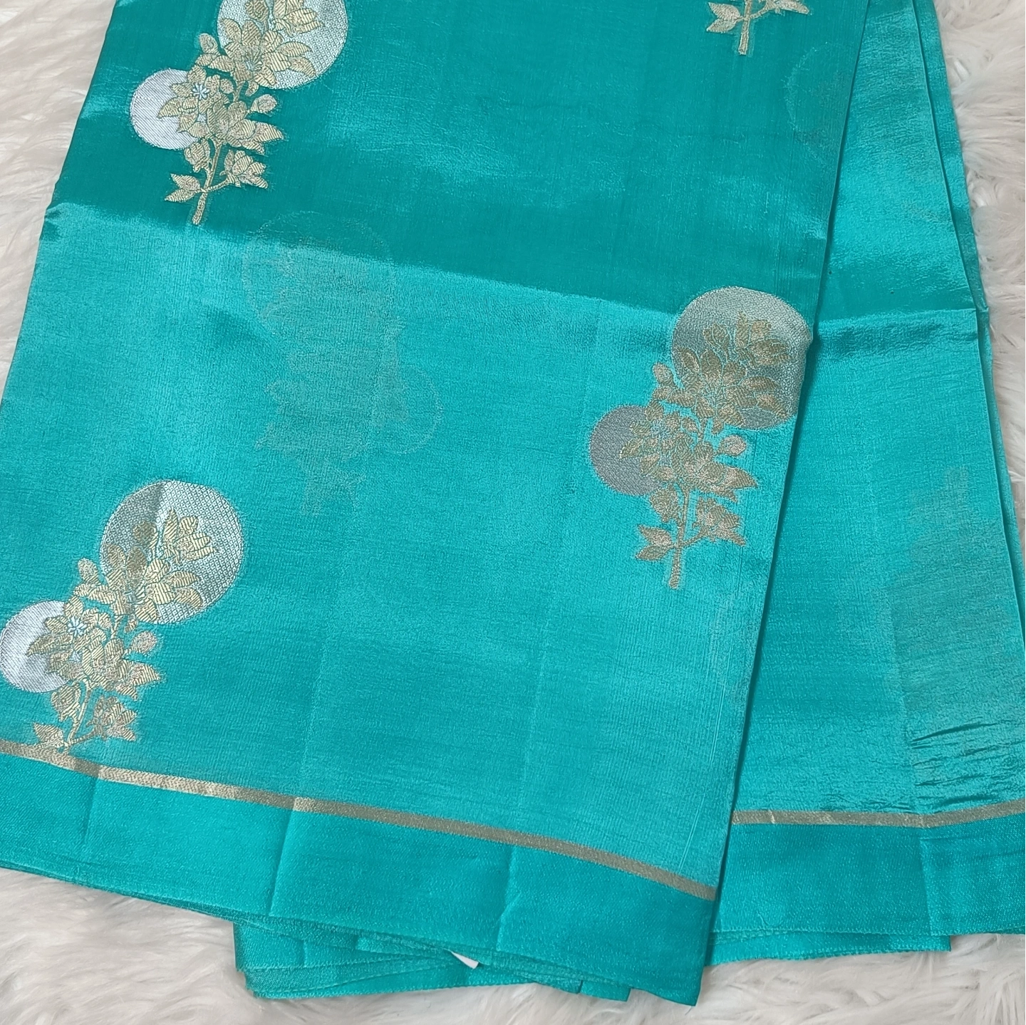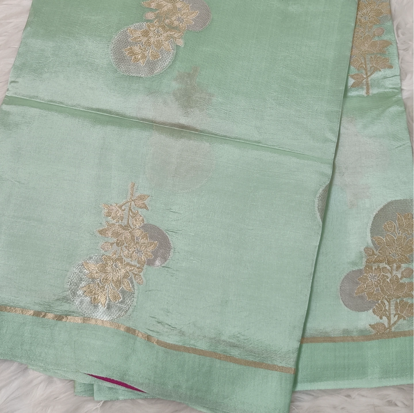 A captivating fusion of subtle and statement design, this dual-contrast katan silk saree brings together two distinct aesthetics in one elegant drape. One side features delicate butti motifs scattered gracefully, while the other showcases bold floral medallion-inspired patterns that add depth and visual interest. The smooth, lustrous silk enhances the richness of the weave, complemented by a refined zari border. Perfect for those who appreciate versatile elegance with a contemporary twist on traditional craftsmanship.