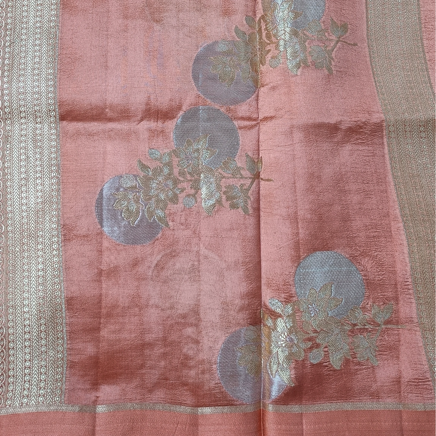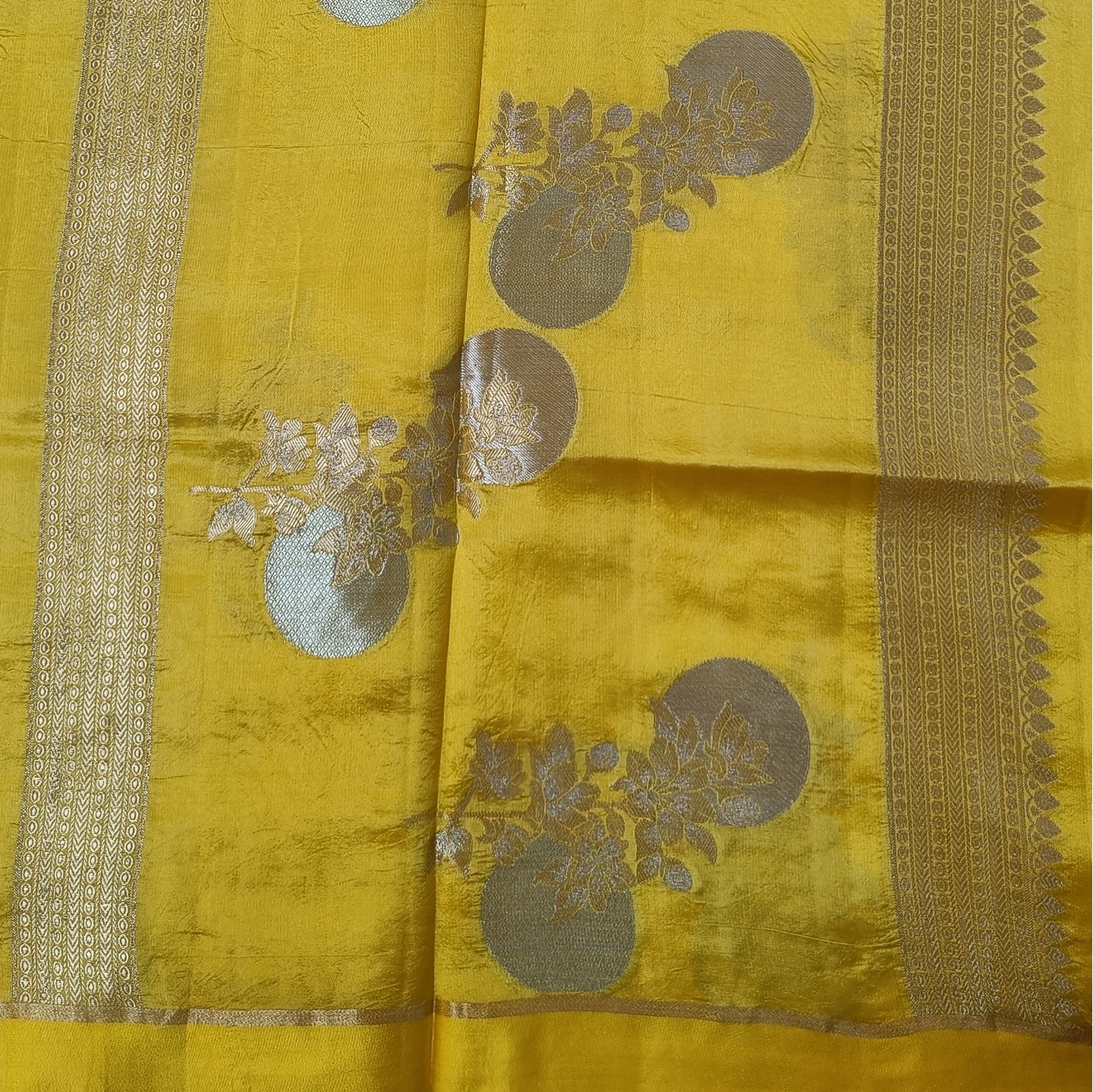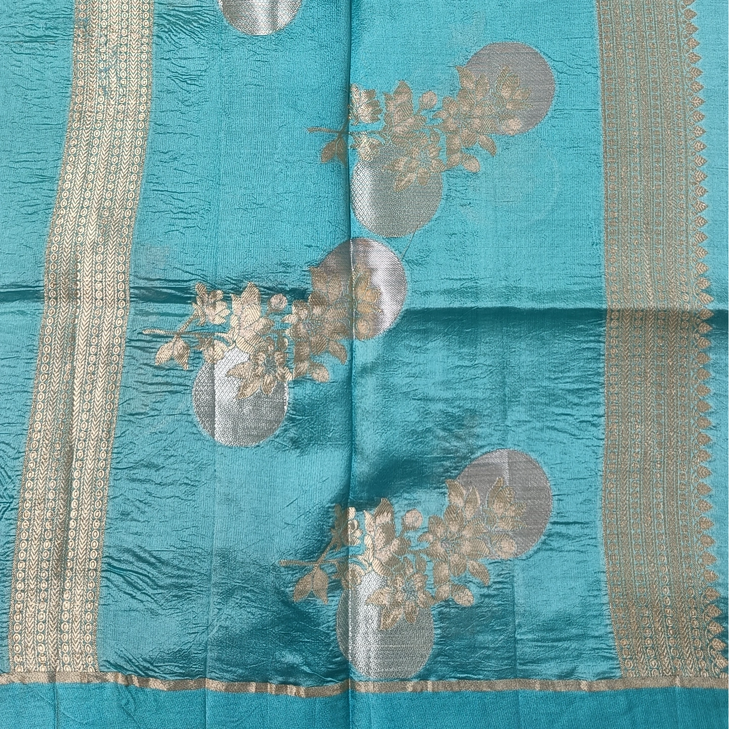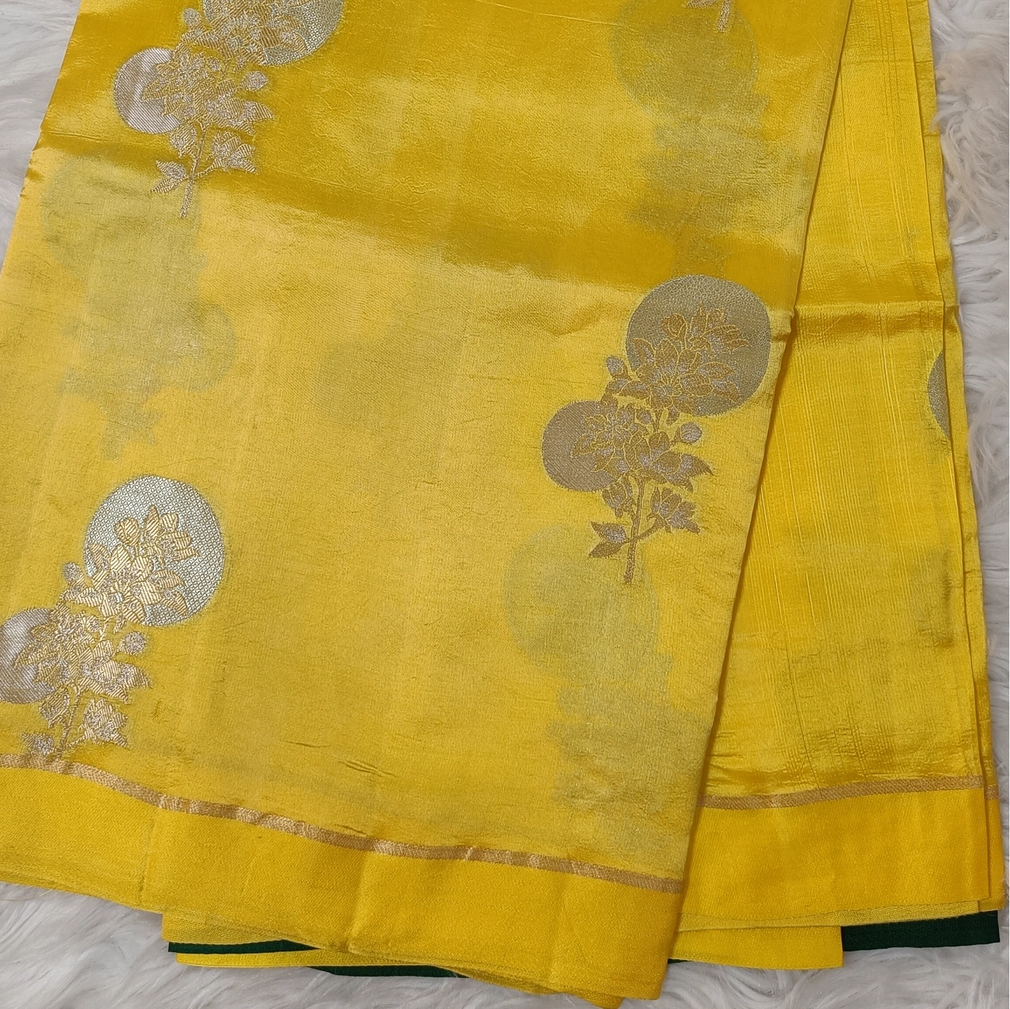 A captivating fusion of subtle and statement design, this dual-contrast katan silk saree brings together two distinct aesthetics in one elegant drape. One side features delicate butti motifs scattered gracefully, while the other showcases bold floral medallion-inspired patterns that add depth and visual interest. The smooth, lustrous silk enhances the richness of the weave, complemented by a refined zari border. Perfect for those who appreciate versatile elegance with a contemporary twist on traditional craftsmanship.