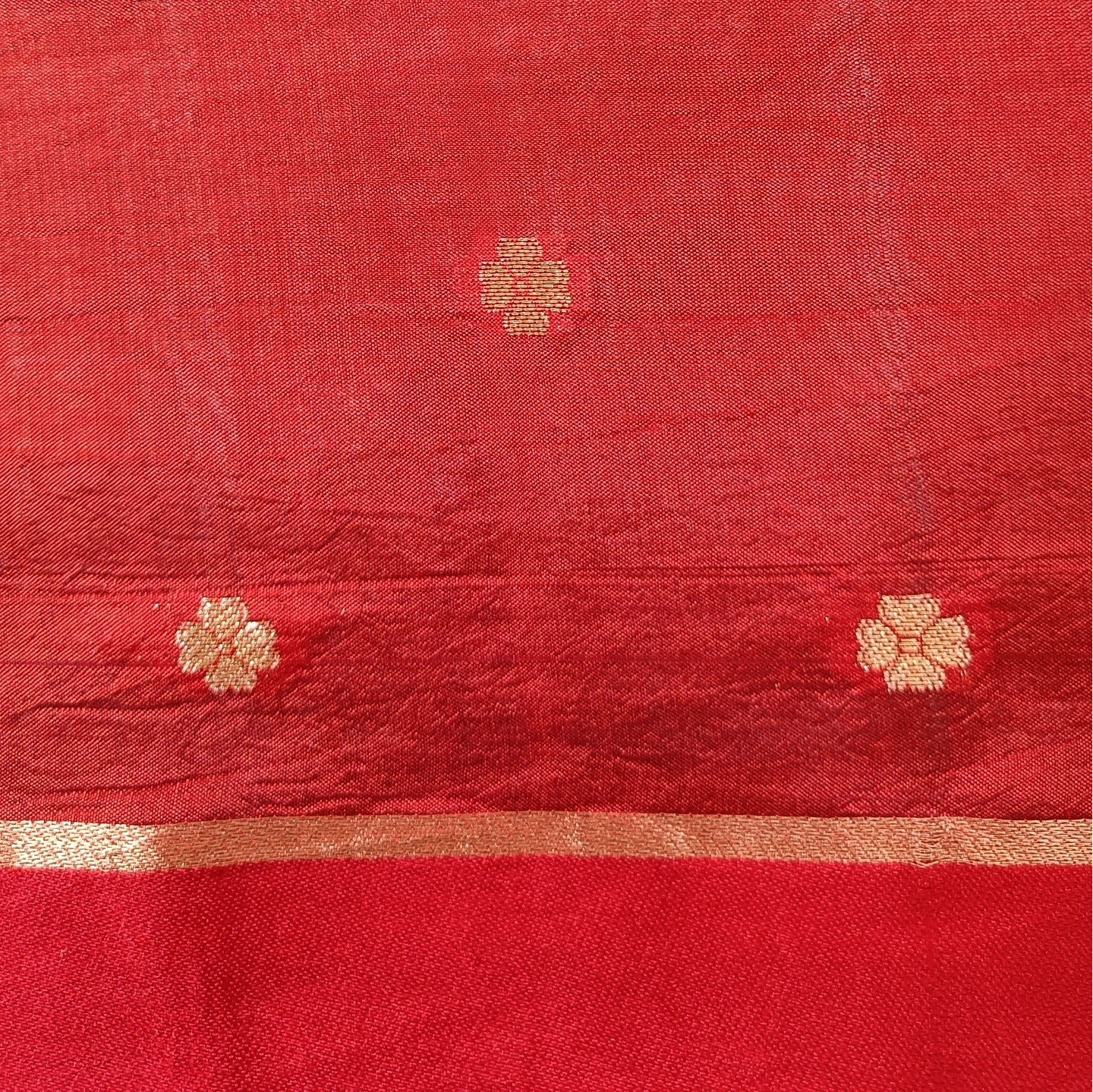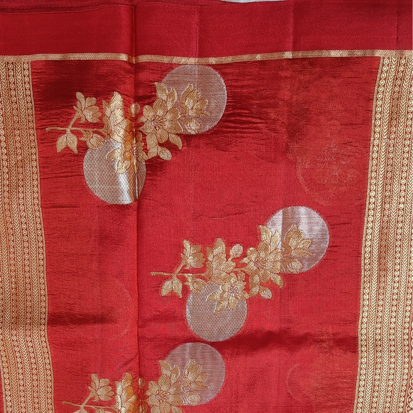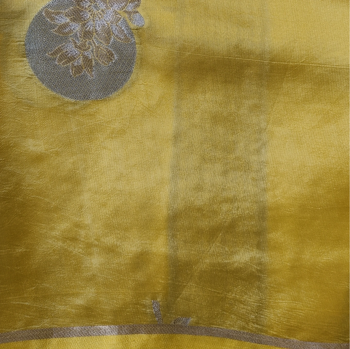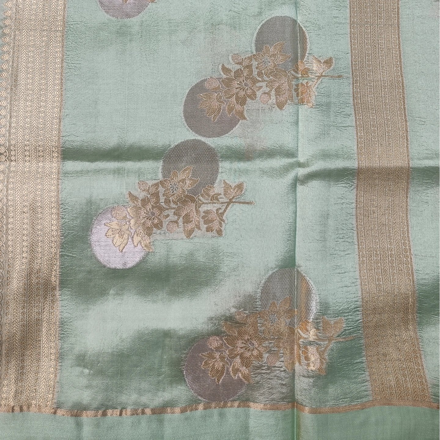 A captivating fusion of subtle and statement design, this dual-contrast katan silk saree brings together two distinct aesthetics in one elegant drape. One side features delicate butti motifs scattered gracefully, while the other showcases bold floral medallion-inspired patterns that add depth and visual interest. The smooth, lustrous silk enhances the richness of the weave, complemented by a refined zari border. Perfect for those who appreciate versatile elegance with a contemporary twist on traditional craftsmanship.