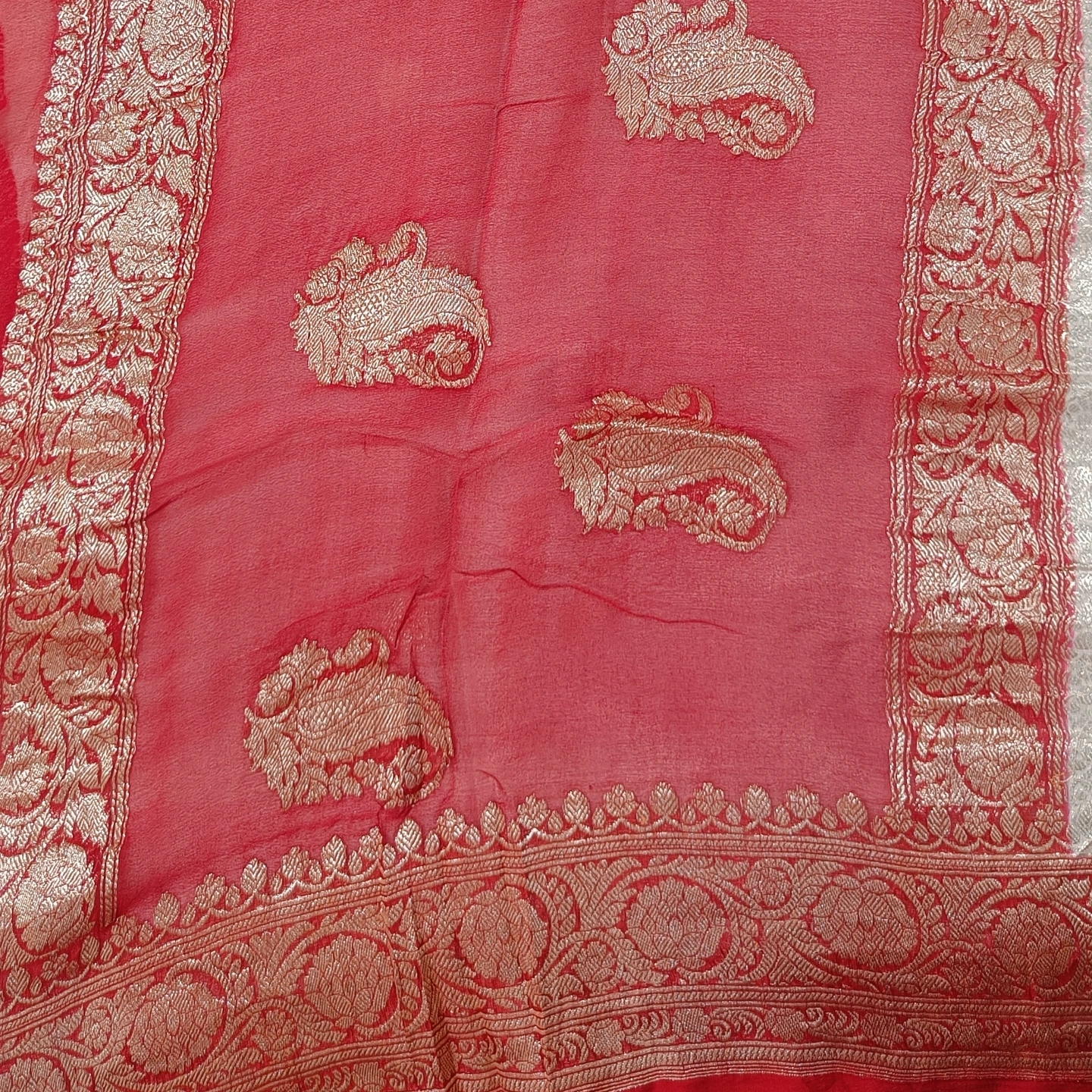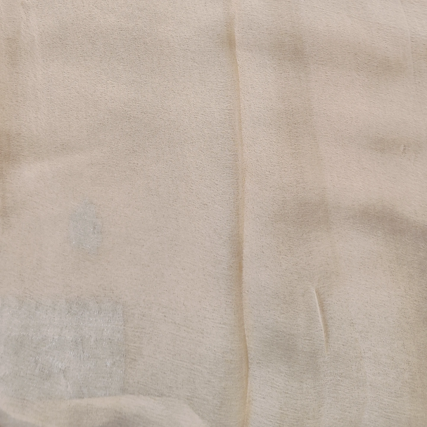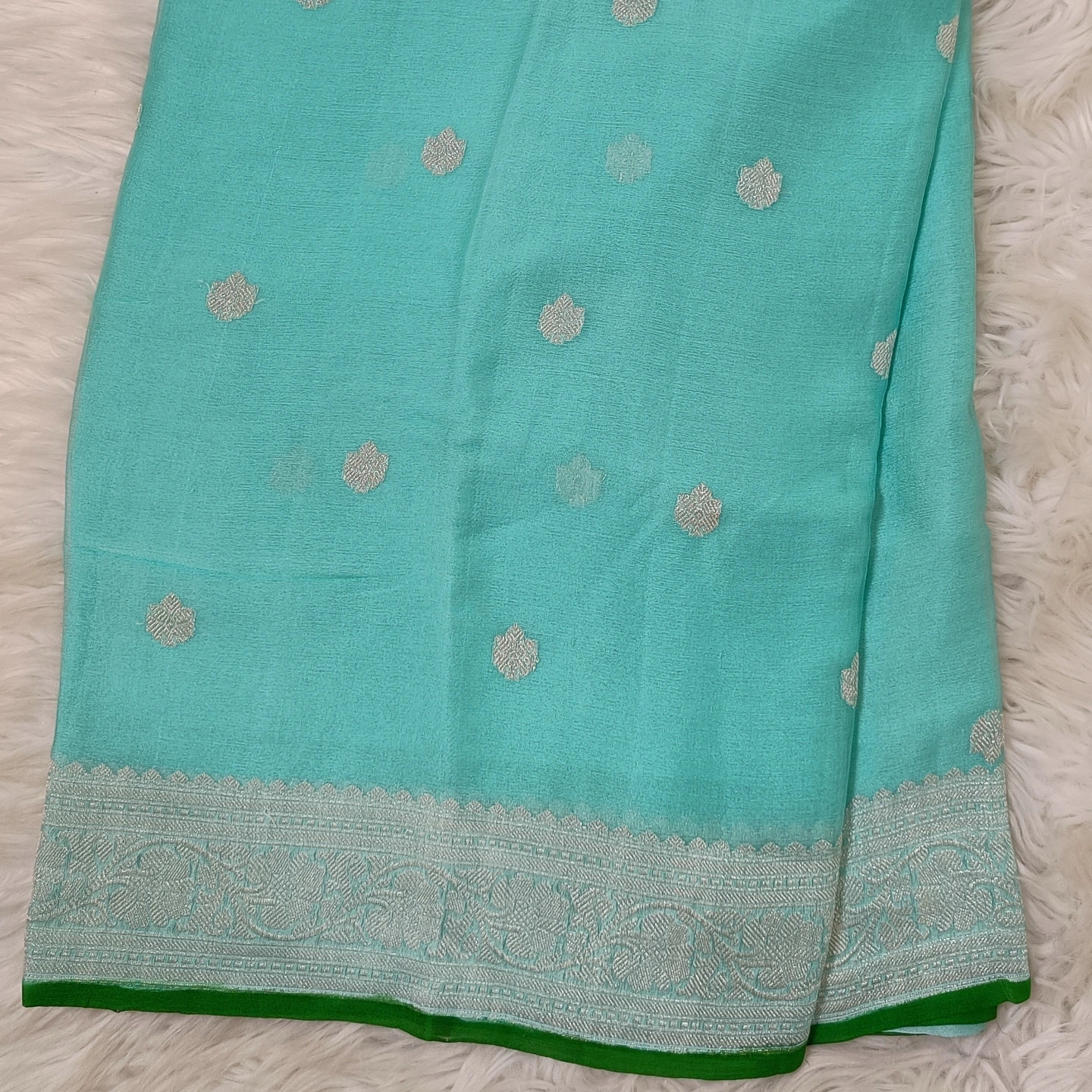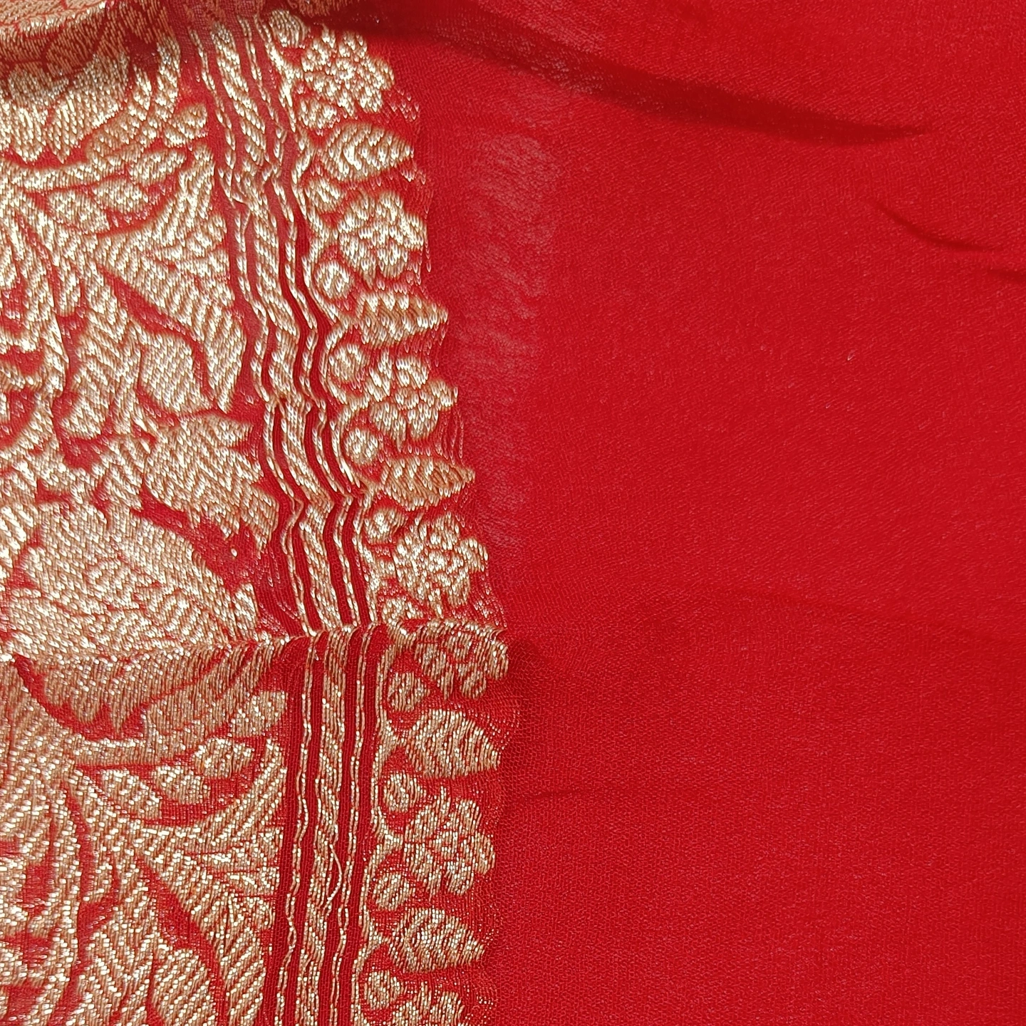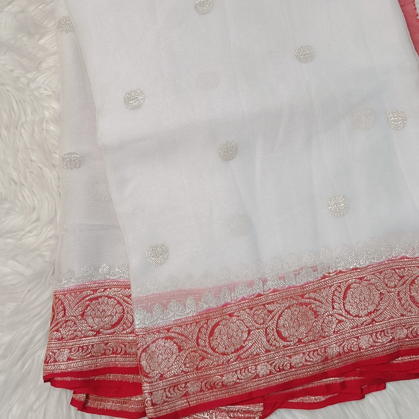 This exquisite fabric represents the pinnacle of Banarasi handloom artistry, combining the breezy lightness of Khaddi Georgette Chiffon with traditional ornamentation. The body of the fabric is a pristine, translucent alabaster white, featuring a soft, crinkled texture that offers a graceful and fluid drape. It is delicately embellished with silver zari floral buttis, woven with precision to create a subtle yet radiant shimmer across the field. The piece is defined by its striking vermilion red border, which provides a bold, celebratory contrast. This border is intricately detailed with traditional scrolling vine and floral motifs in opulent silver zari, finished with a fine scalloped edge. A timeless choice for weddings or high-profile festivities, this fabric effortlessly balances the weightlessness of chiffon with the royal heritage of Banarasi weaving.