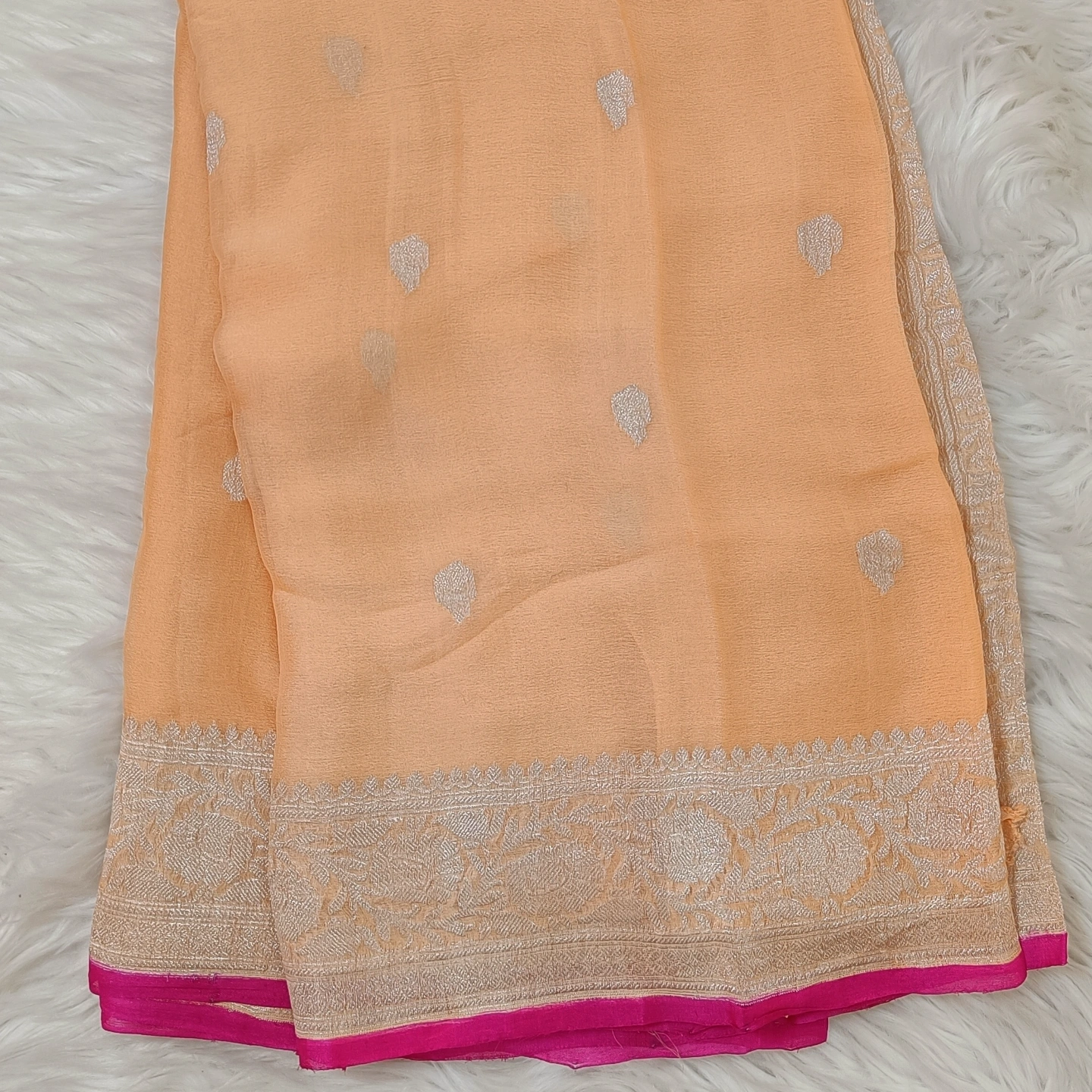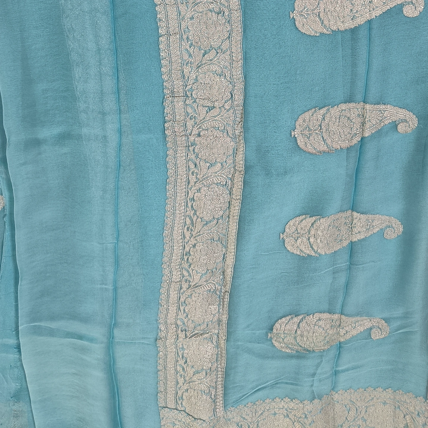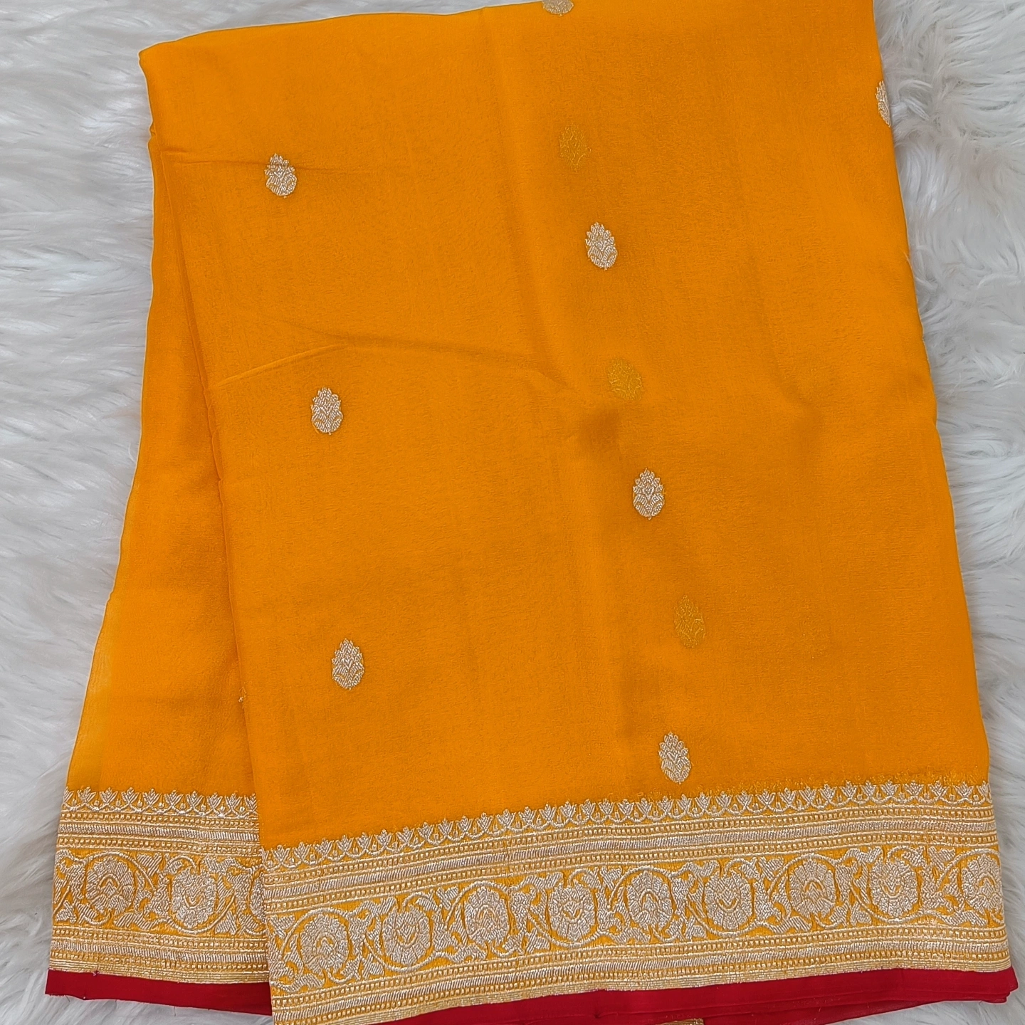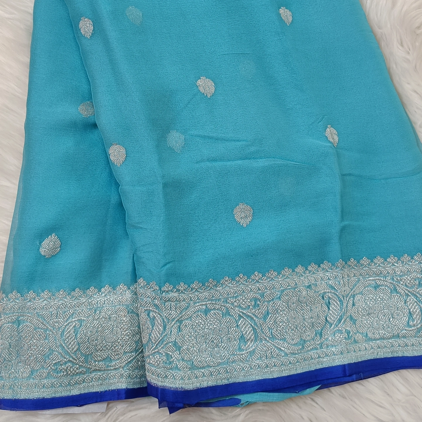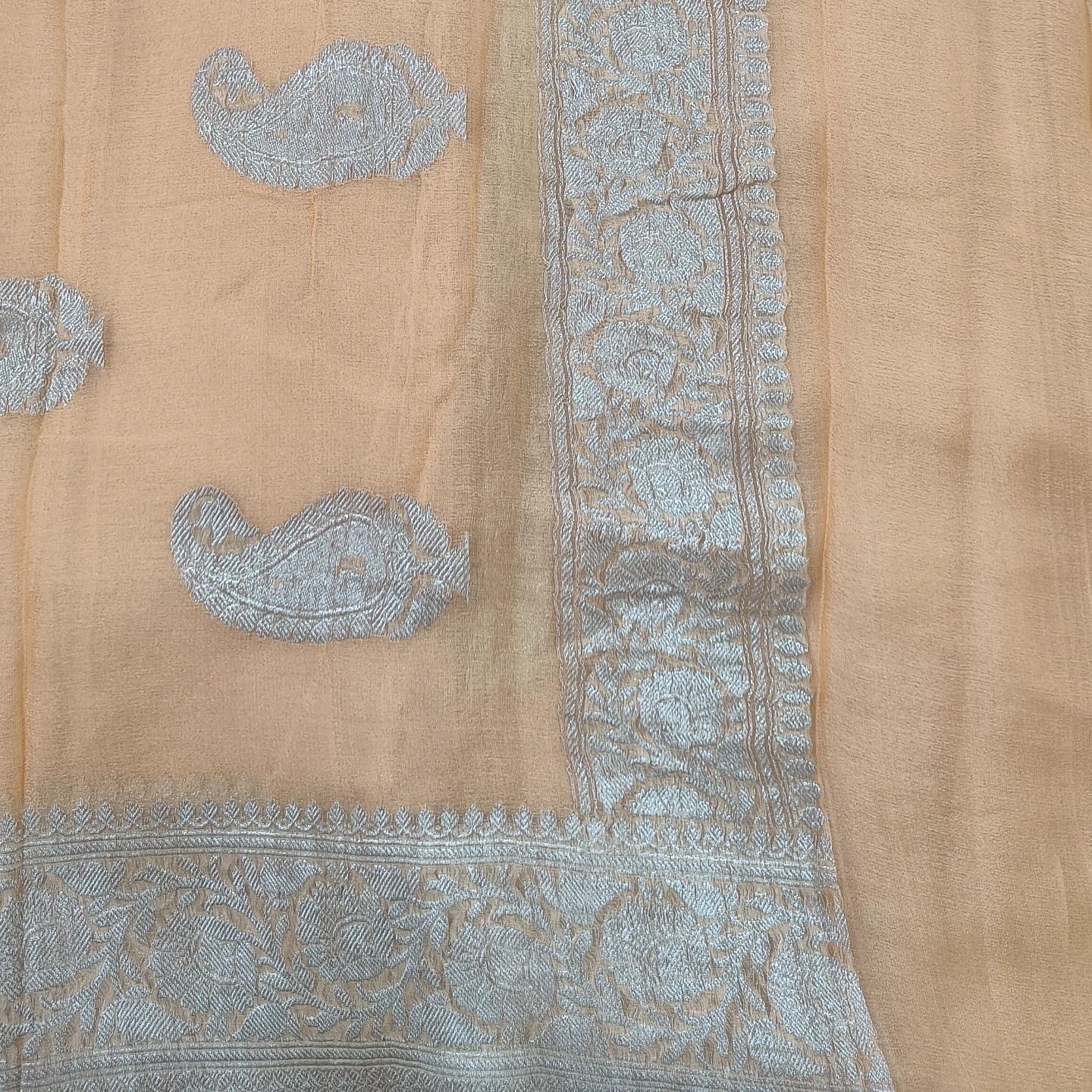 This exquisite fabric represents the pinnacle of Banarasi handloom artistry, combining the breezy lightness of Khaddi Georgette Chiffon with traditional ornamentation. The body of the fabric is a pristine, translucent alabaster white, featuring a soft, crinkled texture that offers a graceful and fluid drape. It is delicately embellished with silver zari floral buttis, woven with precision to create a subtle yet radiant shimmer across the field. The piece is defined by its striking vermilion red border, which provides a bold, celebratory contrast. This border is intricately detailed with traditional scrolling vine and floral motifs in opulent silver zari, finished with a fine scalloped edge. A timeless choice for weddings or high-profile festivities, this fabric effortlessly balances the weightlessness of chiffon with the royal heritage of Banarasi weaving.