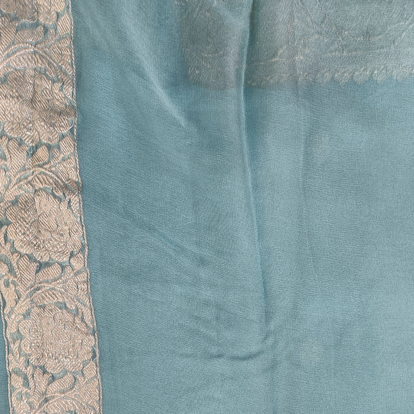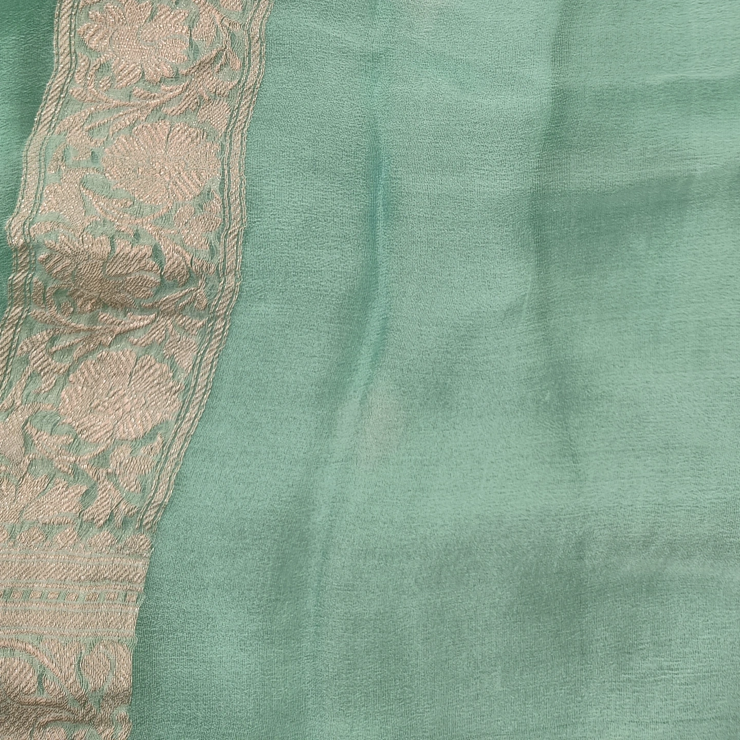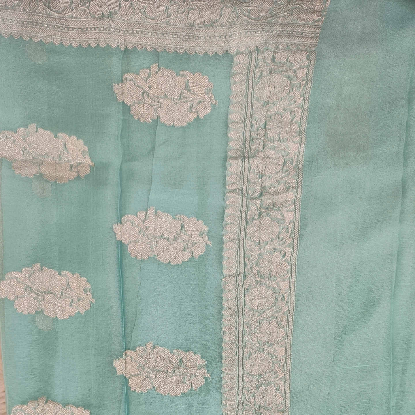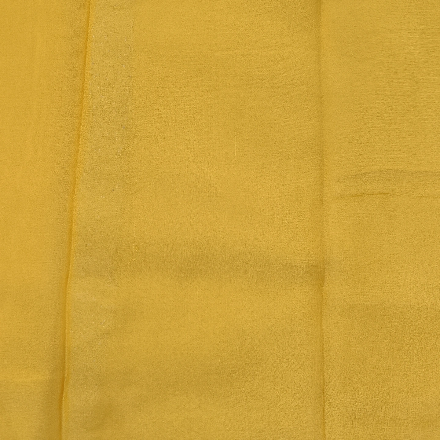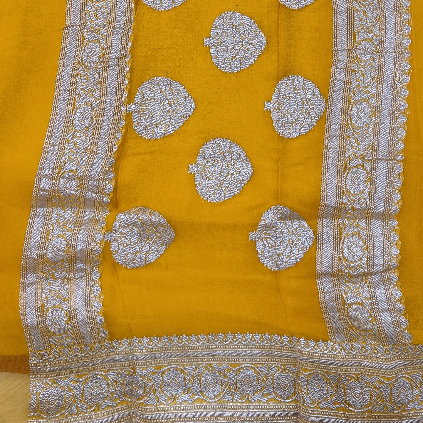 This exquisite fabric represents the pinnacle of Banarasi handloom artistry, combining the breezy lightness of Khaddi Georgette Chiffon with traditional ornamentation. The body of the fabric is a pristine, translucent alabaster white, featuring a soft, crinkled texture that offers a graceful and fluid drape. It is delicately embellished with silver zari floral buttis, woven with precision to create a subtle yet radiant shimmer across the field. The piece is defined by its striking vermilion red border, which provides a bold, celebratory contrast. This border is intricately detailed with traditional scrolling vine and floral motifs in opulent silver zari, finished with a fine scalloped edge. A timeless choice for weddings or high-profile festivities, this fabric effortlessly balances the weightlessness of chiffon with the royal heritage of Banarasi weaving.