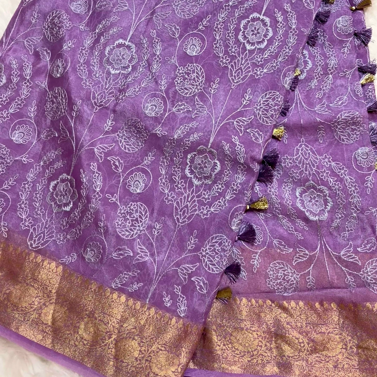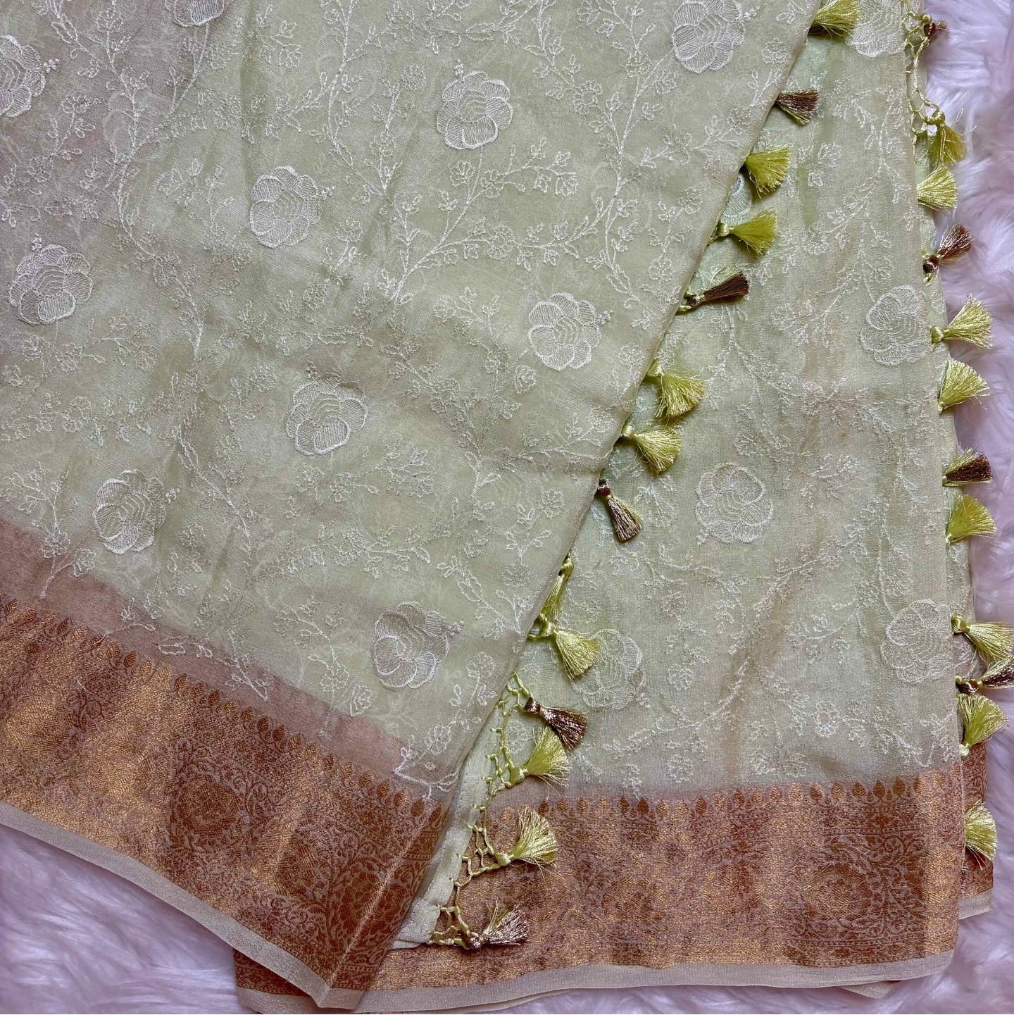 The design features an all-over chikankari pattern of floral vines and botanical motifs, intricately embroidered in a continuous, flowing layout. The fine threadwork forms blossoms, leaves, and slender stems, creating a soft, graceful rhythm across the fabric. The embroidery is evenly spread, giving it a refined and understated appeal. A traditional woven border adds depth, while tassel detailing along the edges enhances its artisanal charm.