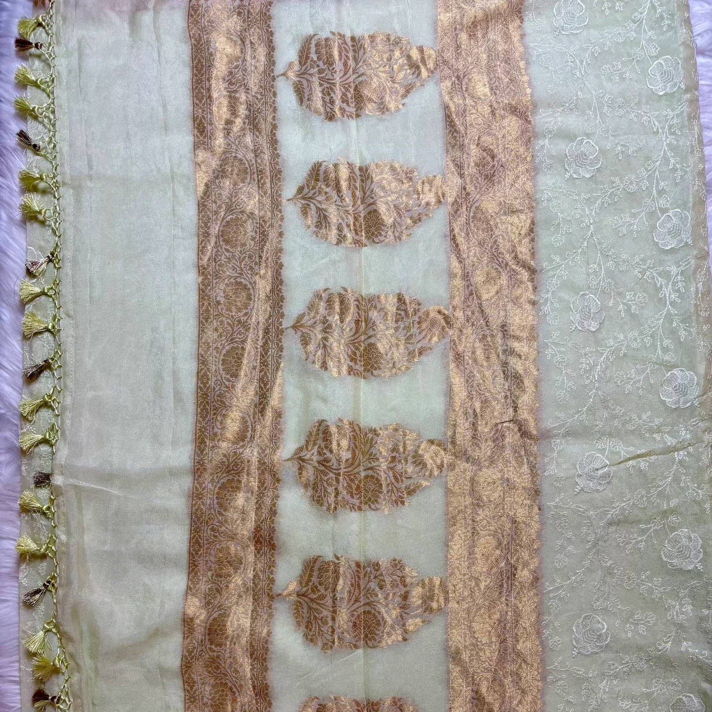 Khaddi chiffon with chikankari work is a lightweight, airy fabric known for its soft texture and fluid drape. The khaddi weave gives it a slightly textured feel, while chikankari embroidery adds a delicate, handcrafted elegance with fine threadwork that feels subtle yet rich.