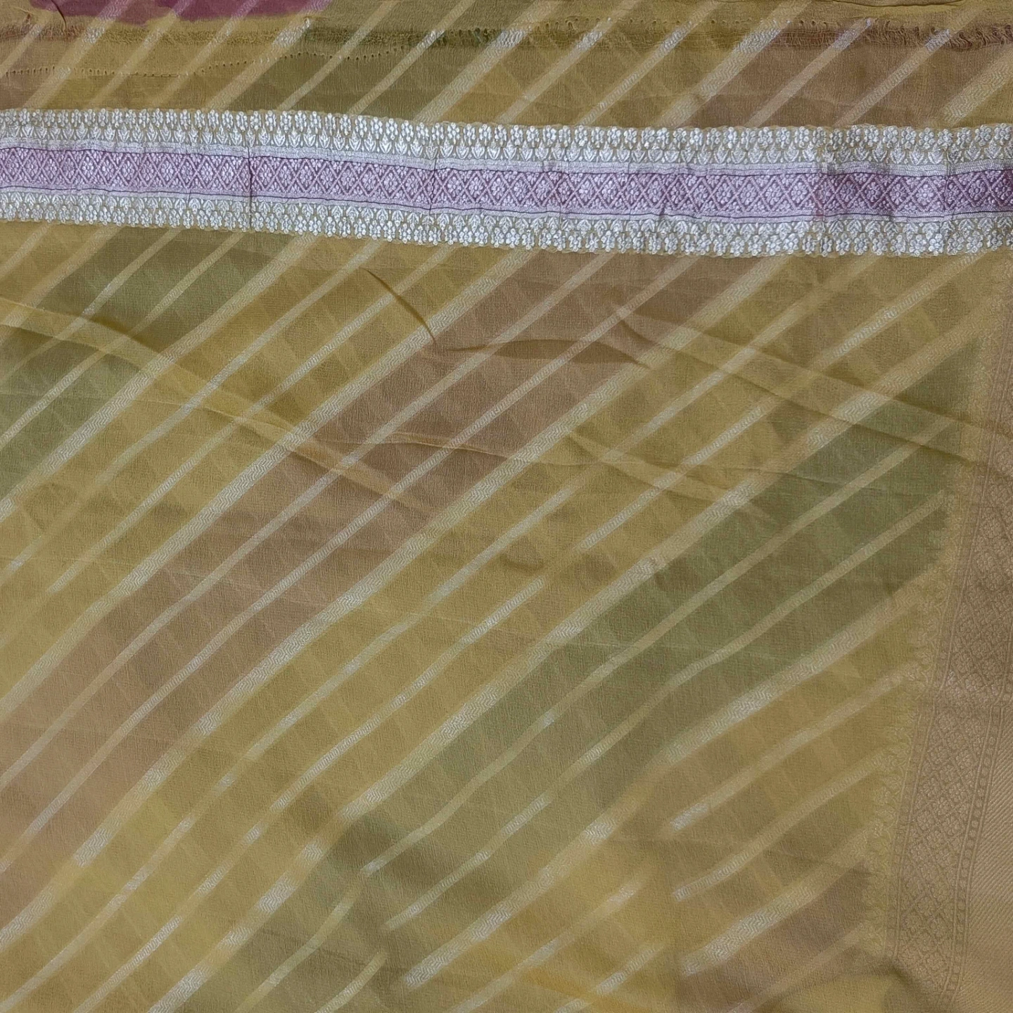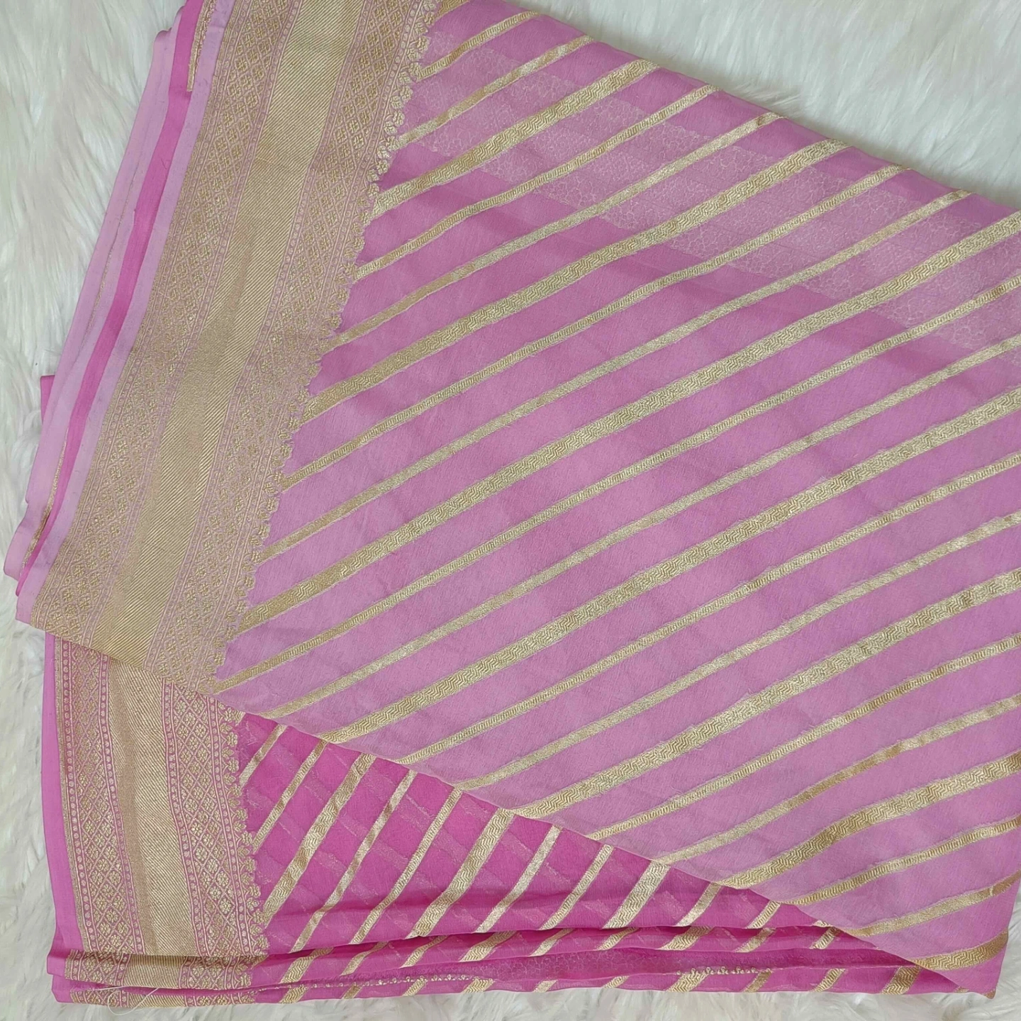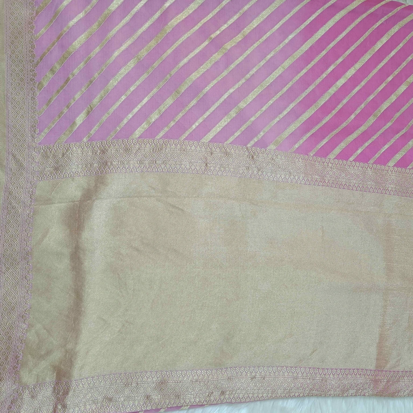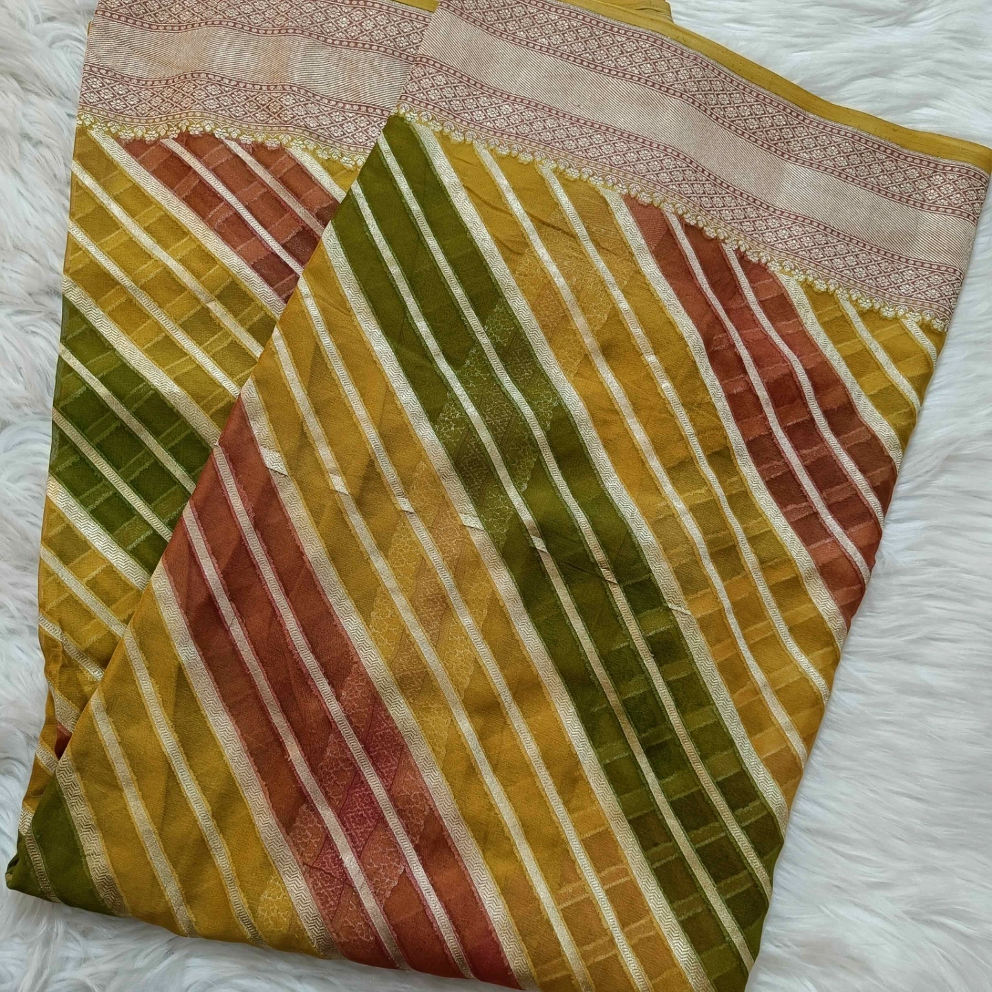 Crafted from fine khaddi georgette, this saree showcases the distinctive rangkat weaving technique, forming a seamless play of diagonal patterns across the fabric. The soft, fluid texture of the georgette ensures an elegant drape, while the rhythmic stripe composition adds movement and depth. Complemented by a finely woven border with intricate detailing, this piece reflects a harmonious blend of traditional craftsmanship and contemporary grace.
