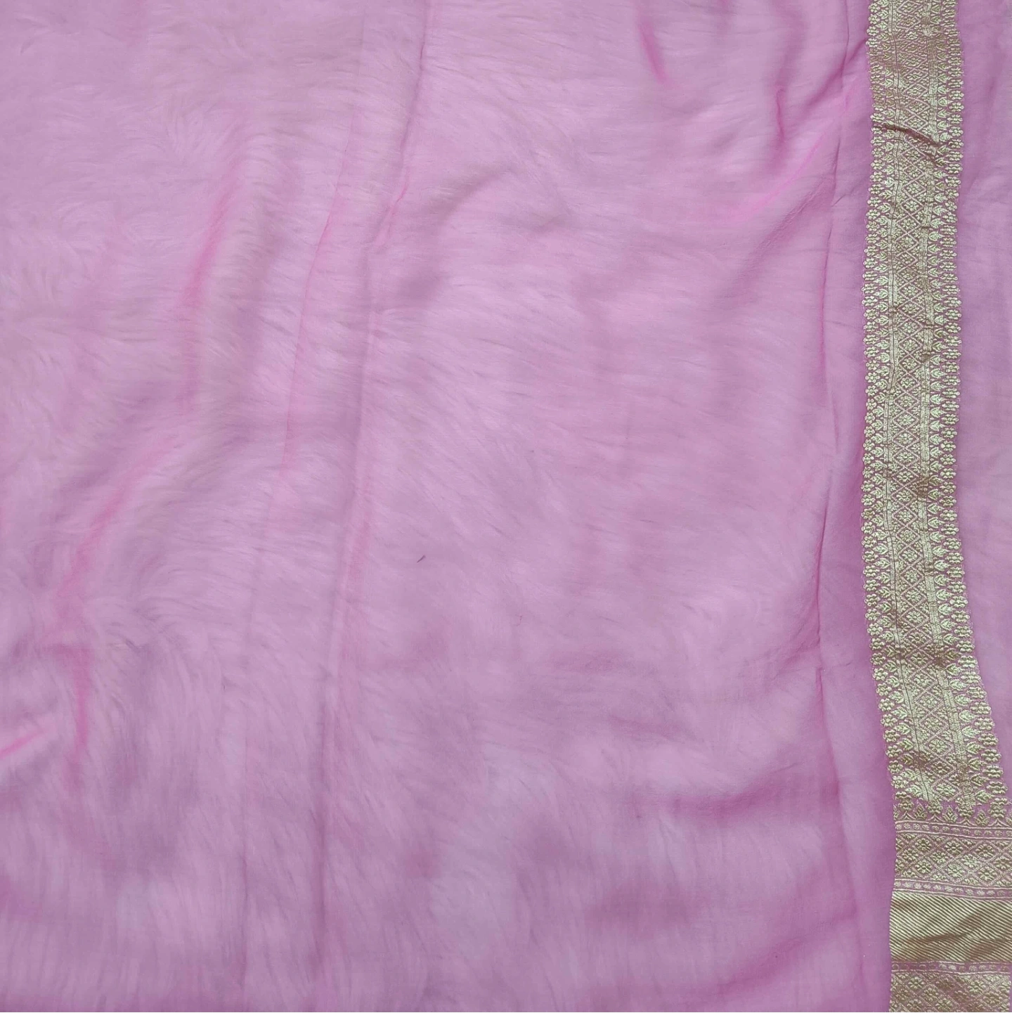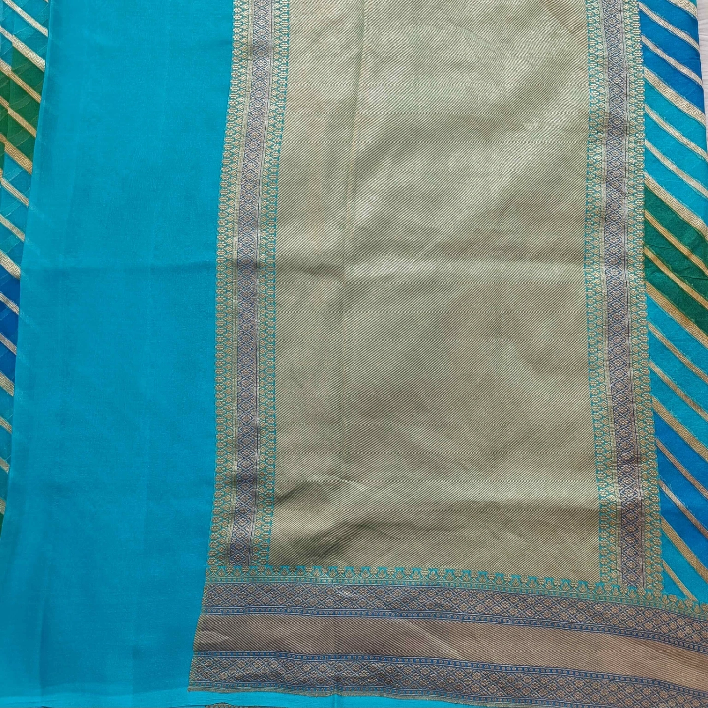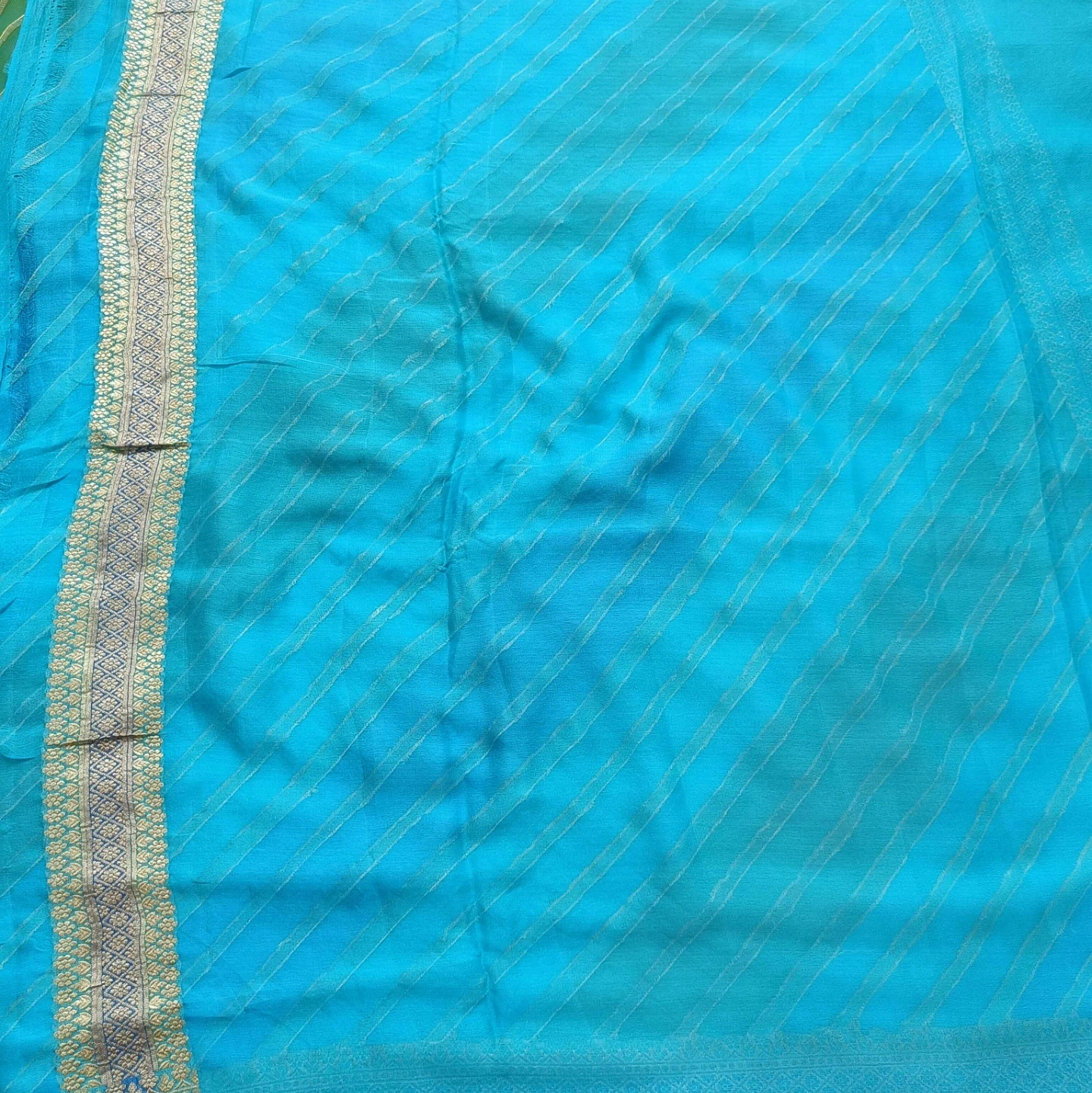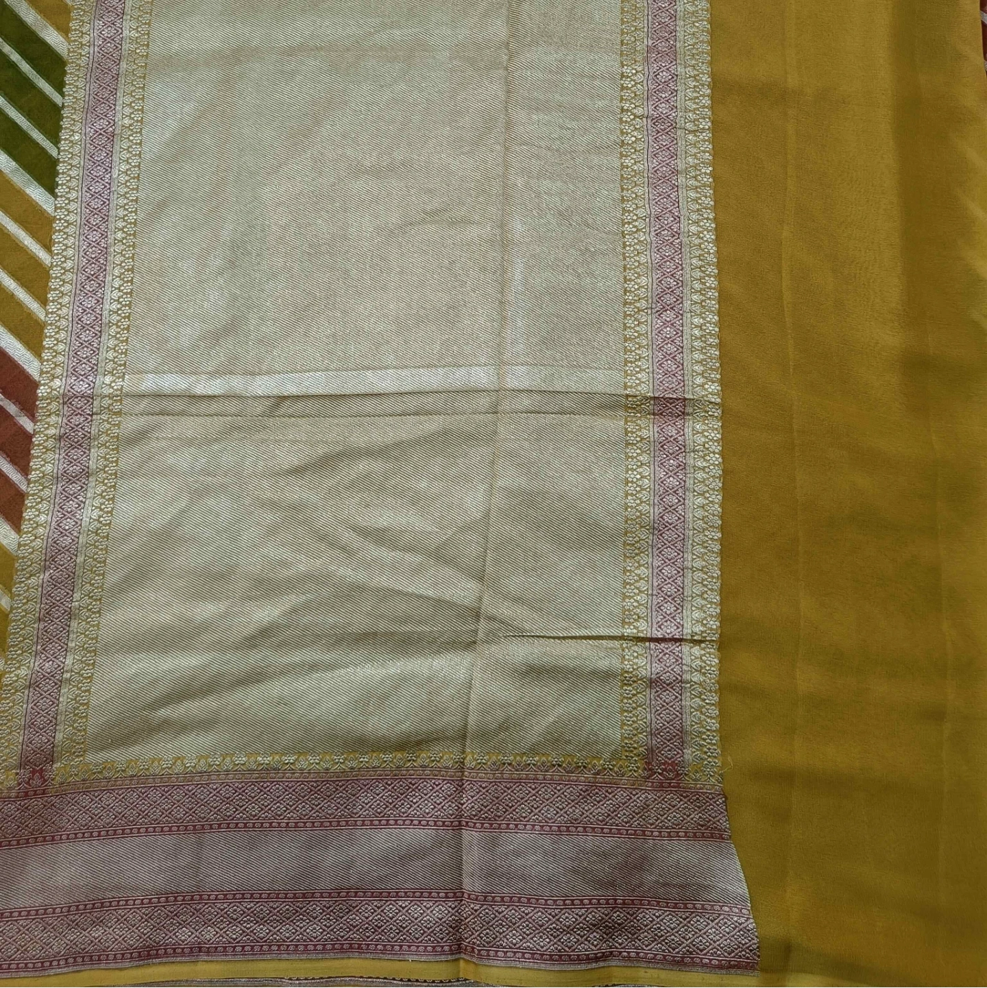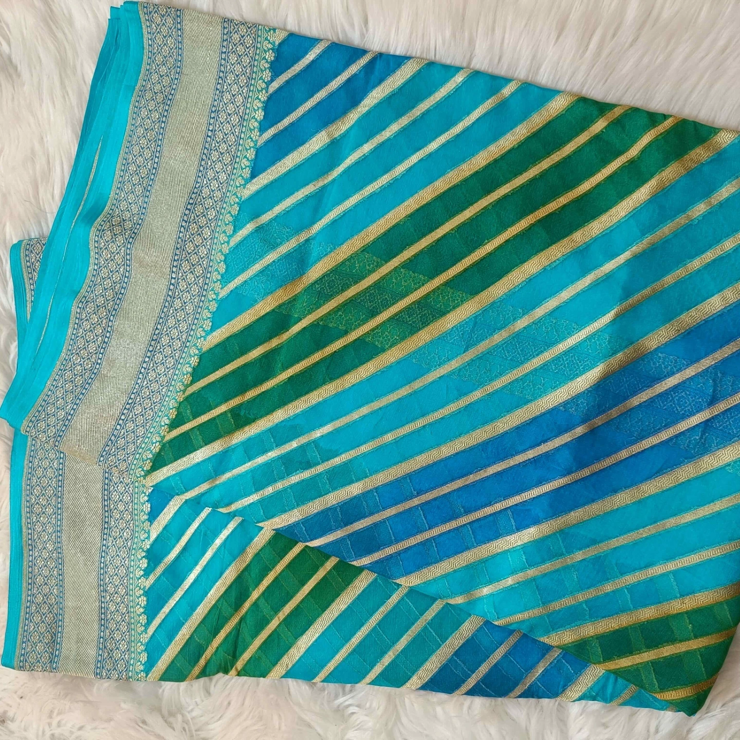 Crafted from fine khaddi georgette, this saree showcases the distinctive rangkat weaving technique, forming a seamless play of diagonal patterns across the fabric. The soft, fluid texture of the georgette ensures an elegant drape, while the rhythmic stripe composition adds movement and depth. Complemented by a finely woven border with intricate detailing, this piece reflects a harmonious blend of traditional craftsmanship and contemporary grace.