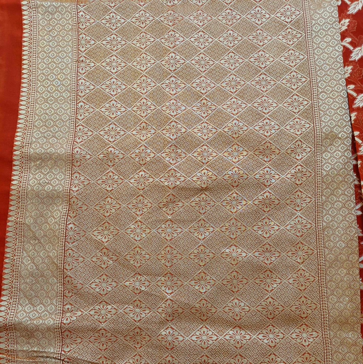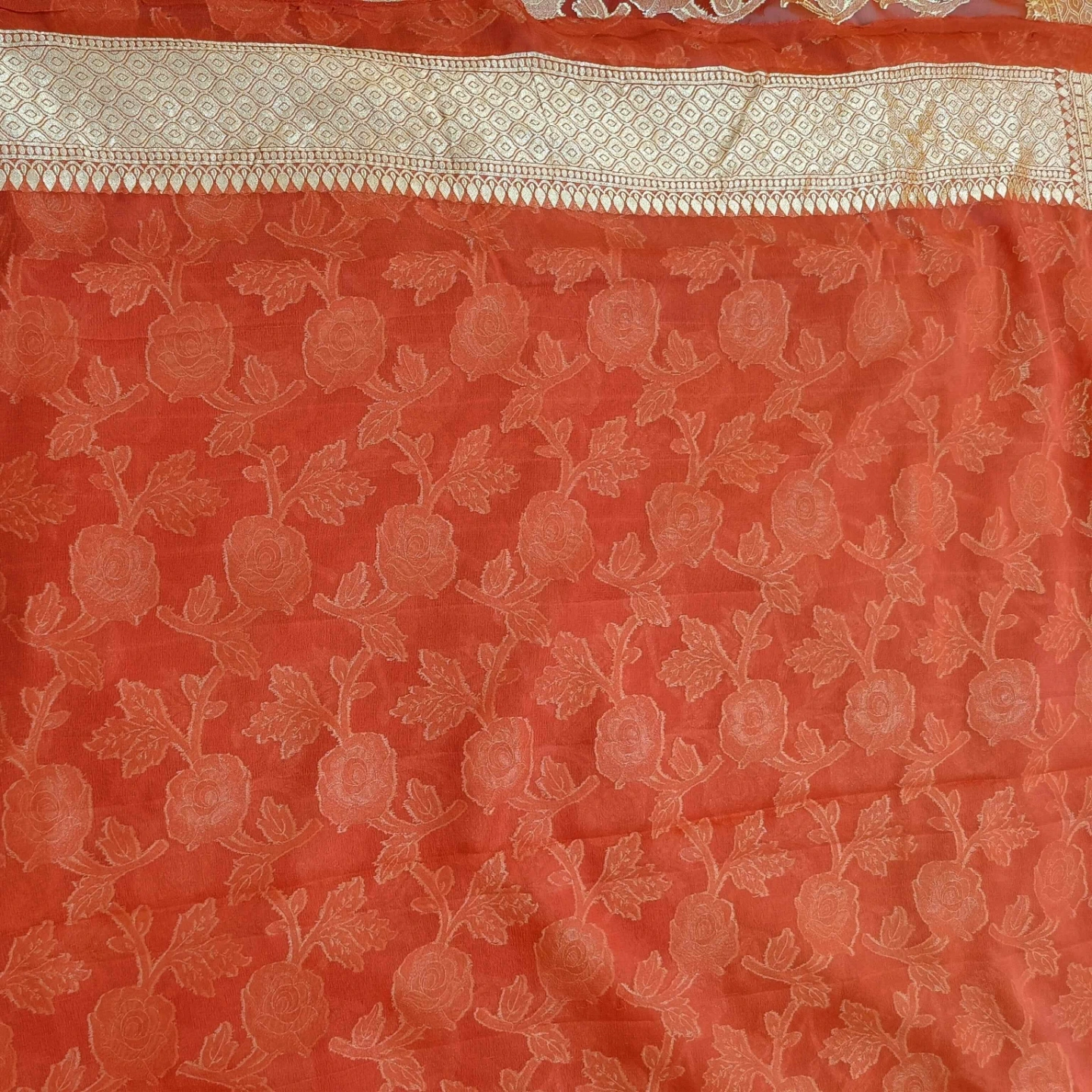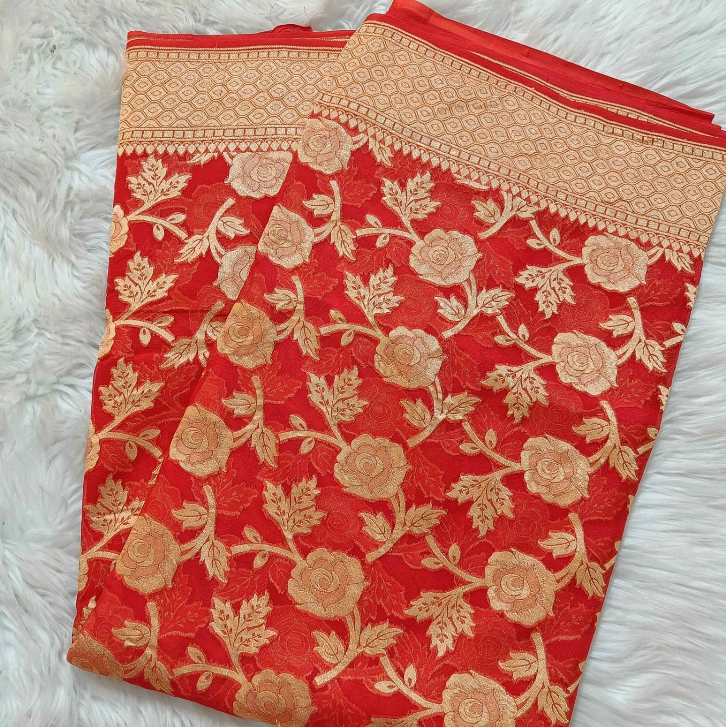 Crafted from fine khaddi georgette, this saree features a beautifully woven rose jaal pattern that spreads gracefully across the fabric, creating a rich and timeless appeal. The soft, flowy texture of the georgette lends an effortless drape, while the intricate floral weaving adds depth and elegance. Finished with a delicately detailed border, this piece blends traditional artistry with a refined, graceful charm—perfect for occasions that call for classic sophistication.
