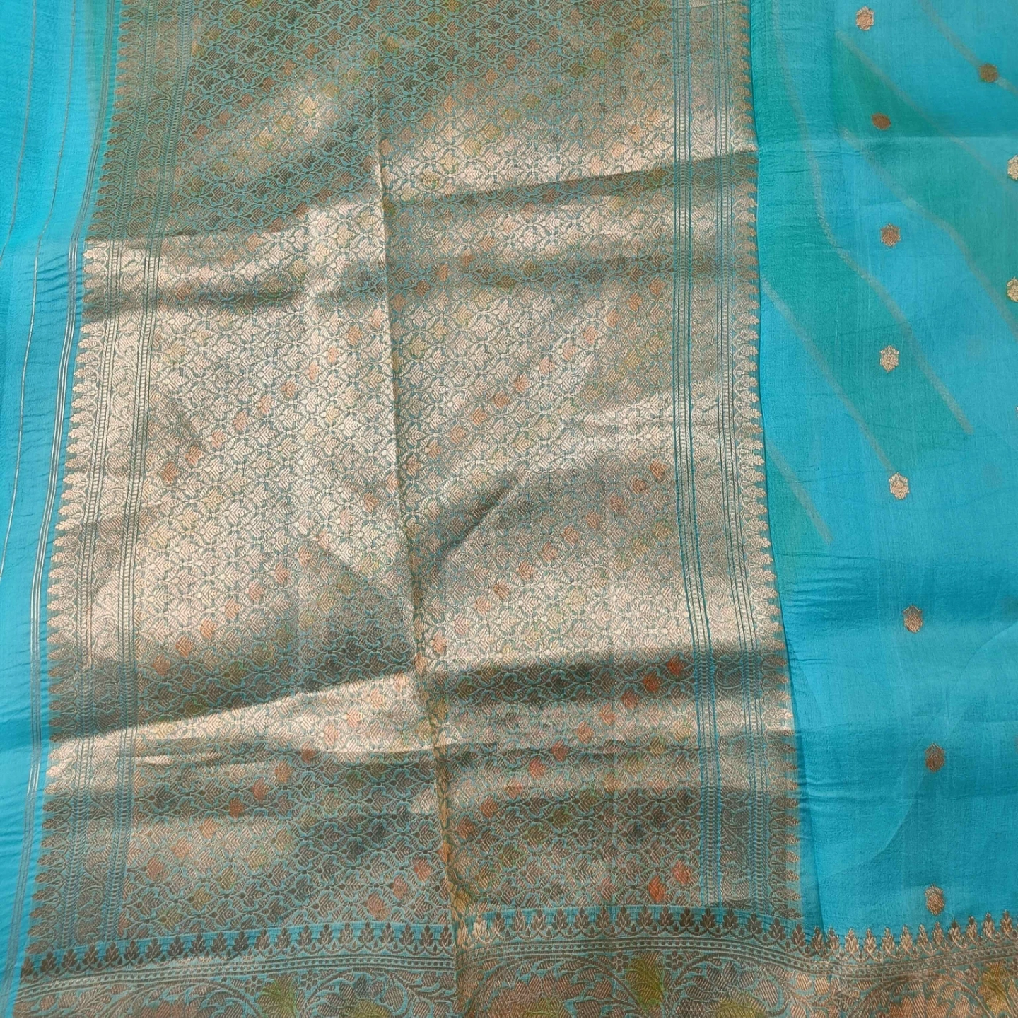 A graceful kora saree adorned with delicate butidar motifs scattered across the body, creating a subtle and refined pattern. The intricately woven border features traditional floral vines, adding richness and definition to the drape. Light, airy, and effortlessly elegant, this piece blends classic craftsmanship with a fresh, contemporary charm—perfect for both daytime celebrations and intimate gatherings.