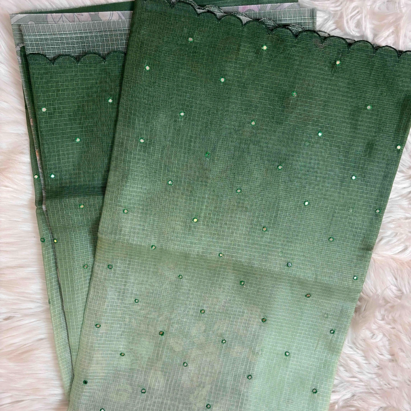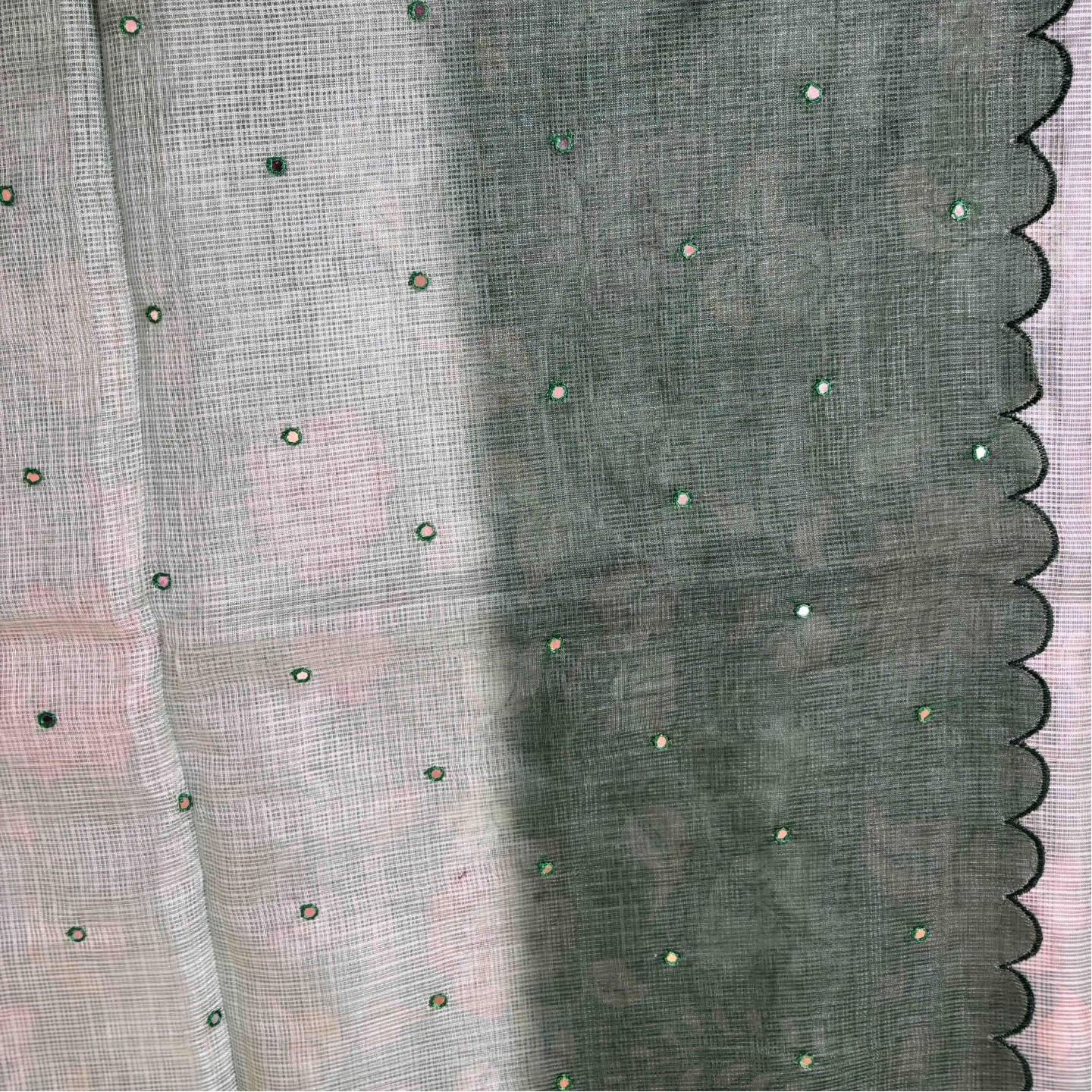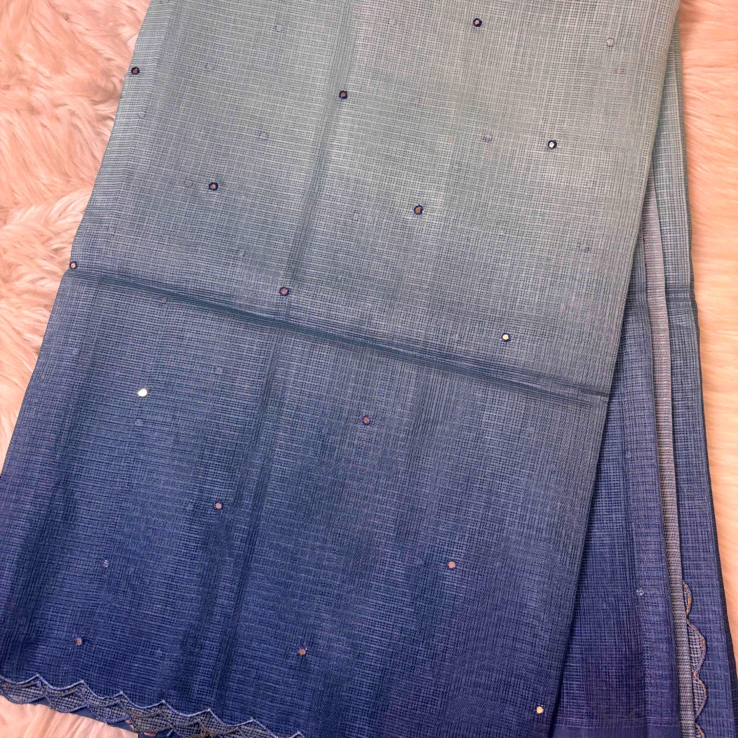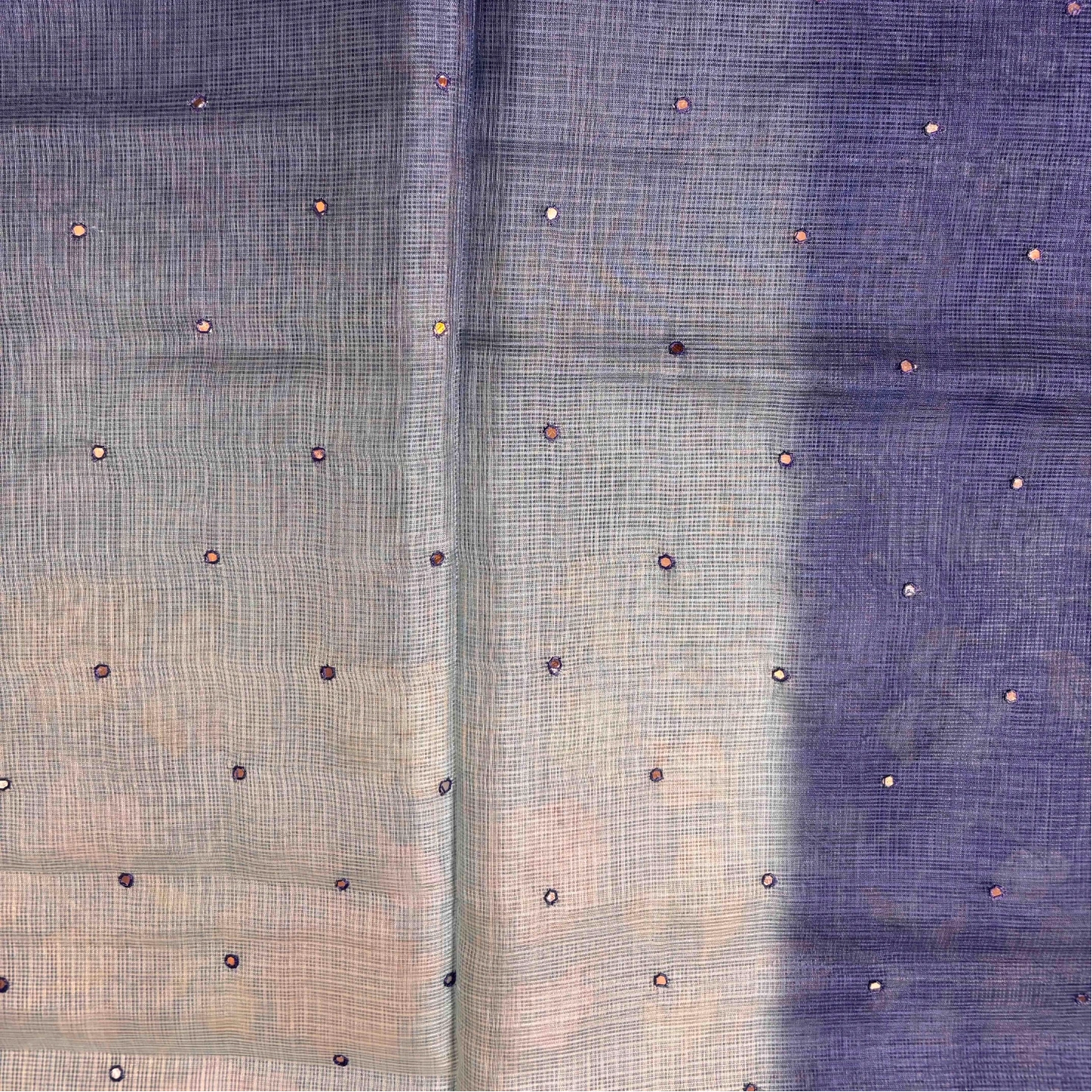 Crafted in airy kota cotton, this saree features a graceful ombre transition that flows seamlessly across the drape. Delicately scattered mirror work adds a subtle sparkle, enhancing its light and breezy texture. Finished with a softly detailed border, it offers an elegant blend of minimal charm and refined craftsmanship, perfect for effortless day-to-evening wear.