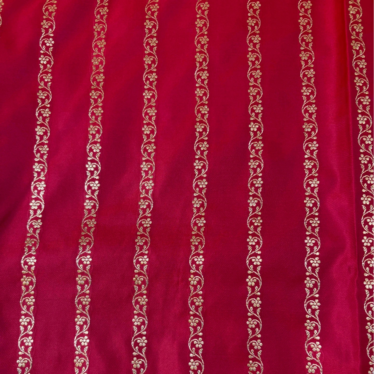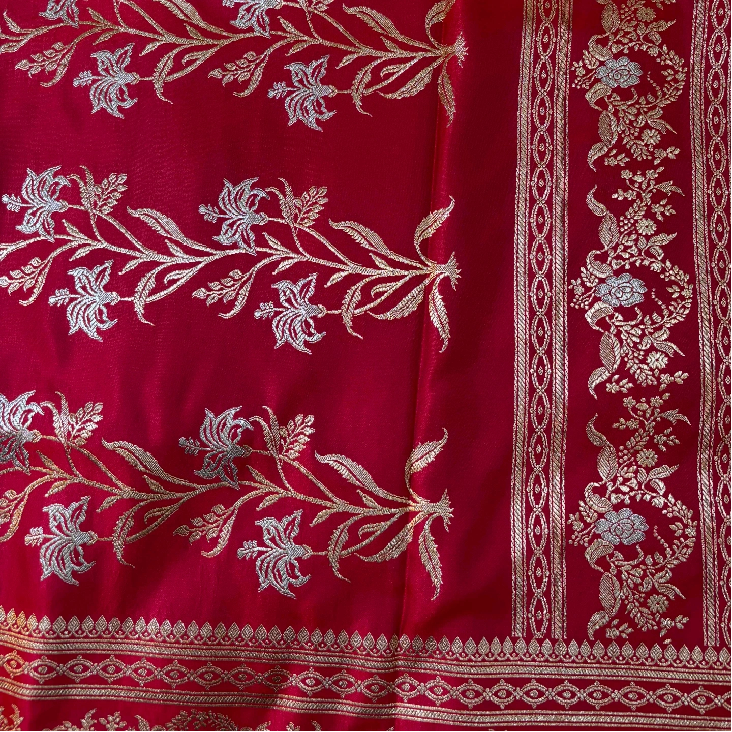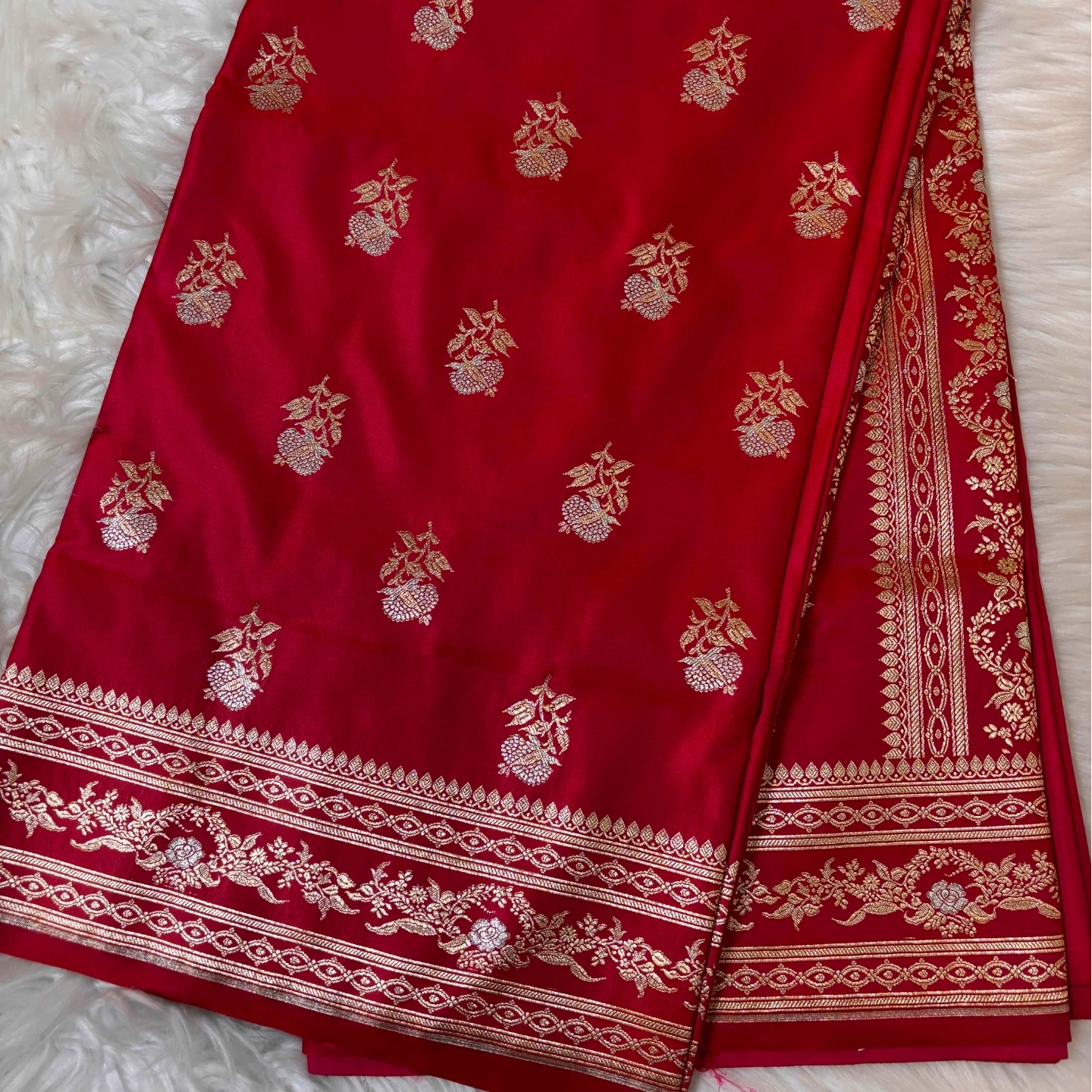 An exquisite Mashru saree adorned with finely woven sona rupa zari butta motifs, creating a rich interplay of texture and sheen across the fabric. The smooth, lustrous base enhances the brilliance of the intricate detailing, while the ornate border with traditional floral and geometric patterns adds depth and grandeur. A timeless piece that beautifully blends heritage craftsmanship with festive elegance.