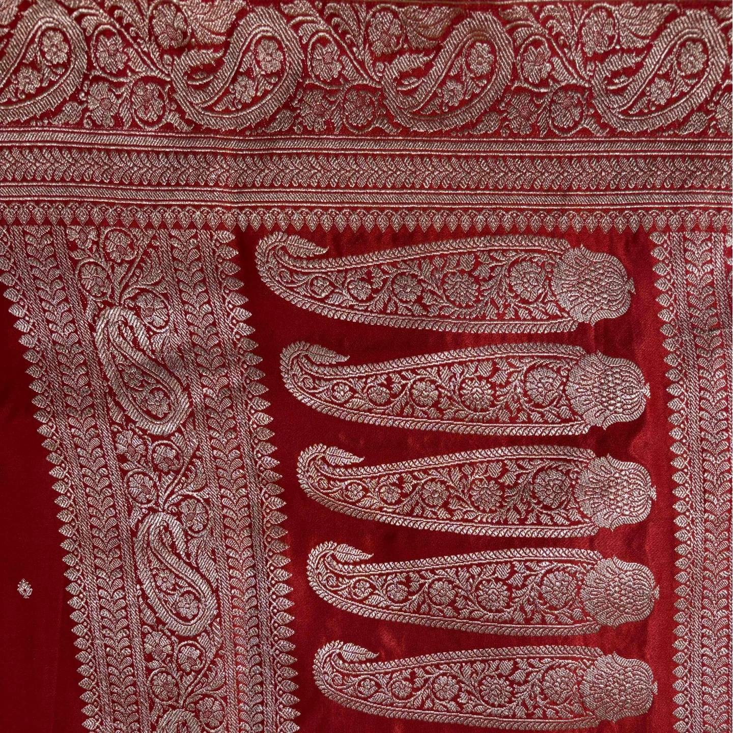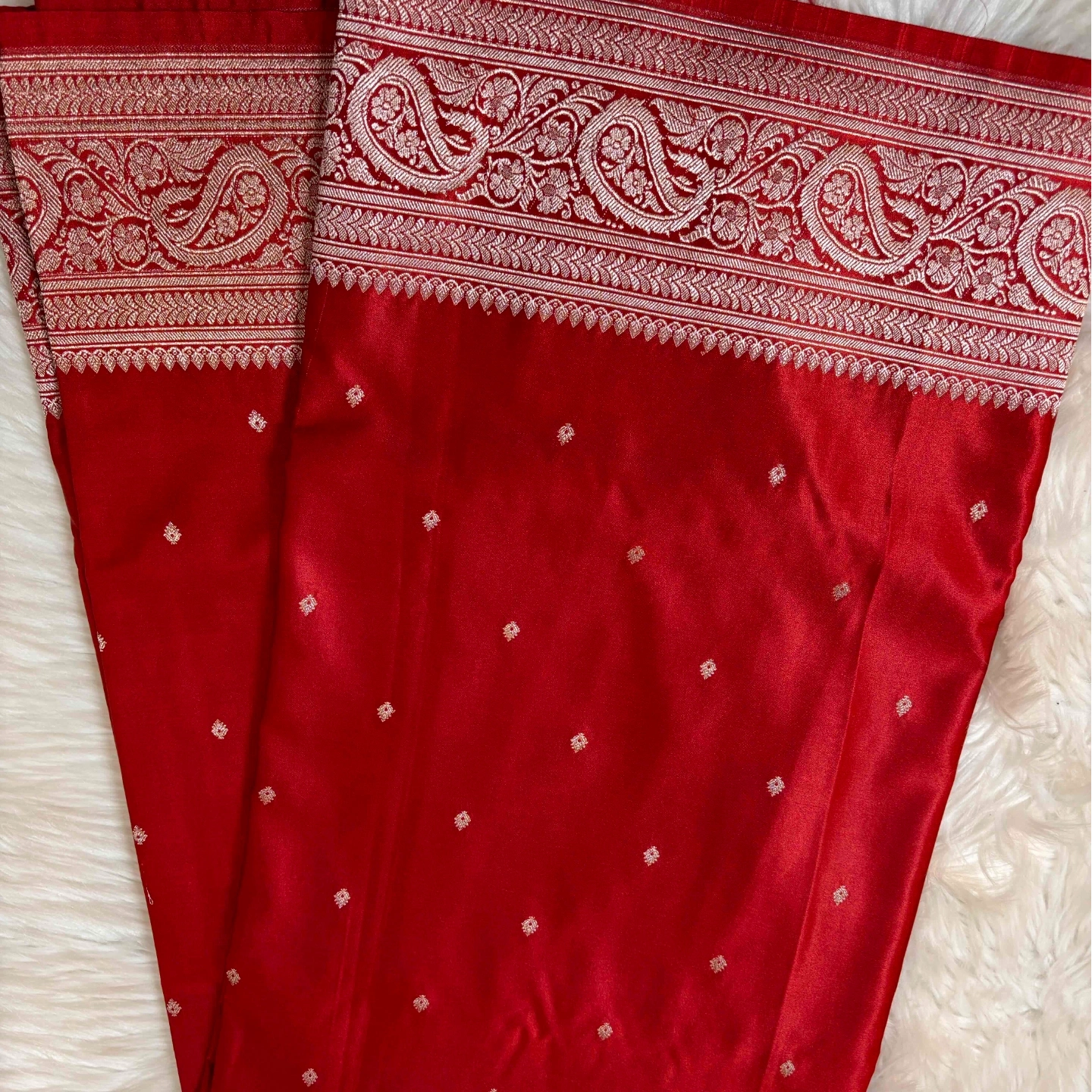 A graceful Mashru saree featuring a soft fade effect that adds depth and dimension to its lustrous surface. The body is adorned with delicate scattered butta motifs, creating a subtle yet elegant rhythm across the drape. Accentuated by a richly woven border with intricate traditional patterns, this saree beautifully balances minimal charm with heritage detailing—ideal for both festive wear and refined occasions.