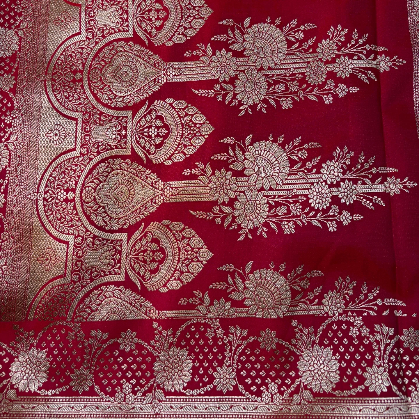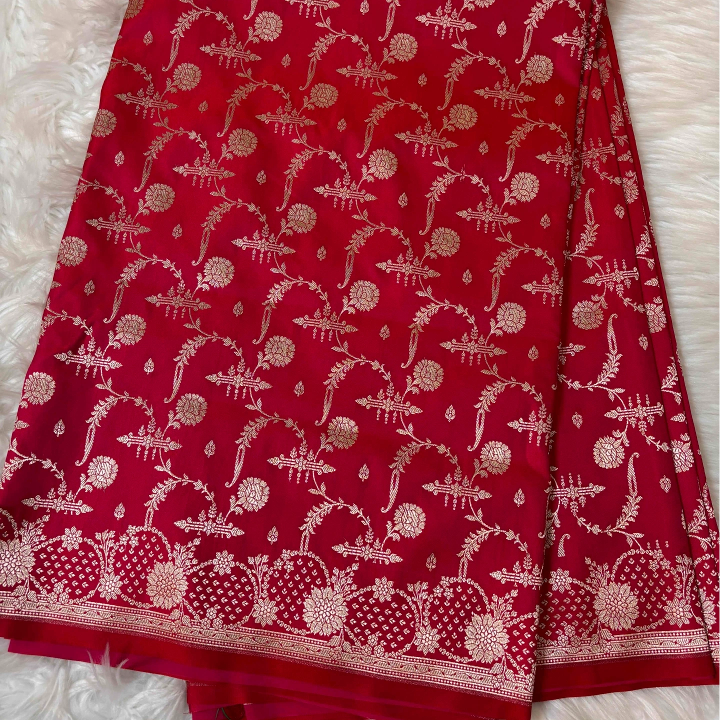 A stunning Mashru saree crafted in a rich dual-tone finish, adorned with an all-over jangla weave that flows gracefully across the fabric. The intricate vine and floral motifs create a continuous tapestry of elegance, beautifully complemented by a finely detailed border that adds depth and grandeur. With its lustrous texture and heritage-inspired design, this saree is a perfect choice for festive occasions and statement celebrations.