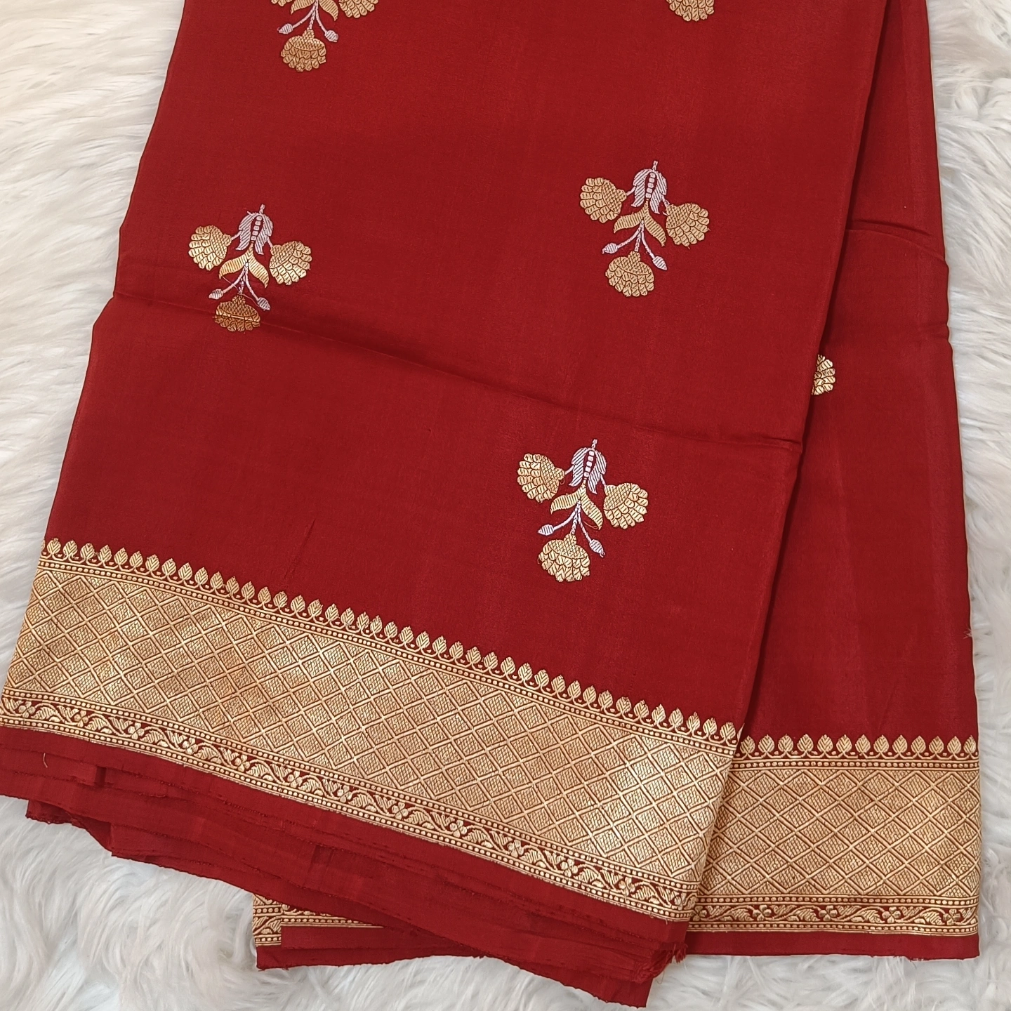 This is a Mashru Silk Kadwa Flower Butta Saree, an exquisite example of traditional weaving techniques meeting high-fashion textiles. The saree is made from Mashru silk, a fabric celebrated for its rich, satin-like surface that provides a deep, matte-gloss finish and a substantial, luxurious drape. The defining element of this piece is the Kadwa Flower Butta, where each floral motif is individually hand-woven into the fabric rather than being printed or embroidered. These tri-petaled floral sprays are crafted with meticulous detail, featuring a blend of shimmering metallic tones that create a three-dimensional effect across the body of the saree.