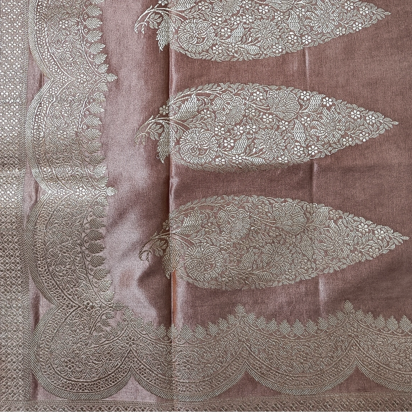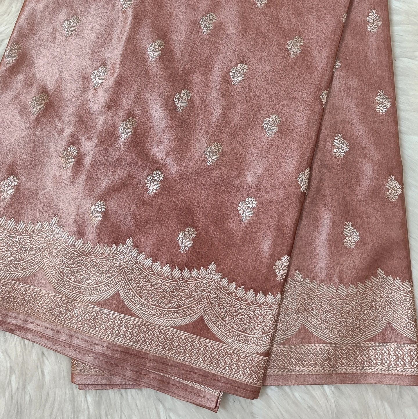 This elegant Mashru silk saree, crafted on a high-precision machine loom, offers a contemporary take on a traditional weave known for its characteristic satin-like finish and luxurious weight. The body of the garment is peppered with delicate, shimmering buttis that catch the light beautifully, providing a subtle texture against the smooth fabric. A standout feature is the unique scalloped Zari border, which showcases intricate geometric and floral patterns, lending a modern architectural edge to the classic silhouette. Designed for those who appreciate understated glamour, this saree combines the strength of modern weaving techniques with the timeless charm of metallic embroidery, making it a versatile choice for evening receptions and formal gatherings alike.