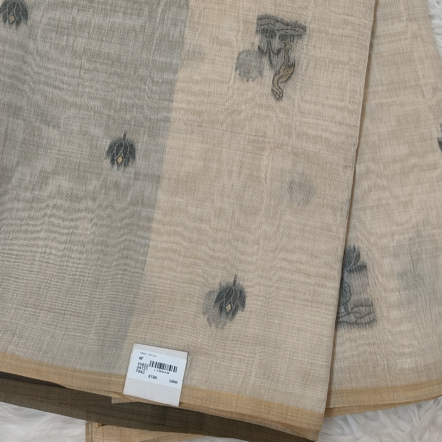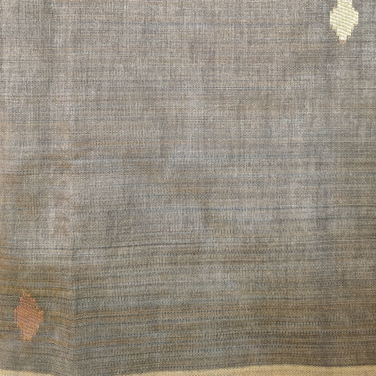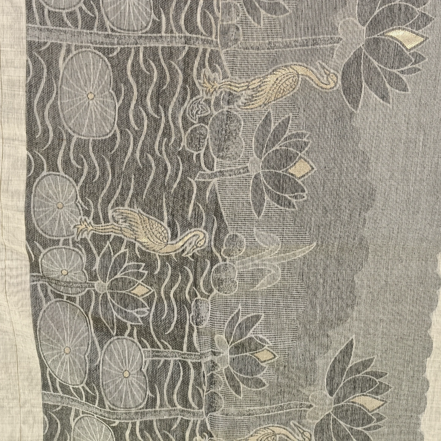 A lightweight Mulchanderi cotton saree in soft dual tones of grey and beige, featuring delicate lotus butta motifs with a unique flamingo-inspired design. Its subtle texture and minimal pattern offer an elegant, breathable drape perfect for understated everyday wear.
