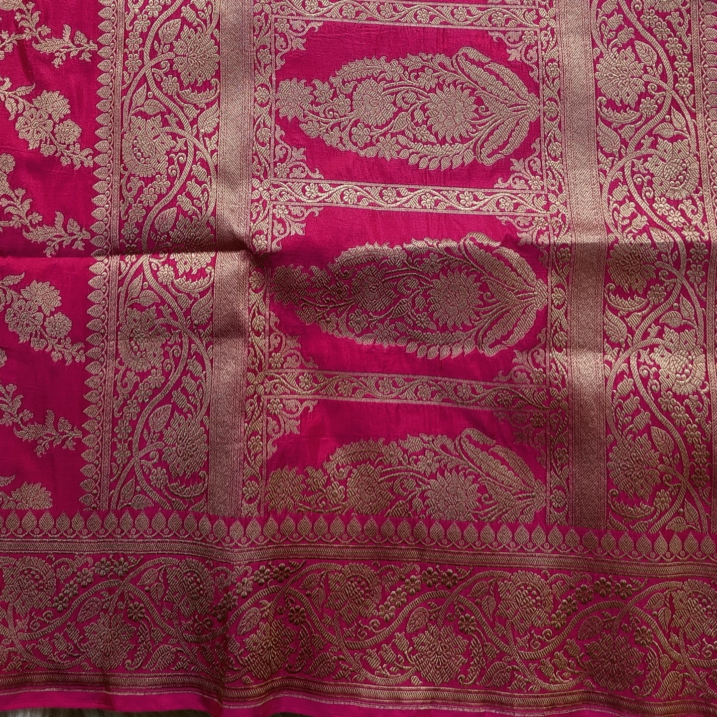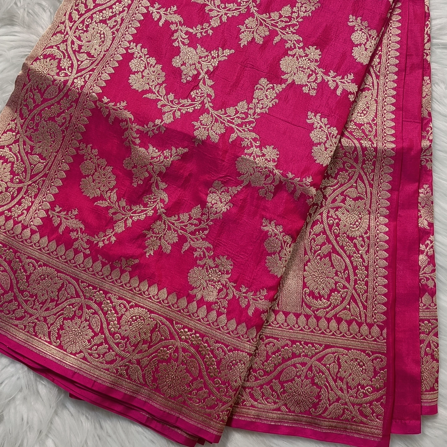 Woven in pure Katan silk, this saree features the richness of traditional saal weaving, showcasing an intricate floral jaal spread gracefully across the body. The finely detailed border enhances its regal appeal, while the lustrous texture adds depth and elegance to the overall look. A perfect blend of heritage craftsmanship and timeless sophistication, ideal for grand festive and celebratory occasions.