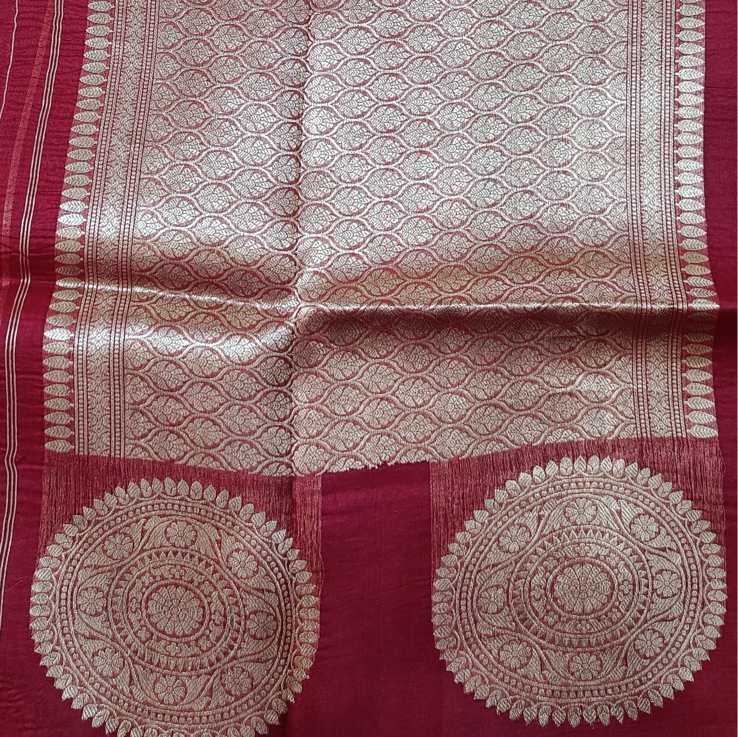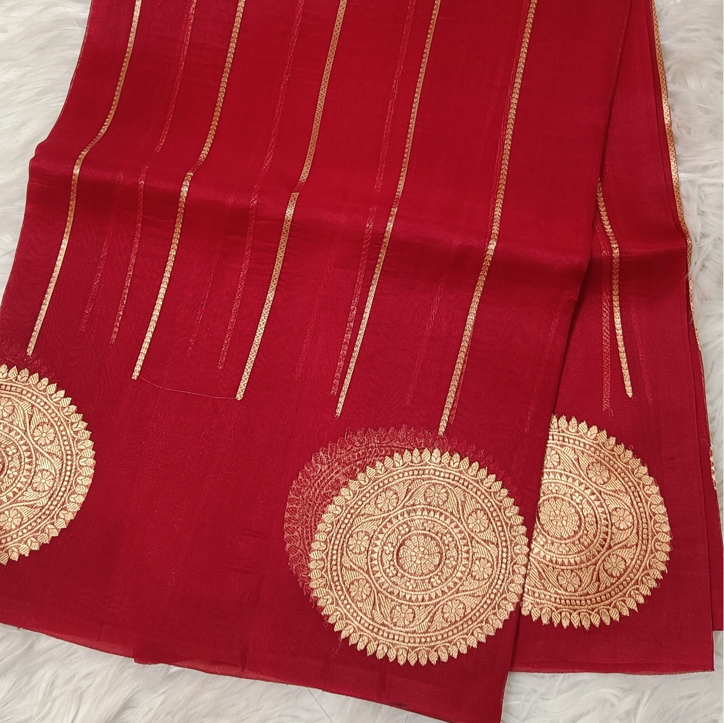 An elegant blend of lightness and grandeur, this organza silk saree features striking circular butta motifs reminiscent of intricate chakras, lending it a bold yet graceful character. The sheer, airy texture of the fabric enhances its fluid drape, while the delicate vertical zari lines add a refined sense of structure. Finished with ornate woven accents, this saree beautifully balances contemporary appeal with traditional artistry, making it perfect for statement occasions.