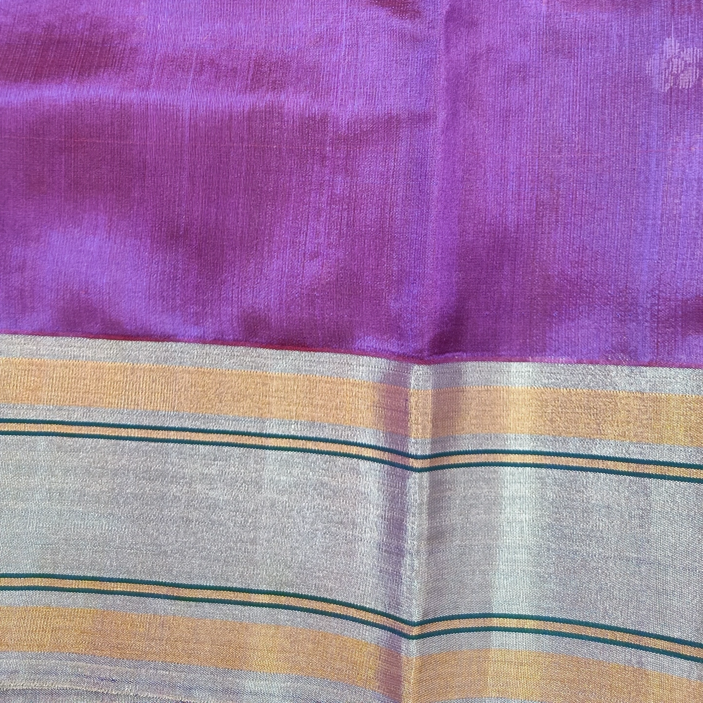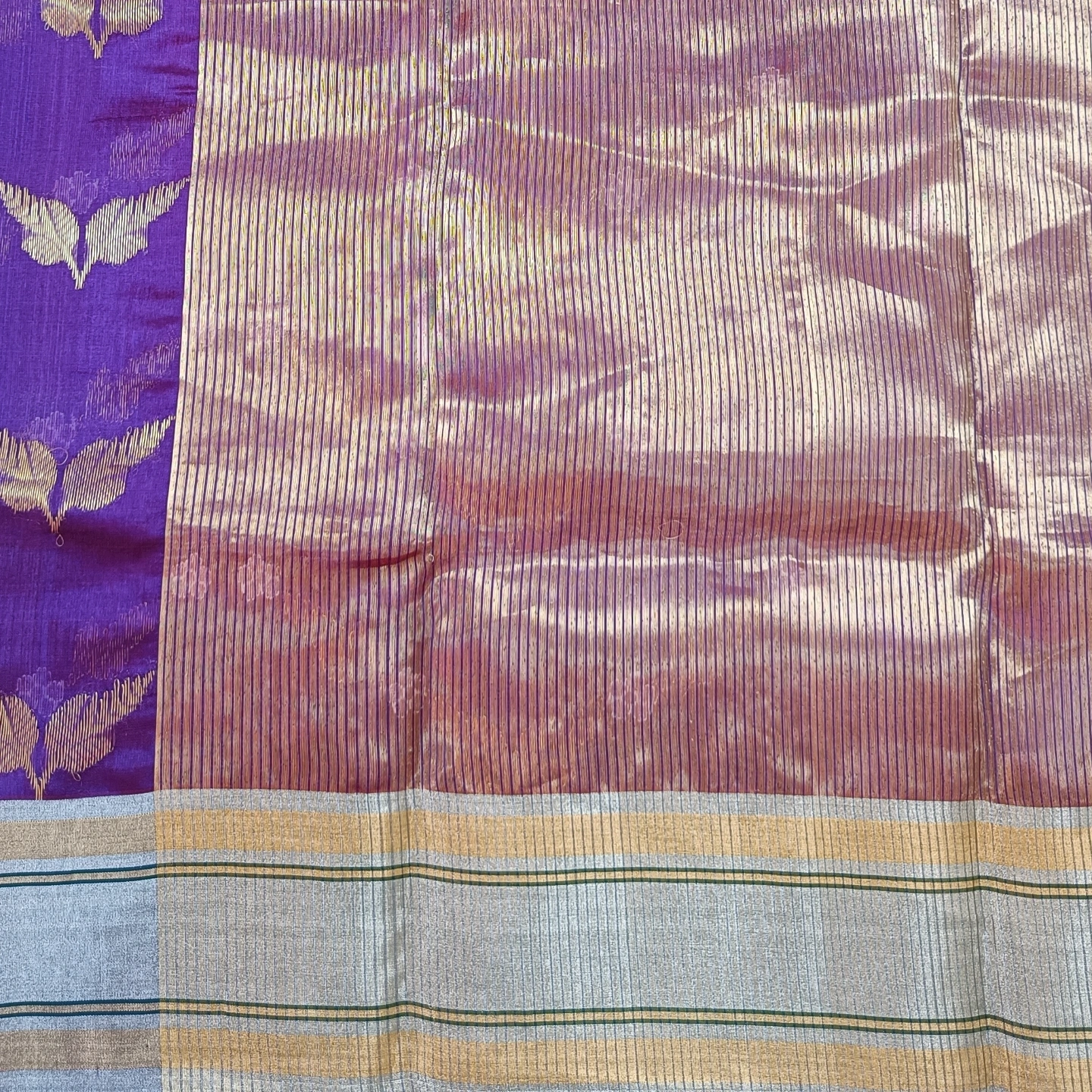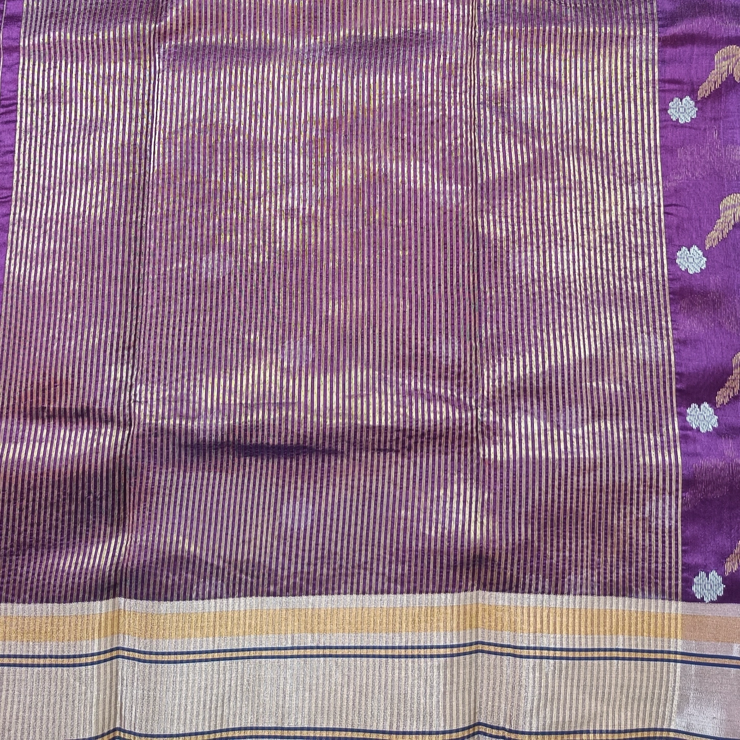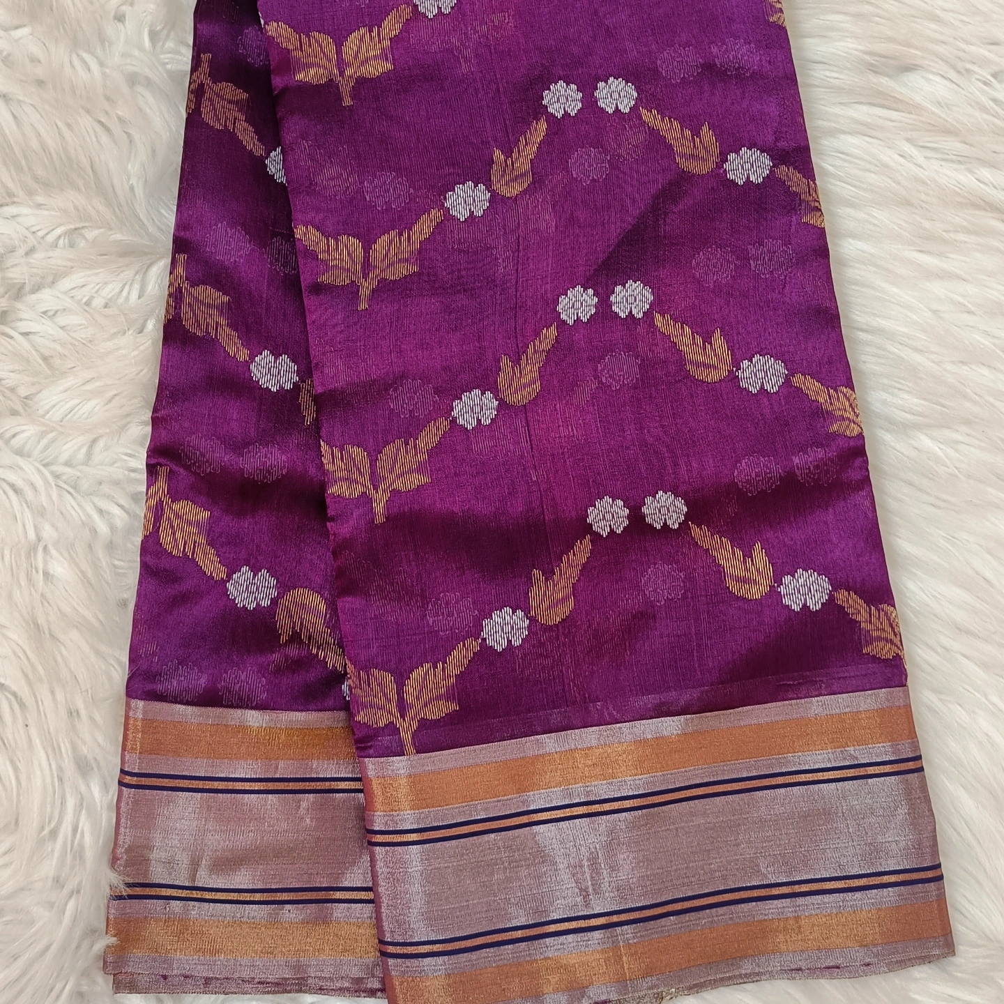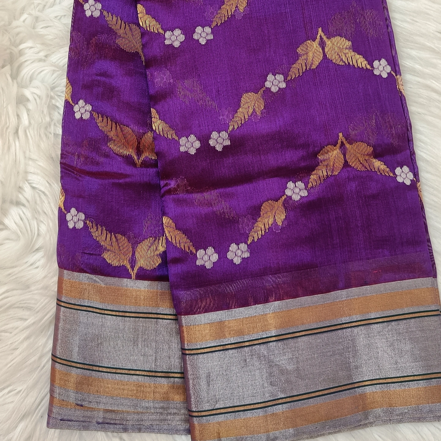 Exuding a regal charm, this Chanderi Pattu silk saree is draped in a rich shade of deep violet. The body is adorned with intricate wavy zari work, featuring elegant golden leaf patterns interspersed with delicate silver floral buttis that create a rhythmic, flowing design. A sophisticated metallic border completes the look, showcasing horizontal stripes in shimmering silver and copper-gold tones. Combining the lightweight grace of Chanderi with the lustrous sheen of silk, this saree is a timeless choice for weddings, festivals, and grand evening occasions.