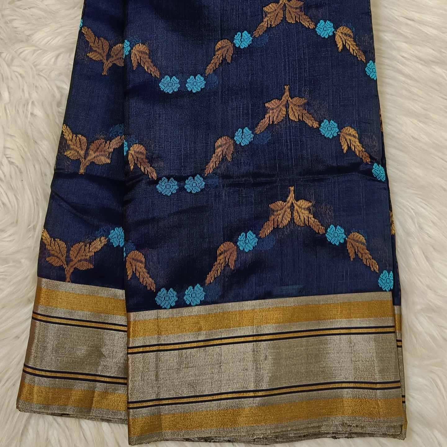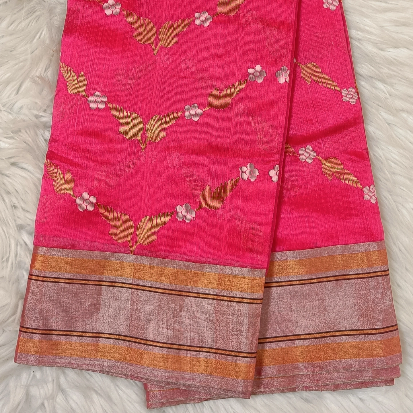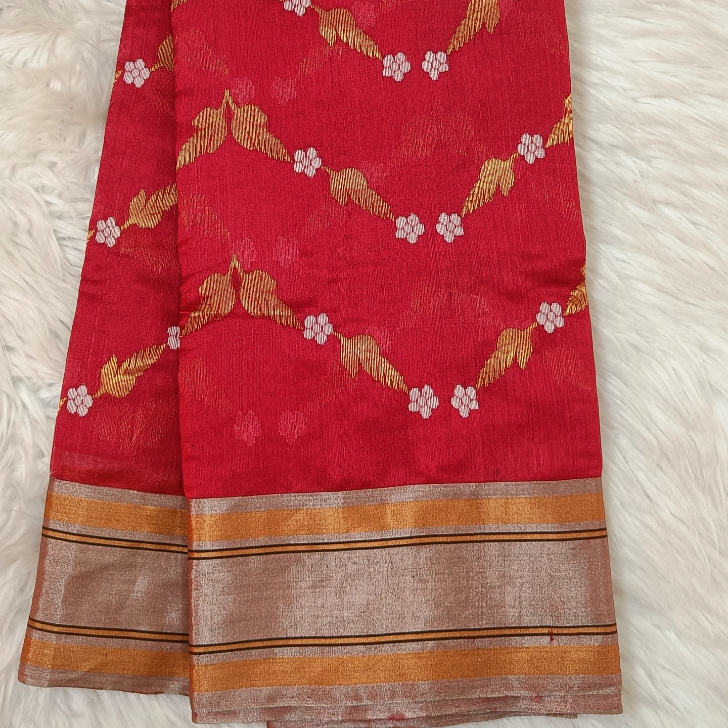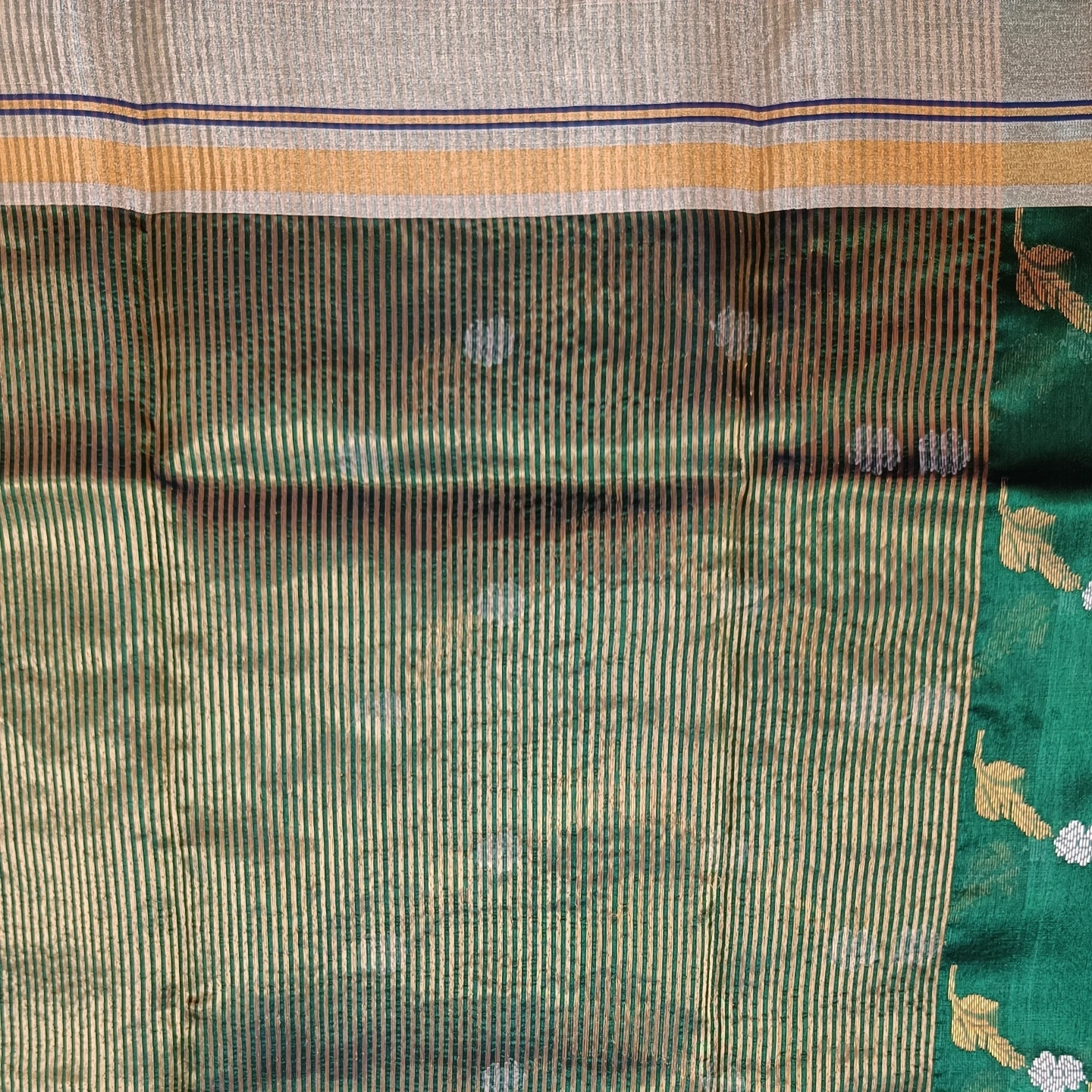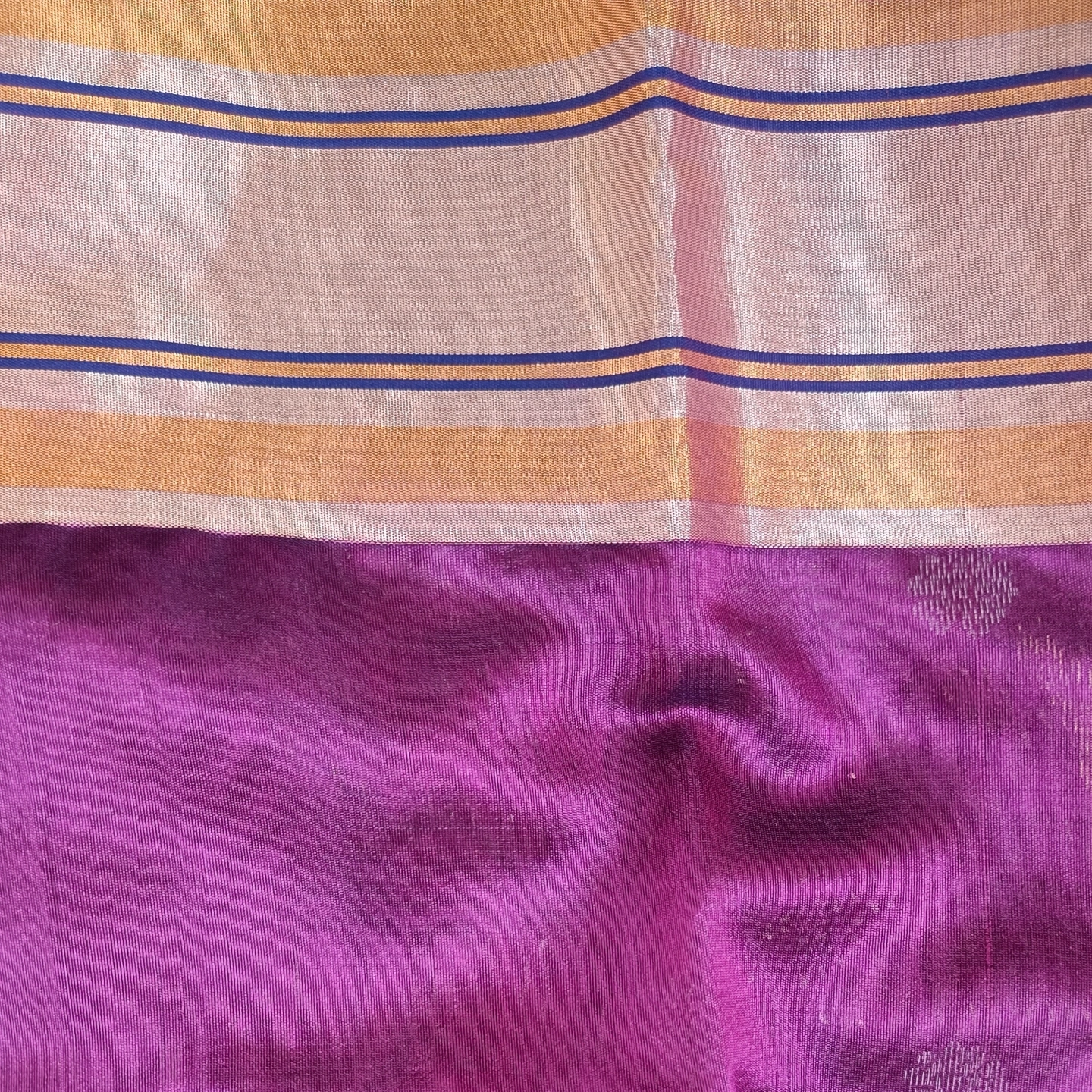 Exuding a regal charm, this Chanderi Pattu silk saree is draped in a rich shade of deep violet. The body is adorned with intricate wavy zari work, featuring elegant golden leaf patterns interspersed with delicate silver floral buttis that create a rhythmic, flowing design. A sophisticated metallic border completes the look, showcasing horizontal stripes in shimmering silver and copper-gold tones. Combining the lightweight grace of Chanderi with the lustrous sheen of silk, this saree is a timeless choice for weddings, festivals, and grand evening occasions.