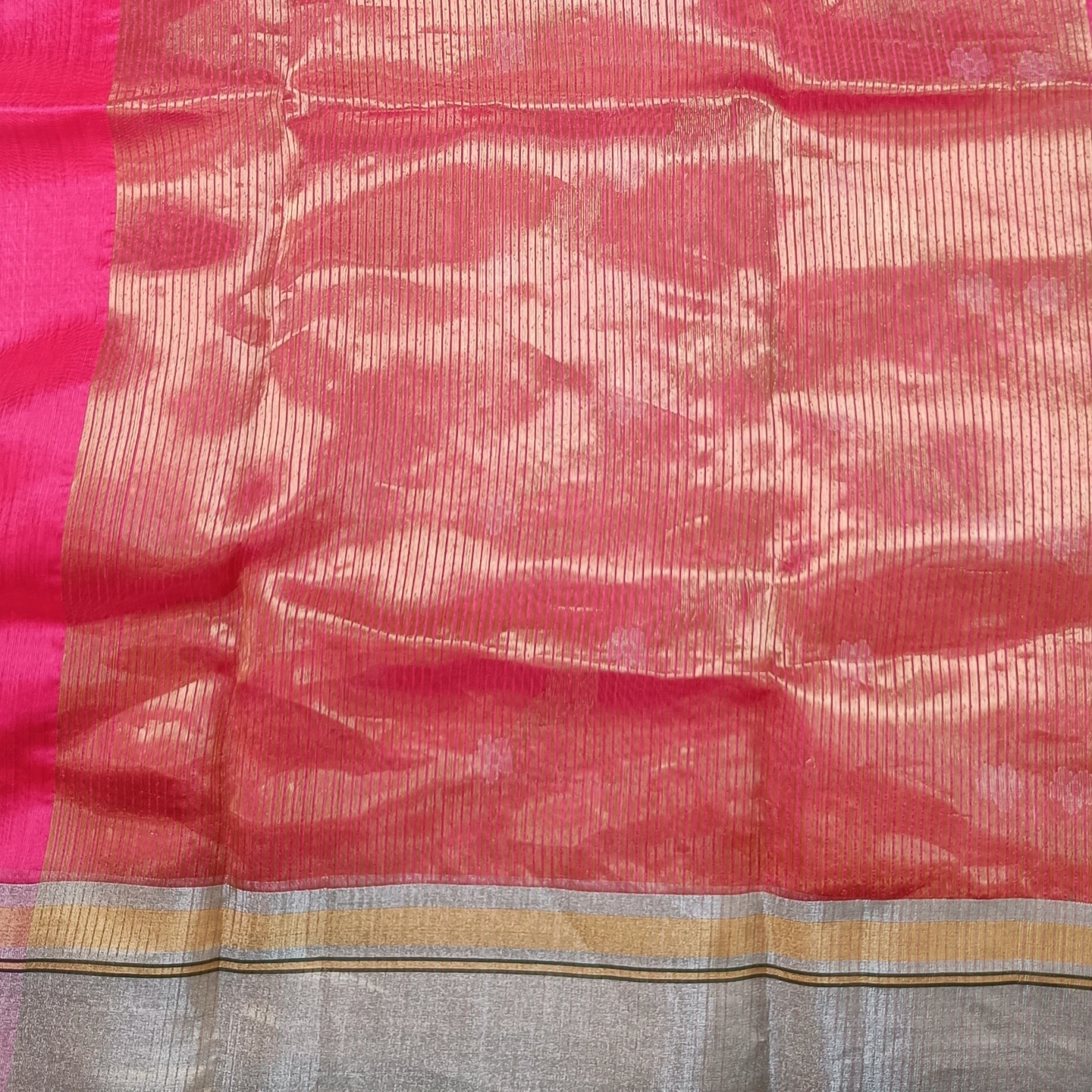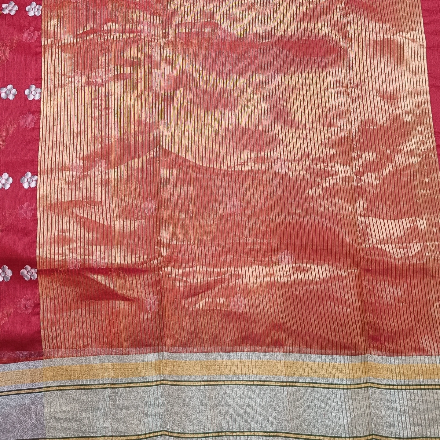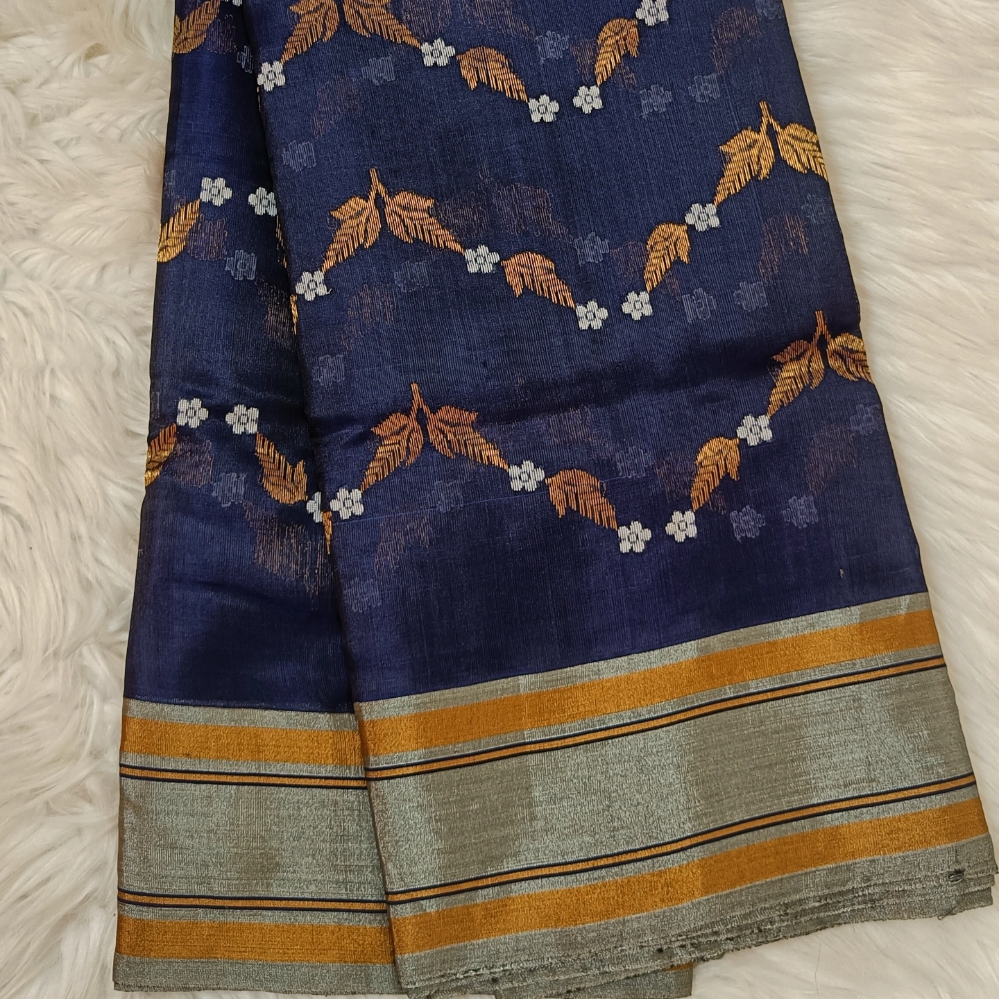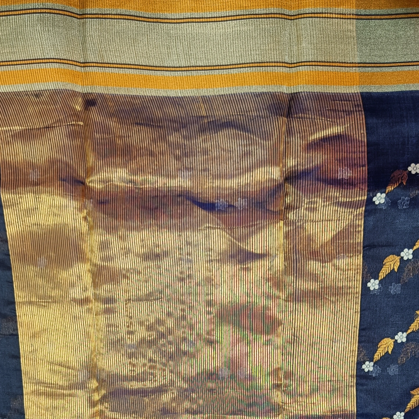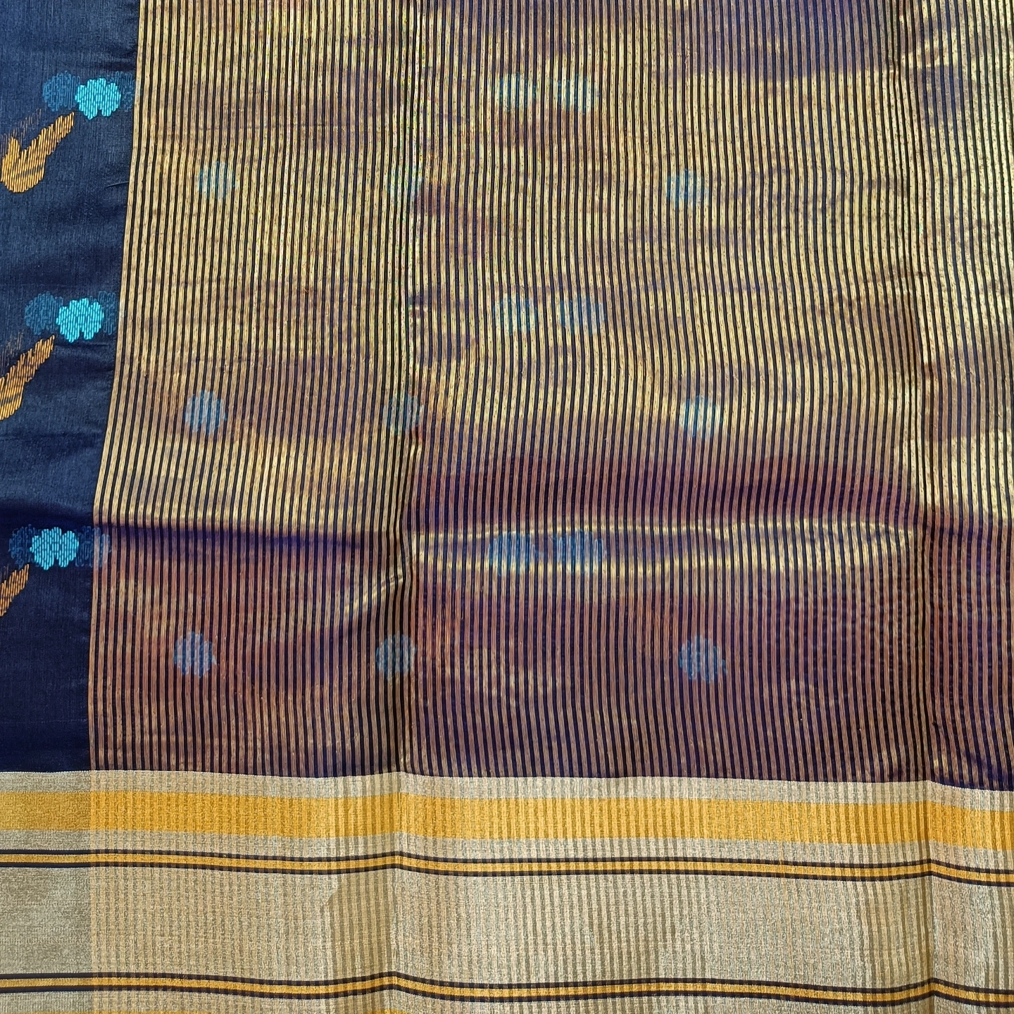 Exuding a regal charm, this Chanderi Pattu silk saree is draped in a rich shade of deep violet. The body is adorned with intricate wavy zari work, featuring elegant golden leaf patterns interspersed with delicate silver floral buttis that create a rhythmic, flowing design. A sophisticated metallic border completes the look, showcasing horizontal stripes in shimmering silver and copper-gold tones. Combining the lightweight grace of Chanderi with the lustrous sheen of silk, this saree is a timeless choice for weddings, festivals, and grand evening occasions.