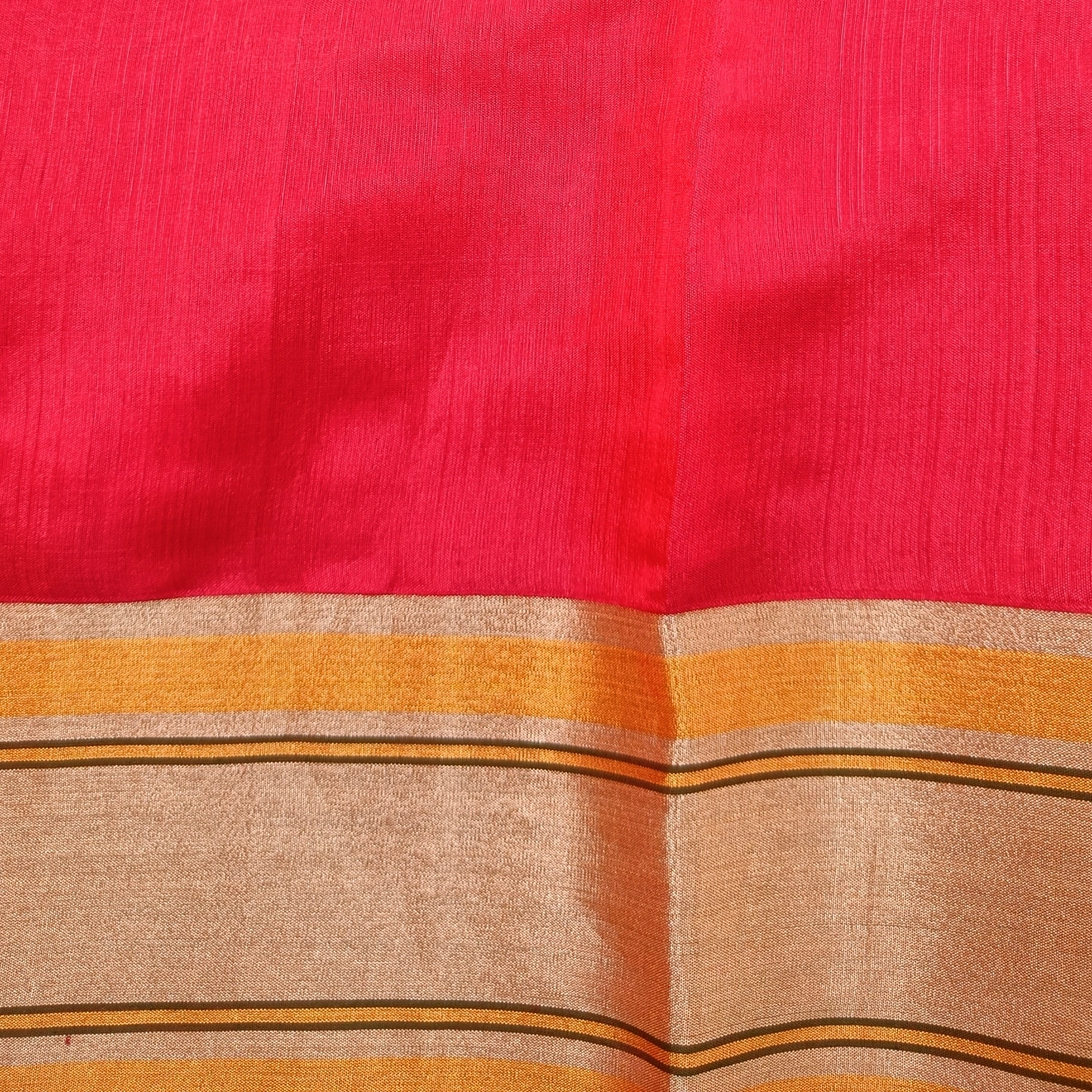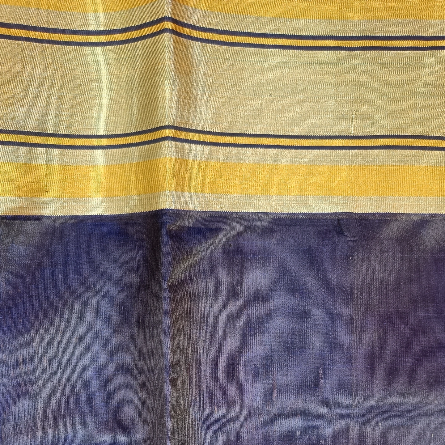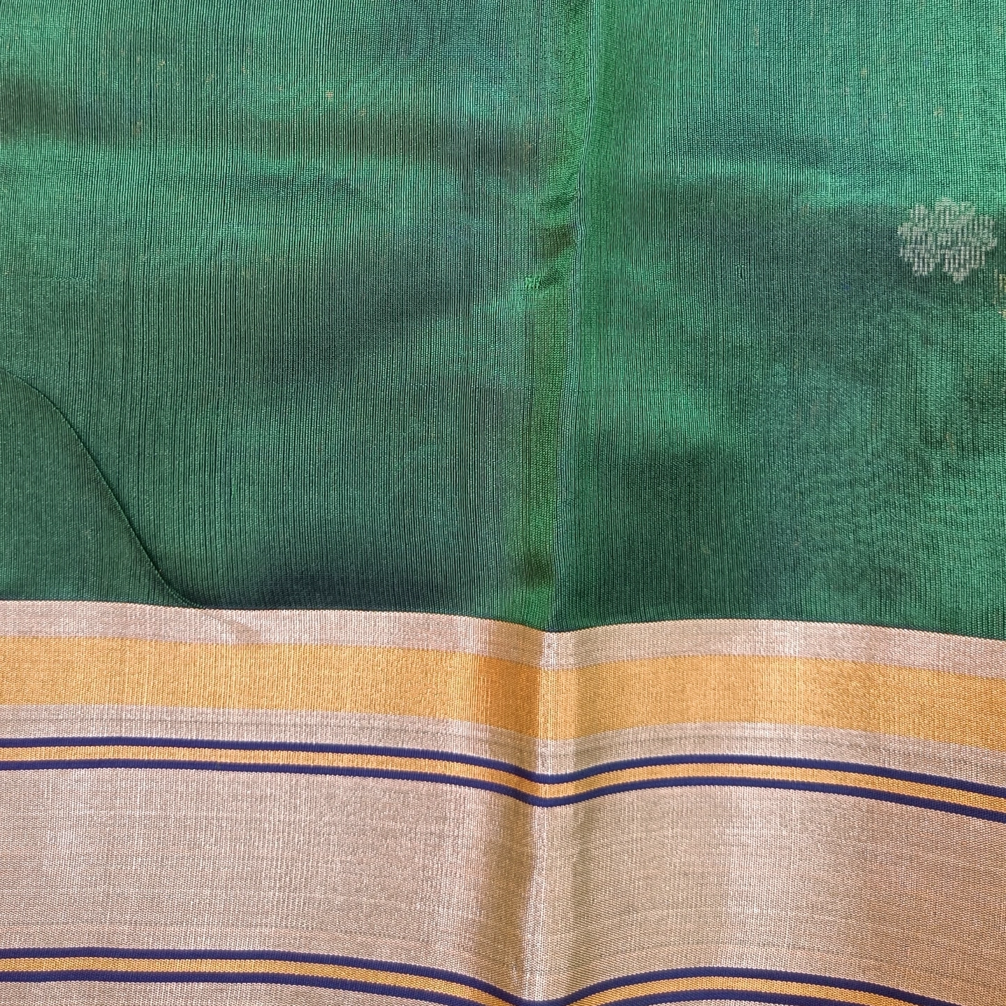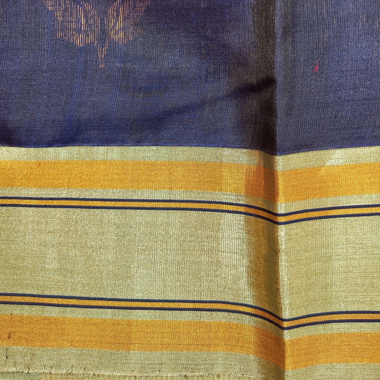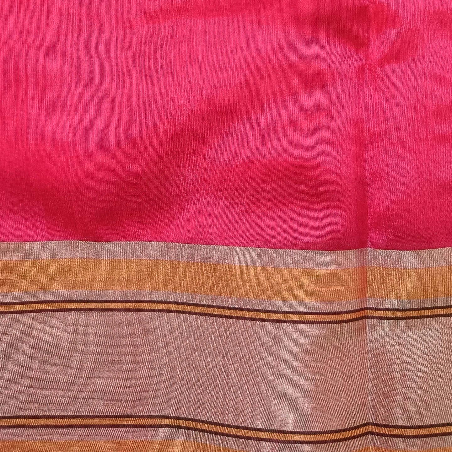 Exuding a regal charm, this Chanderi Pattu silk saree is draped in a rich shade of deep violet. The body is adorned with intricate wavy zari work, featuring elegant golden leaf patterns interspersed with delicate silver floral buttis that create a rhythmic, flowing design. A sophisticated metallic border completes the look, showcasing horizontal stripes in shimmering silver and copper-gold tones. Combining the lightweight grace of Chanderi with the lustrous sheen of silk, this saree is a timeless choice for weddings, festivals, and grand evening occasions.