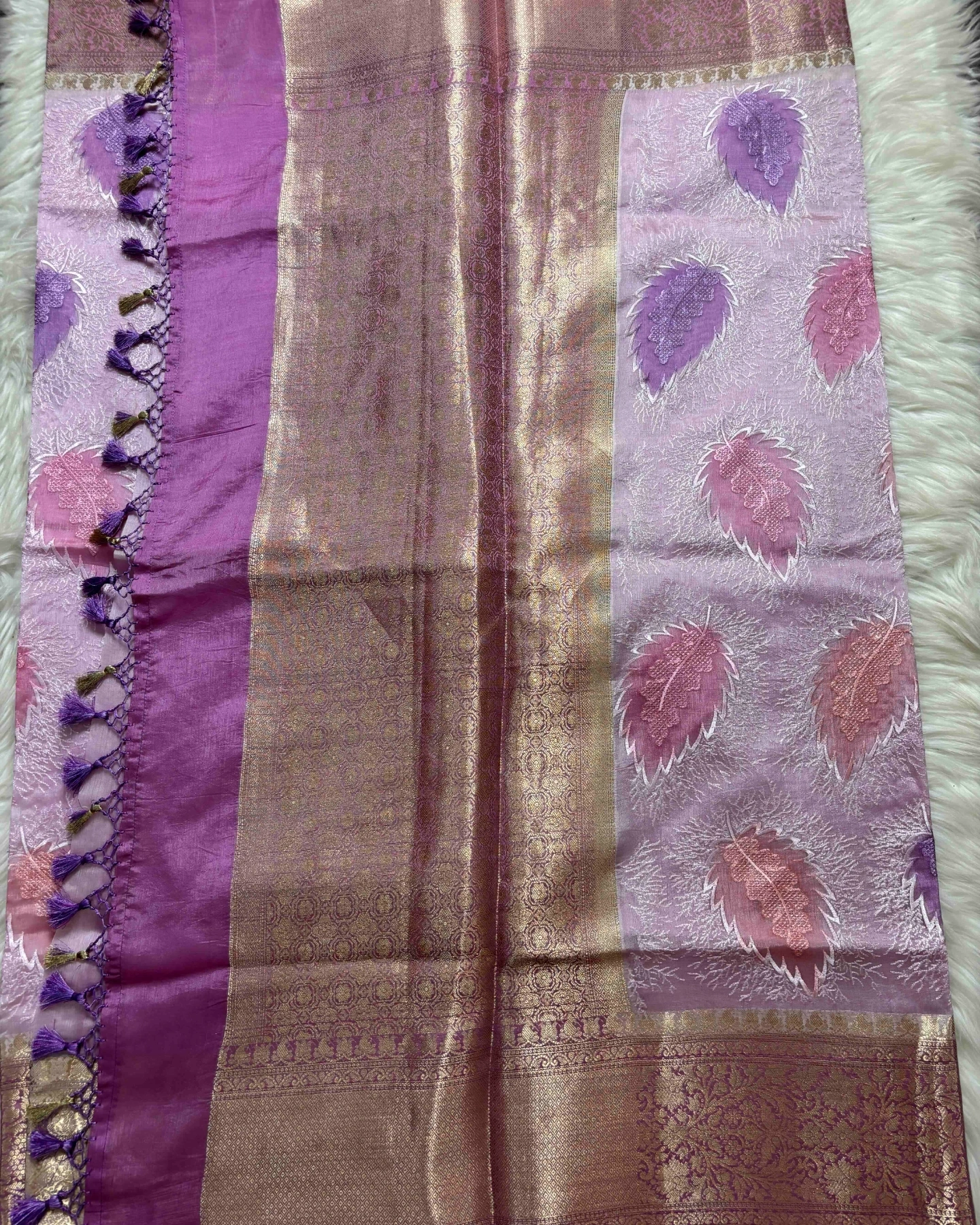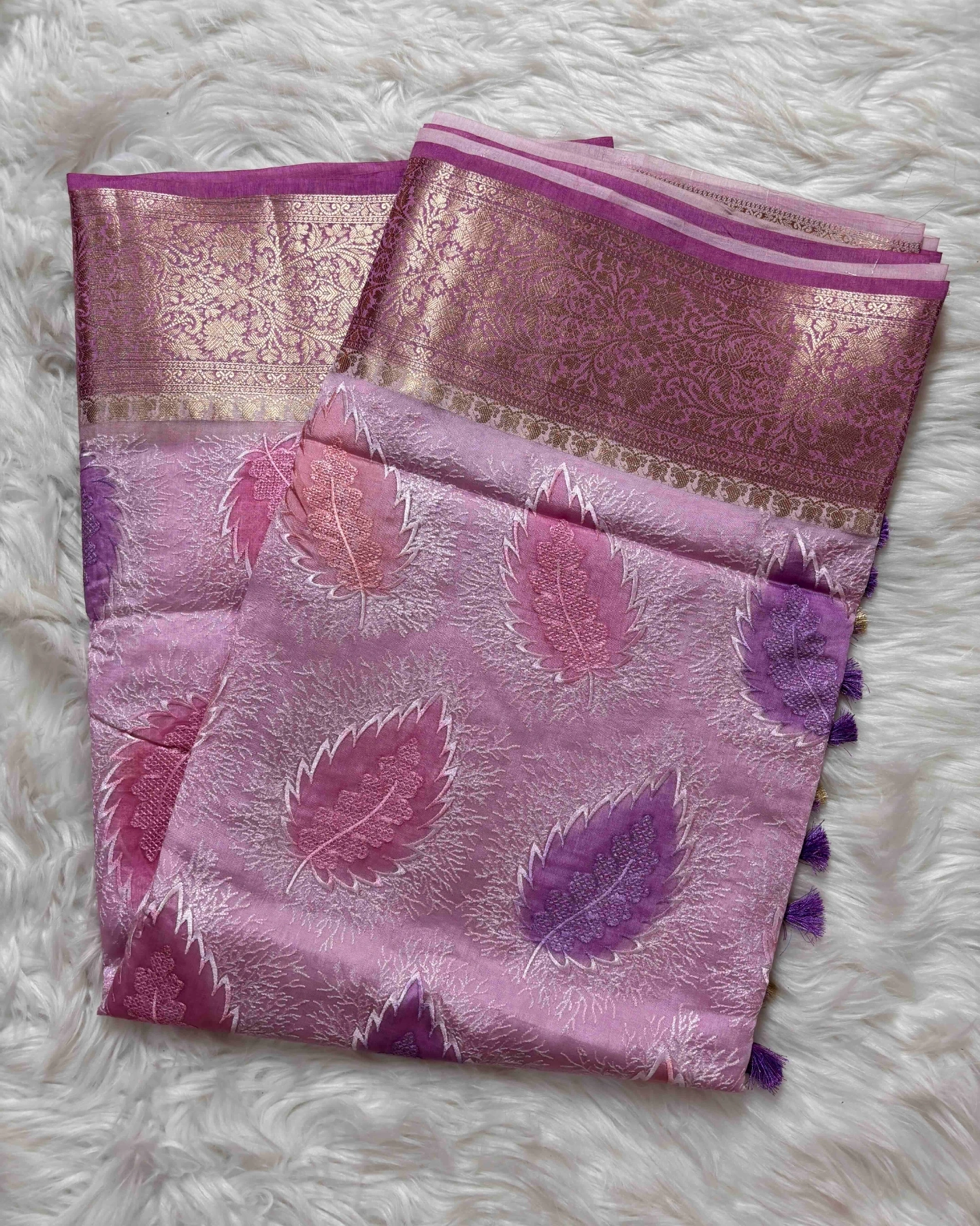 Woven in rich Green Mango silk, this saree showcases the beauty of Rangkat craftsmanship through its soft, blended tonal effect. The body is adorned with bold leaf-inspired motifs, intricately detailed to create depth and texture. The interplay of shading within the design adds a unique artistic dimension, while the opulent zari border brings in a touch of classic elegance. Finished with delicate tassels, this saree beautifully balances contemporary design with traditional richness—perfect for standout festive wear.