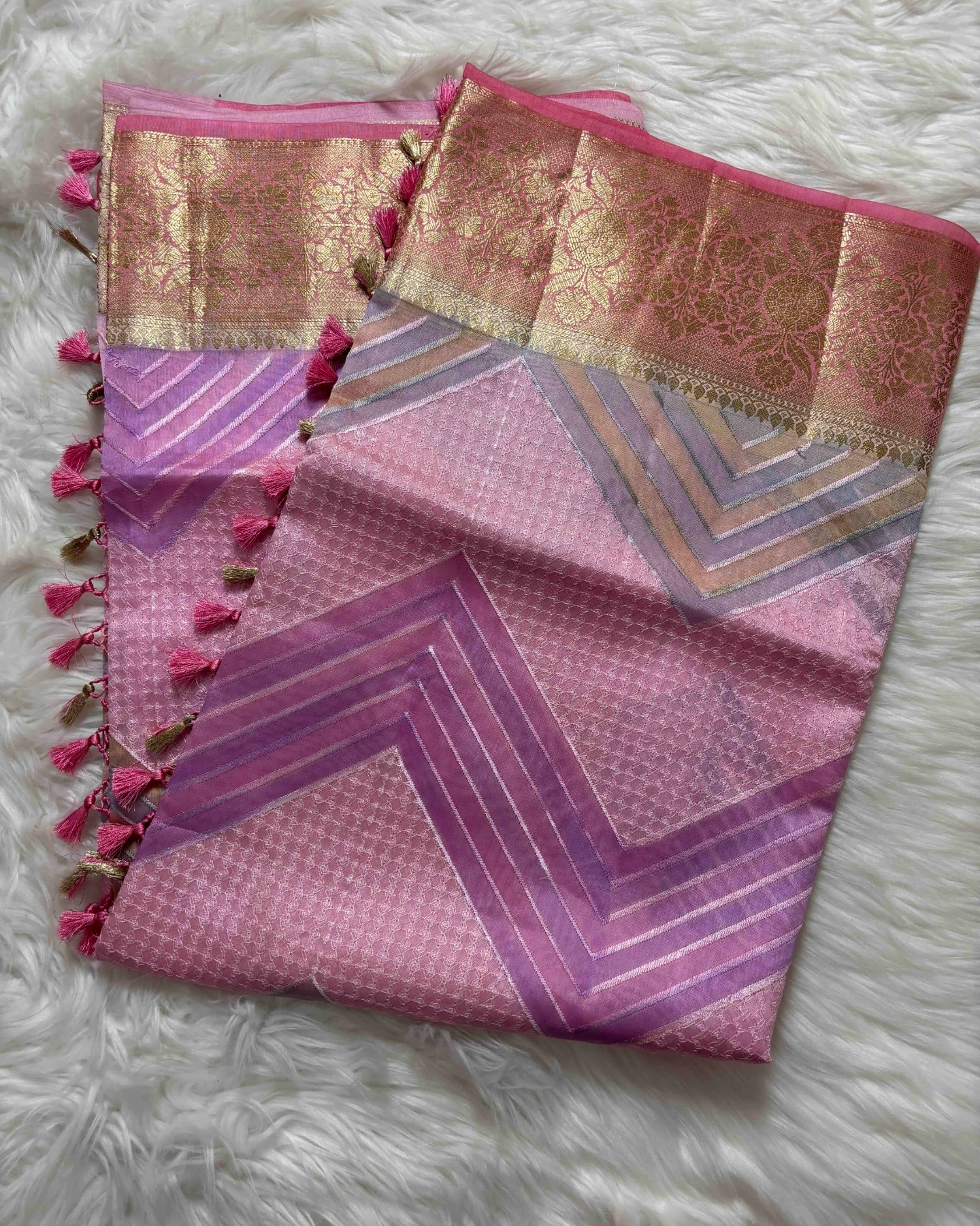 Crafted in luxurious Green Mango silk, this saree stands out with its striking Rangkat-style tonal play that flows seamlessly across the fabric. The body features a refined geometric chevron pattern, adding a modern edge to its traditional weave. The rich zari border enhances its grandeur with intricate detailing, while tassel accents on the pallu lend a graceful finish. A perfect fusion of structure and fluidity, this piece is ideal for making a subtle yet statement impression.