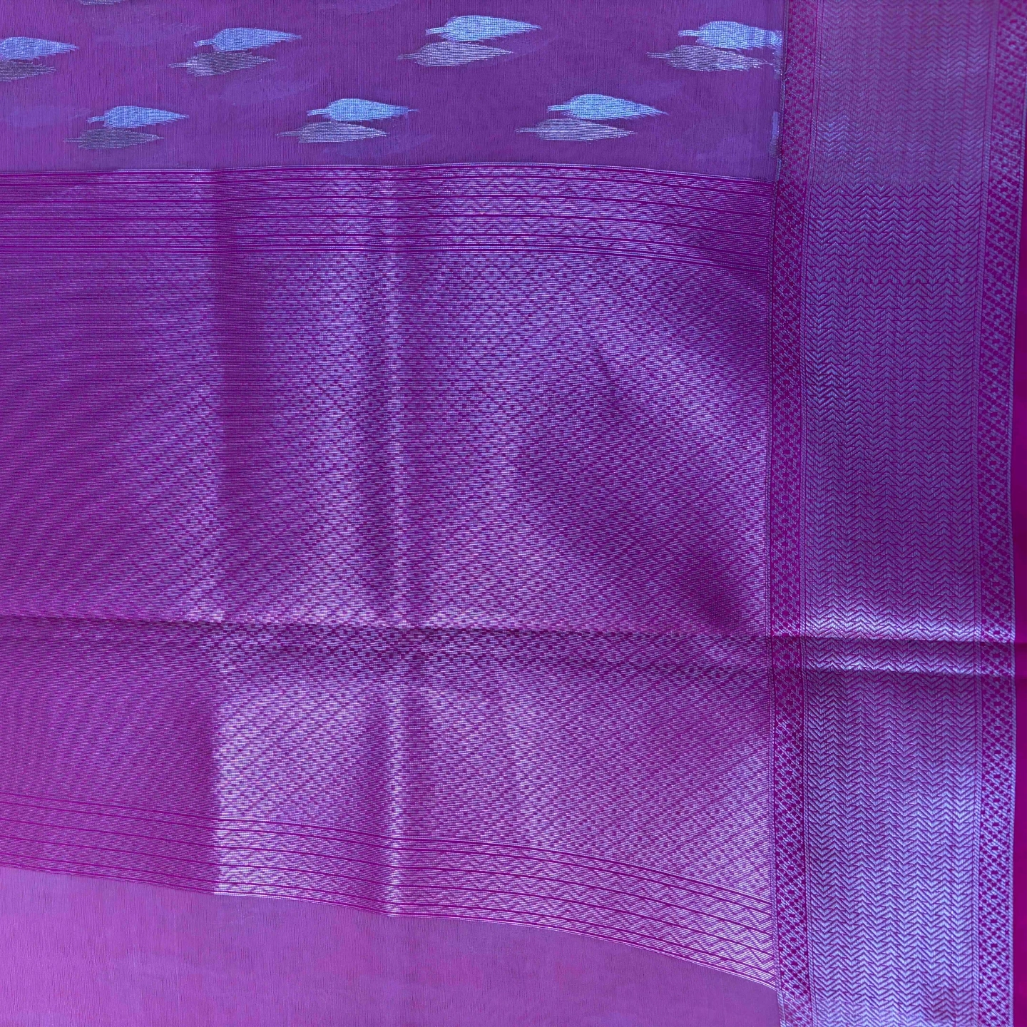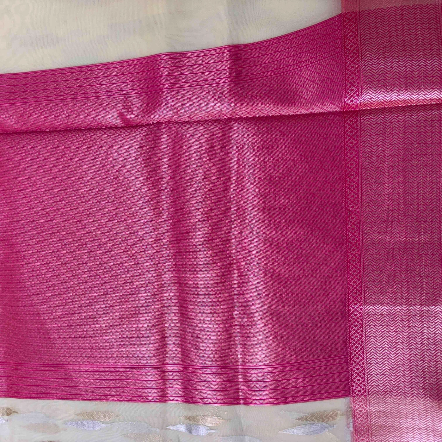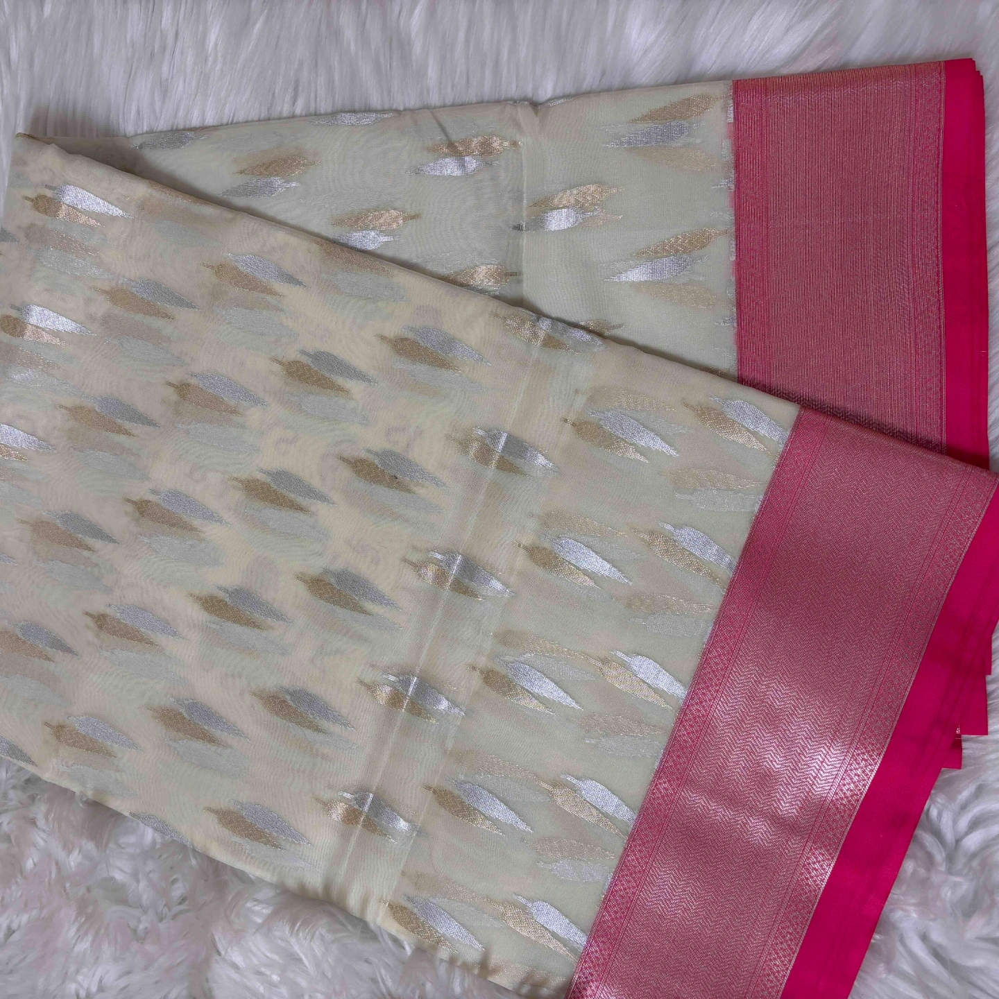Woven in lightweight powerloom organza, this saree features delicately scattered buti motifs that lend a refined and airy appeal. The sheer texture enhances its graceful fall, while the intricately woven border adds a touch of traditional richness. Elegant yet understated, it is perfect for those who appreciate subtle sophistication with a modern finish.