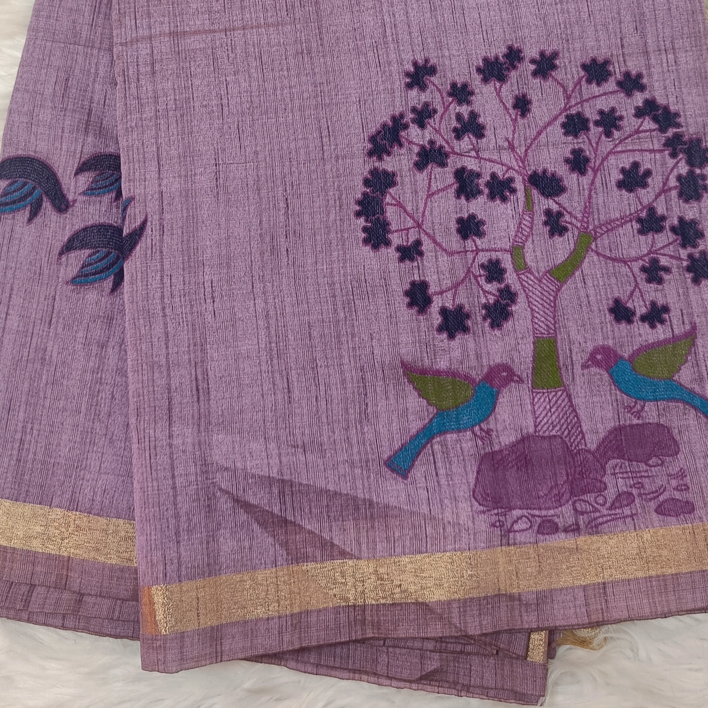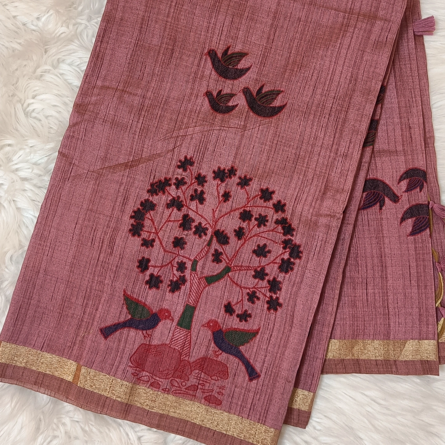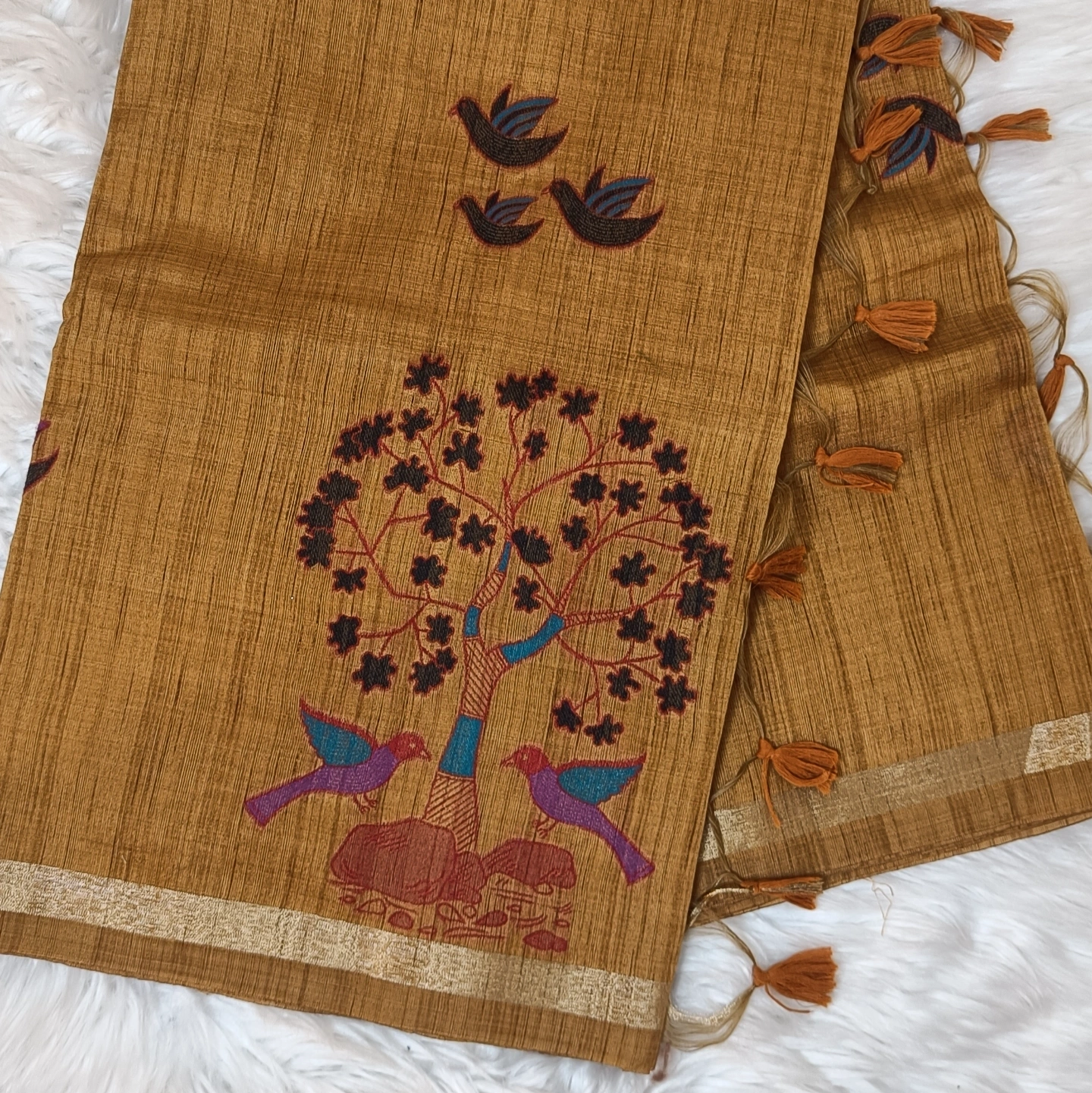 Crafted in pure cotton, this saree showcases a beautifully textured weave that feels light, breathable, and effortlessly graceful. The highlight is its charming bird and tree motif—delicately woven with artistic detailing, symbolizing harmony with nature. Accented with subtle tassels along the pallu and a minimal border, it carries a rustic elegance that’s perfect for everyday wear as well as understated festive styling.