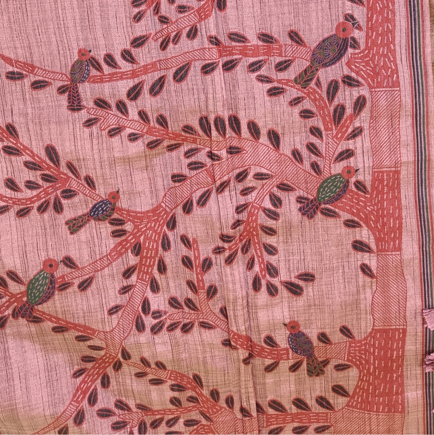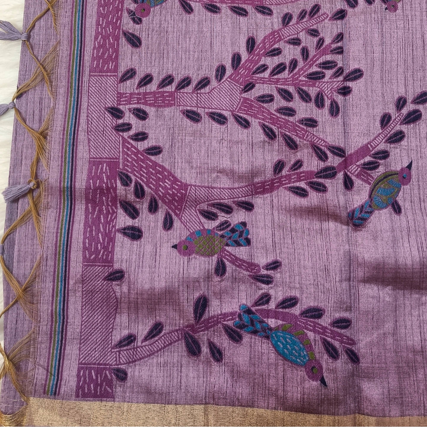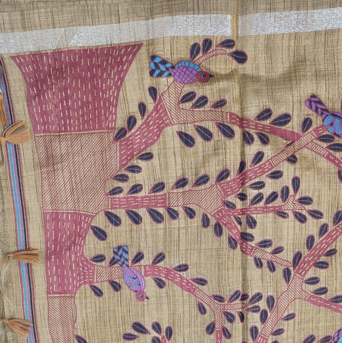 Crafted in pure cotton, this saree showcases a beautifully textured weave that feels light, breathable, and effortlessly graceful. The highlight is its charming bird and tree motif—delicately woven with artistic detailing, symbolizing harmony with nature. Accented with subtle tassels along the pallu and a minimal border, it carries a rustic elegance that’s perfect for everyday wear as well as understated festive styling.