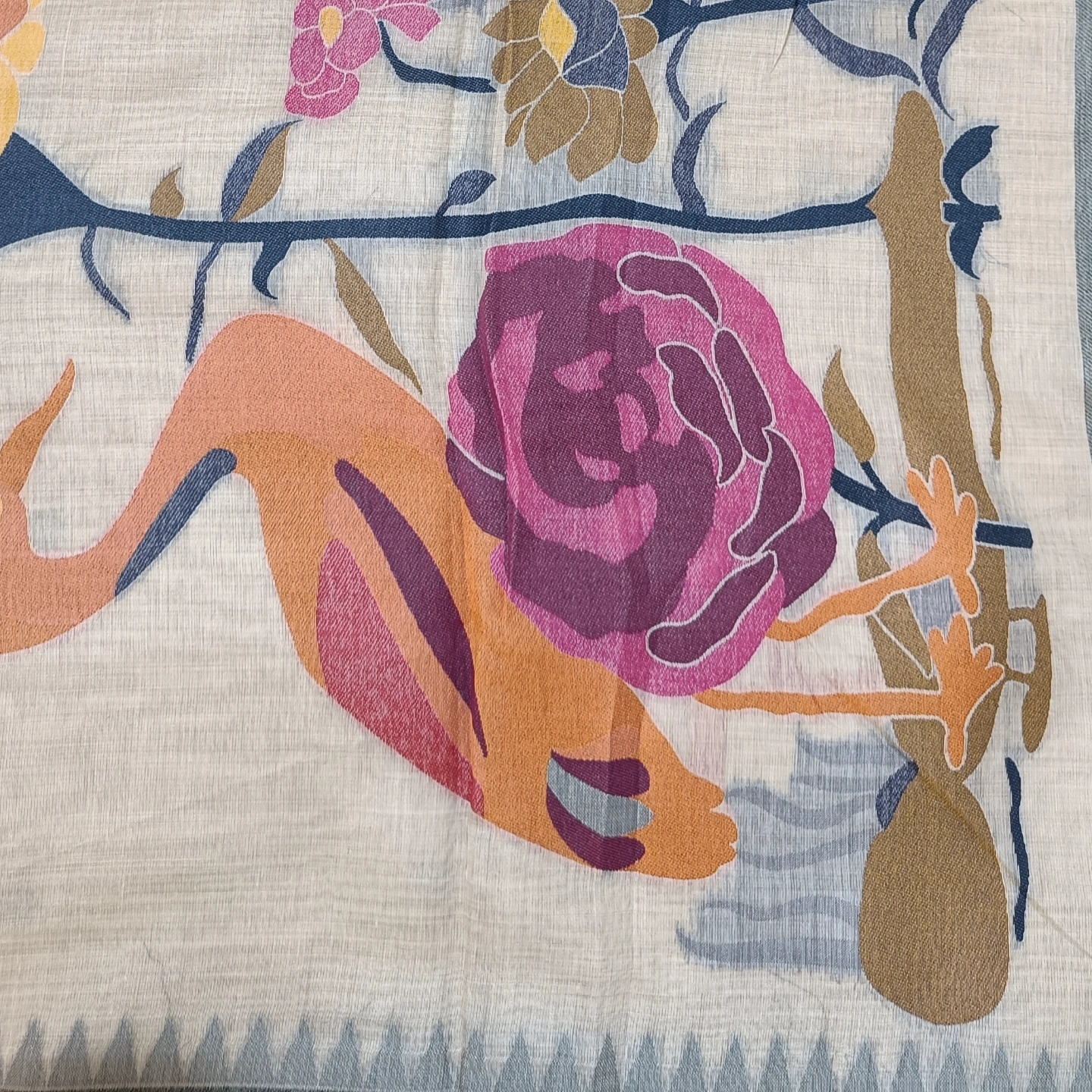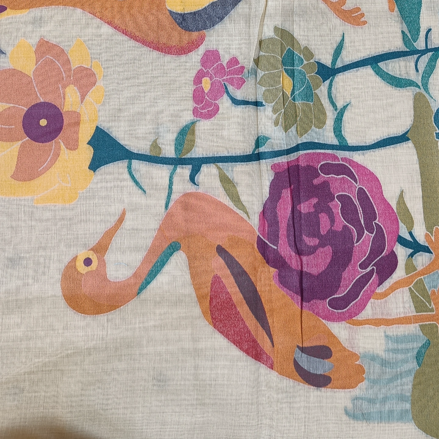 This saree is crafted from high-quality Pure Cotton, offering a breathable, lightweight texture that is ideal for comfort and all-day wear. The fabric serves as a crisp canvas for an expansive digital print, featuring oversized, artistic floral and botanical illustrations that lean toward a modern, painterly aesthetic. Unlike traditional woven motifs, these large-scale graphics provide a bold, contemporary look while maintaining the soft, matte finish characteristic of natural cotton fibers. The edges are finished with a subtle, contrasting geometric pattern, resulting in a versatile piece that merges the simplicity of organic textiles with a vibrant, illustrative design.