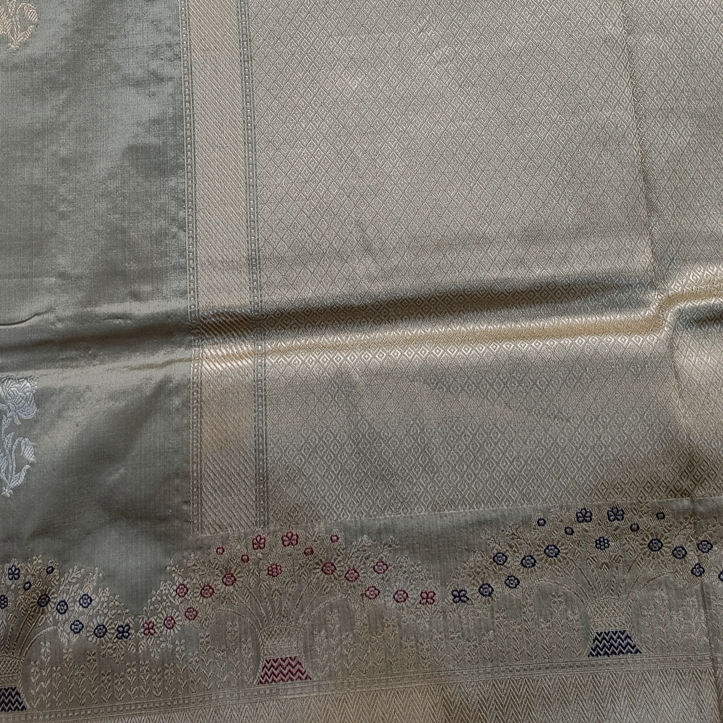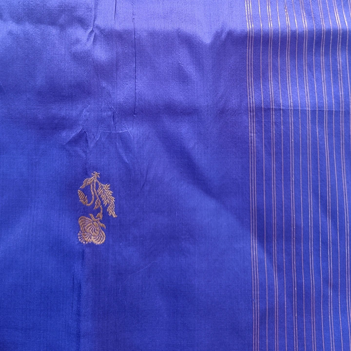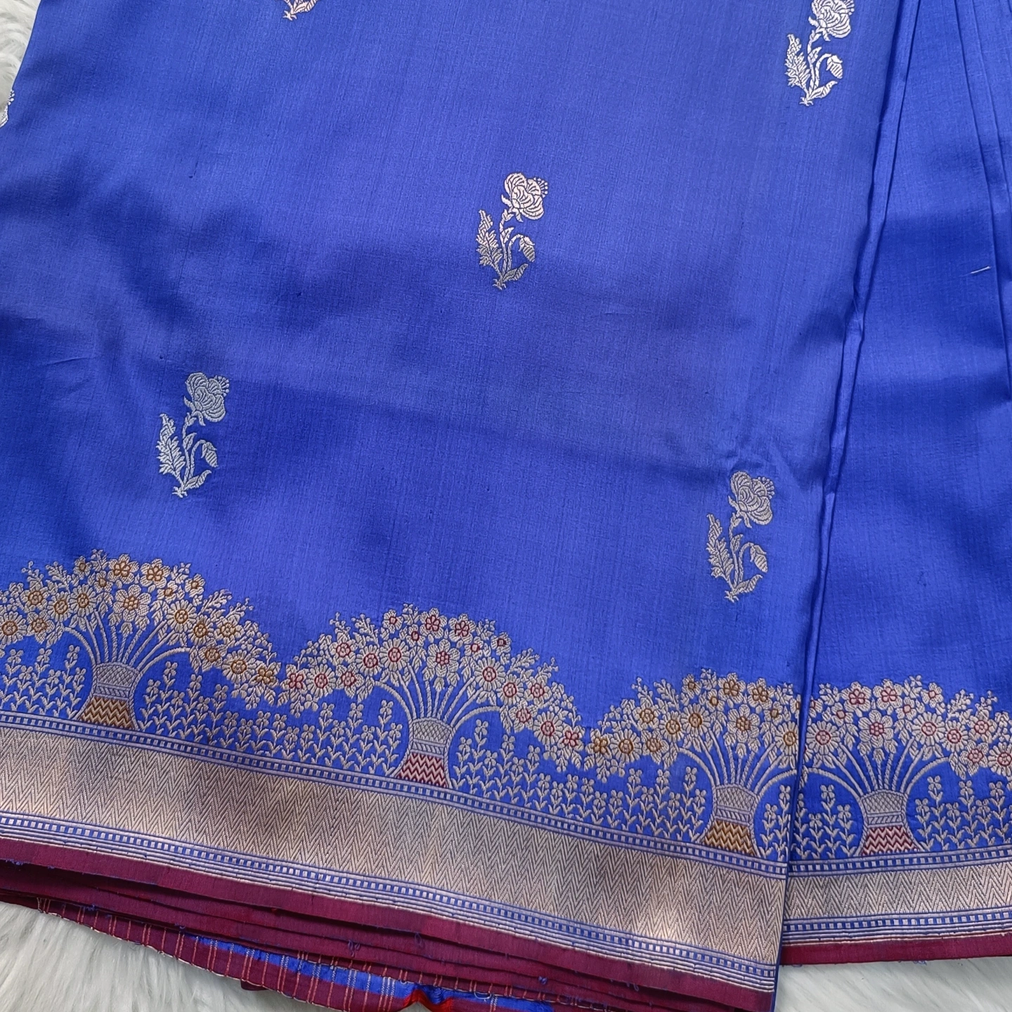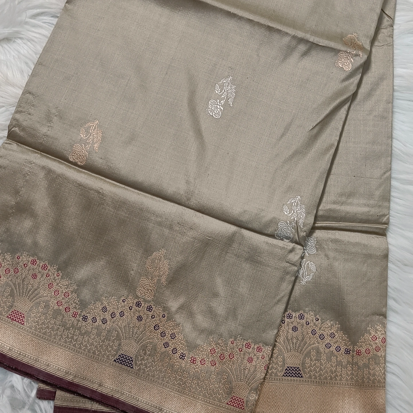 Woven in pure Katan silk, this saree features a smooth, lustrous texture with a graceful, structured drape. The body is adorned with finely placed buta motifs that lend a touch of understated elegance. Its minimal yet refined design highlights the richness of the weave, making it a timeless piece perfect for both intimate gatherings and classic occasions.