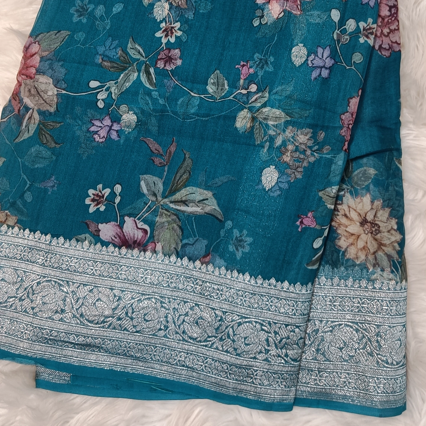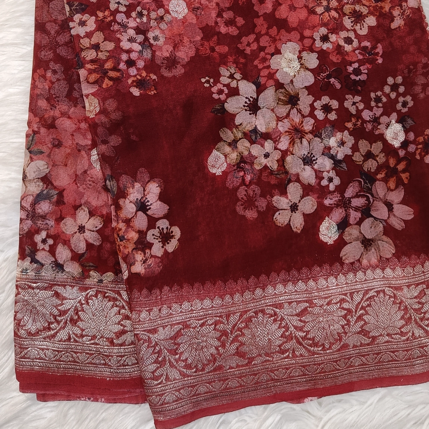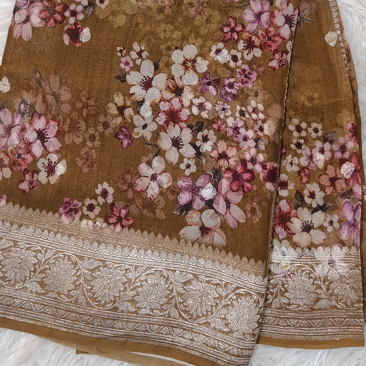 This is a Pure Khaddi Chiffon Digital Print Saree, a contemporary masterpiece that harmonizes modern printing technology with traditional weaving. The saree is crafted from premium Khaddi chiffon, a fabric celebrated for its sheer, lightweight texture and soft, mossy feel that drapes with effortless grace. The body features a vibrant Digital Floral Print, showcasing a dense garden of cherry blossoms and botanical clusters. This high-definition printing method allows for a sophisticated layering of tones and delicate shading, creating a romantic, painterly effect across the translucent fabric.