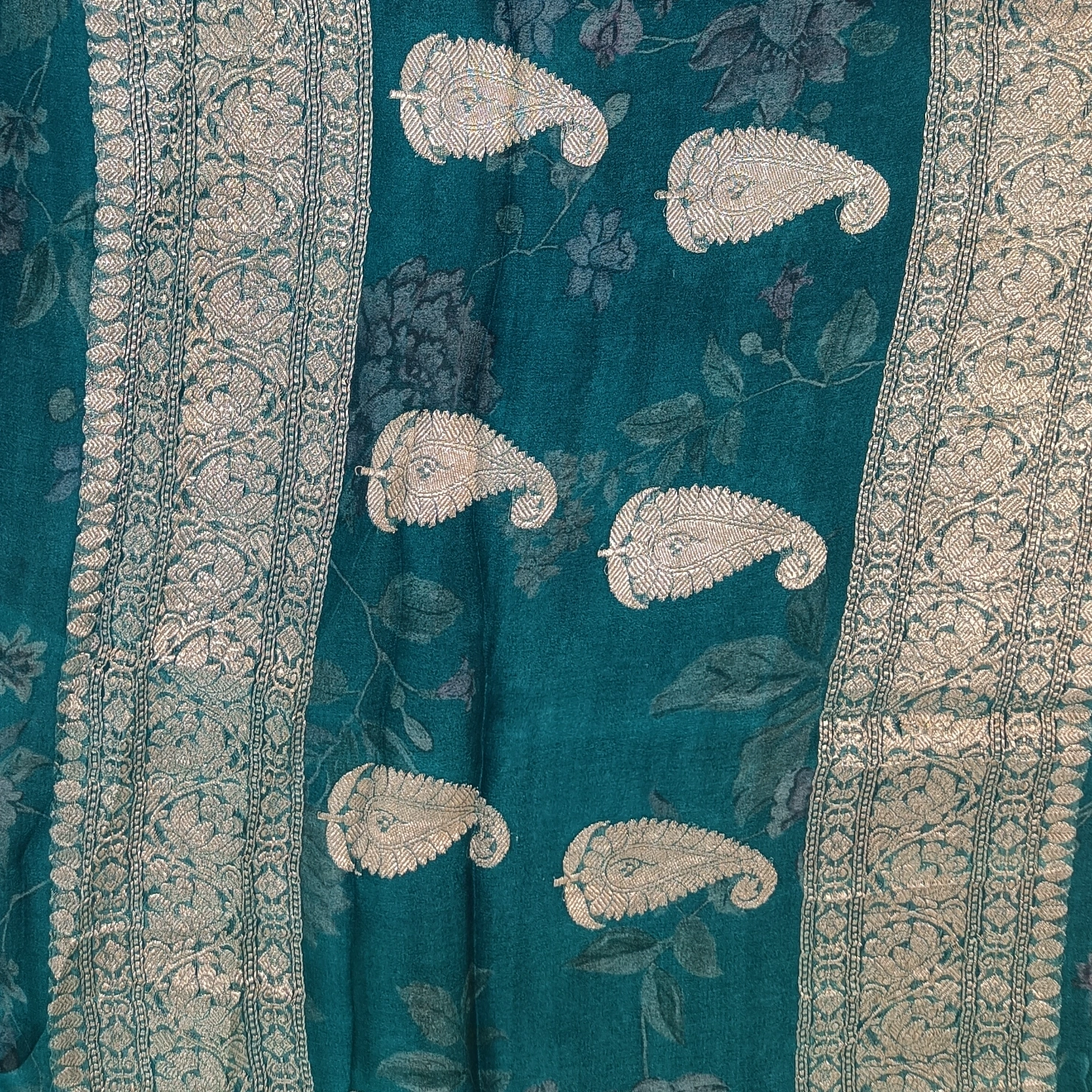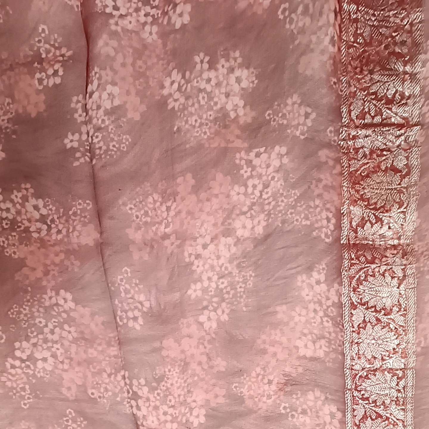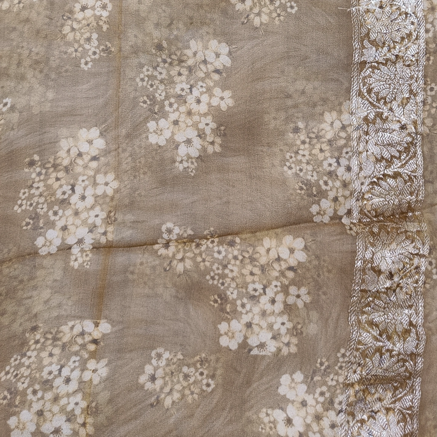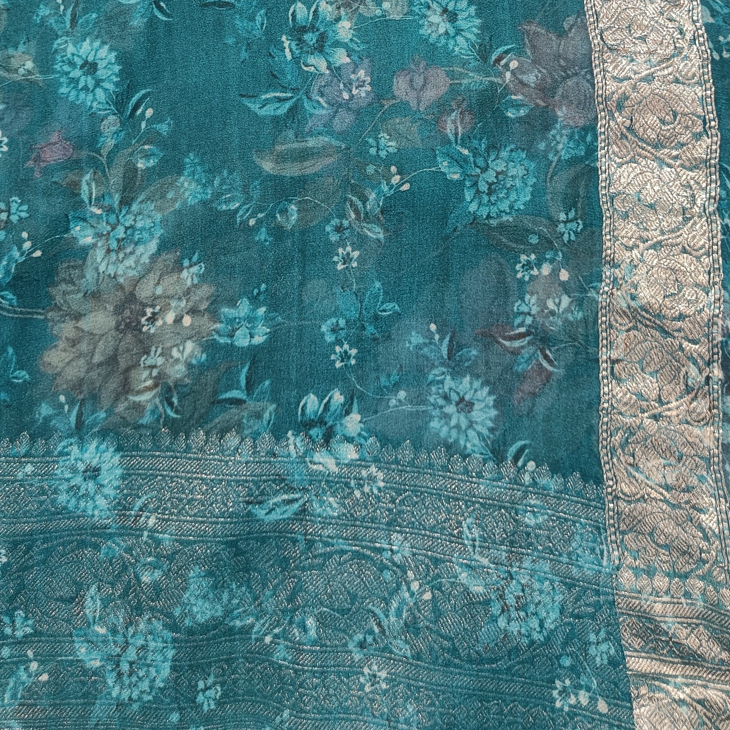 This is a Pure Khaddi Chiffon Digital Print Saree, a contemporary masterpiece that harmonizes modern printing technology with traditional weaving. The saree is crafted from premium Khaddi chiffon, a fabric celebrated for its sheer, lightweight texture and soft, mossy feel that drapes with effortless grace. The body features a vibrant Digital Floral Print, showcasing a dense garden of cherry blossoms and botanical clusters. This high-definition printing method allows for a sophisticated layering of tones and delicate shading, creating a romantic, painterly effect across the translucent fabric.