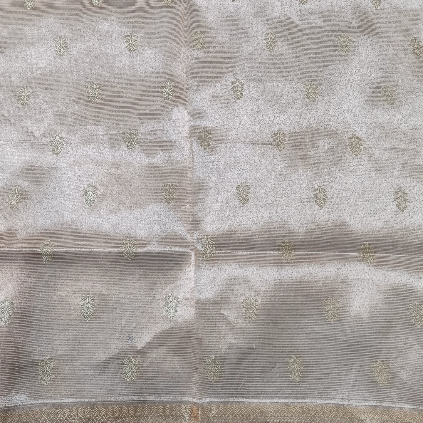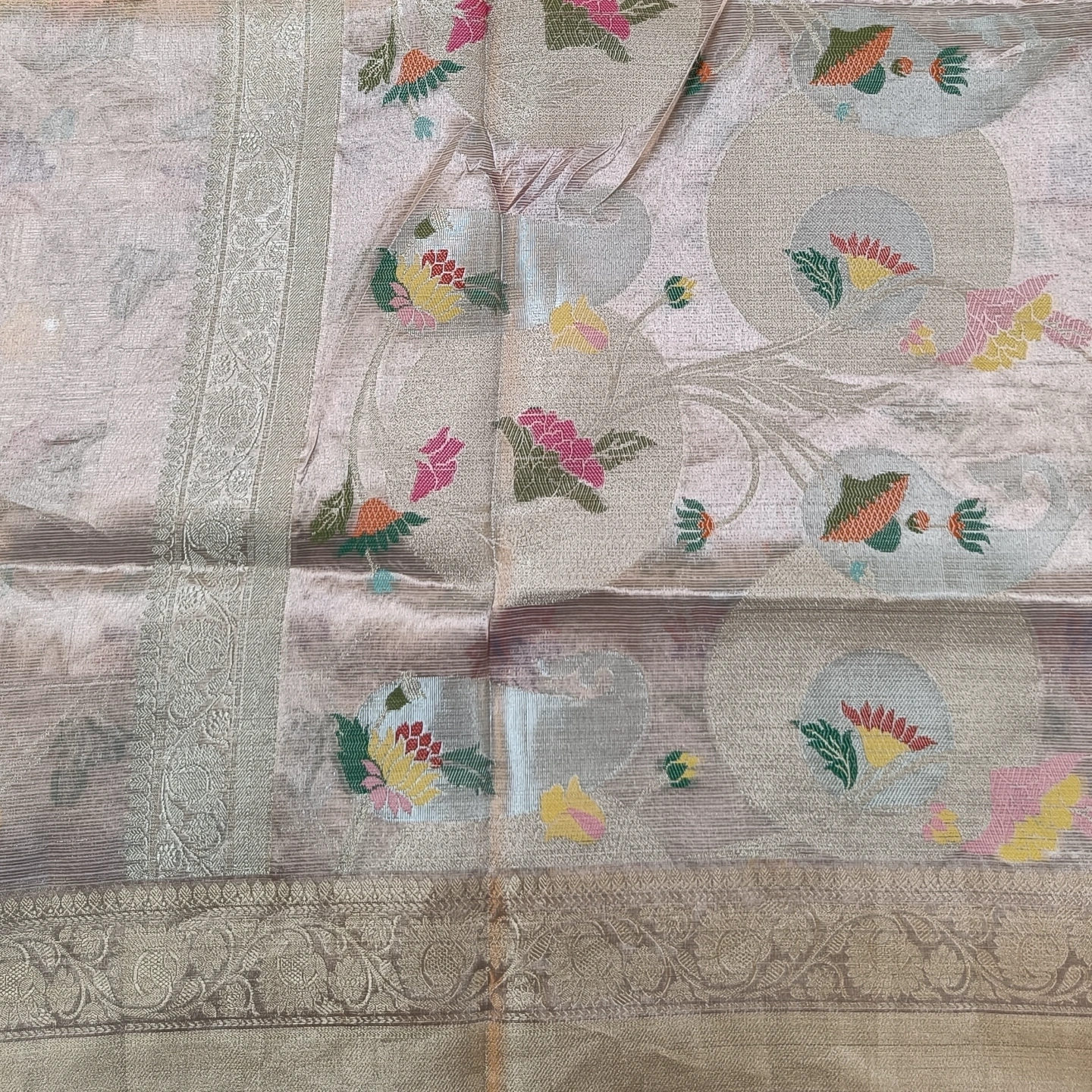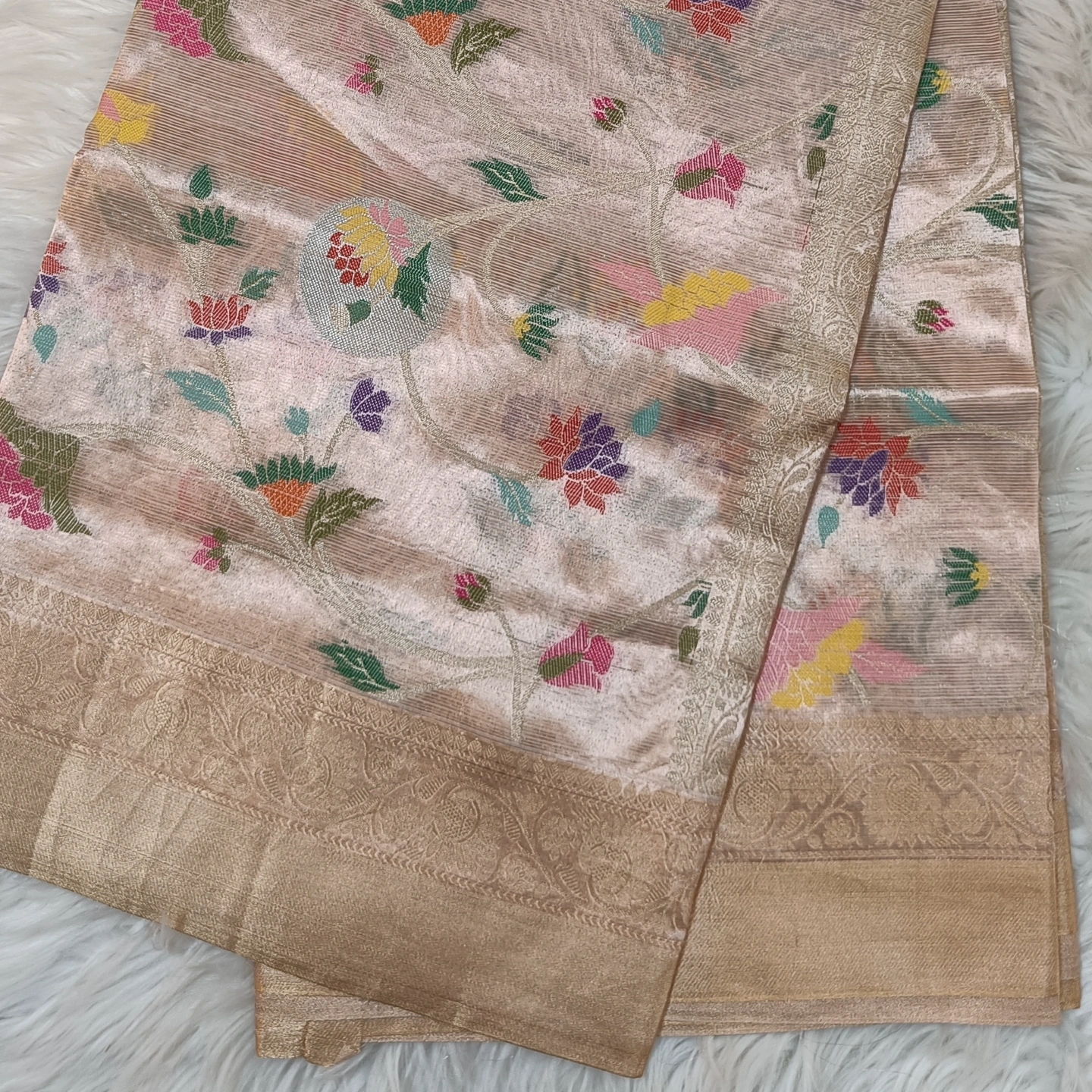 This is a Pure Zari Kota Tissue Saree, a magnificent example of artisanal weaving that combines a high-sheen metallic base with vibrant, detailed ornamentation. The saree is crafted from a premium tissue fabric, which integrates fine metallic threads into the weave to create a lustrous, light-reflective surface that appears both ethereal and structured. The signature Kota texture provides a subtle gridded appearance, ensuring the garment remains lightweight and breathable despite its rich, metallic finish.